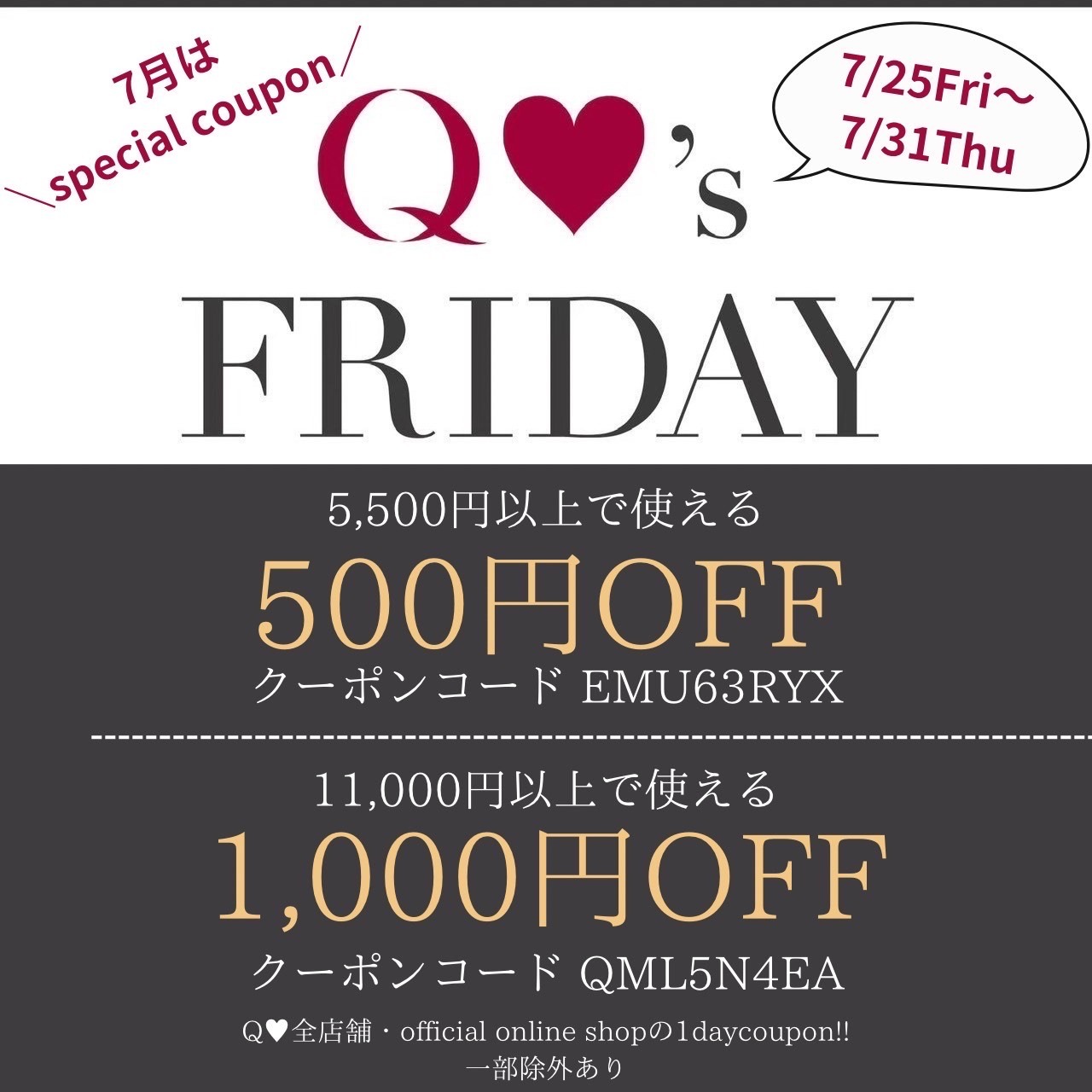 今月のQ’sFRIDAYは7月31日まで使えるSpecialクーポン!!