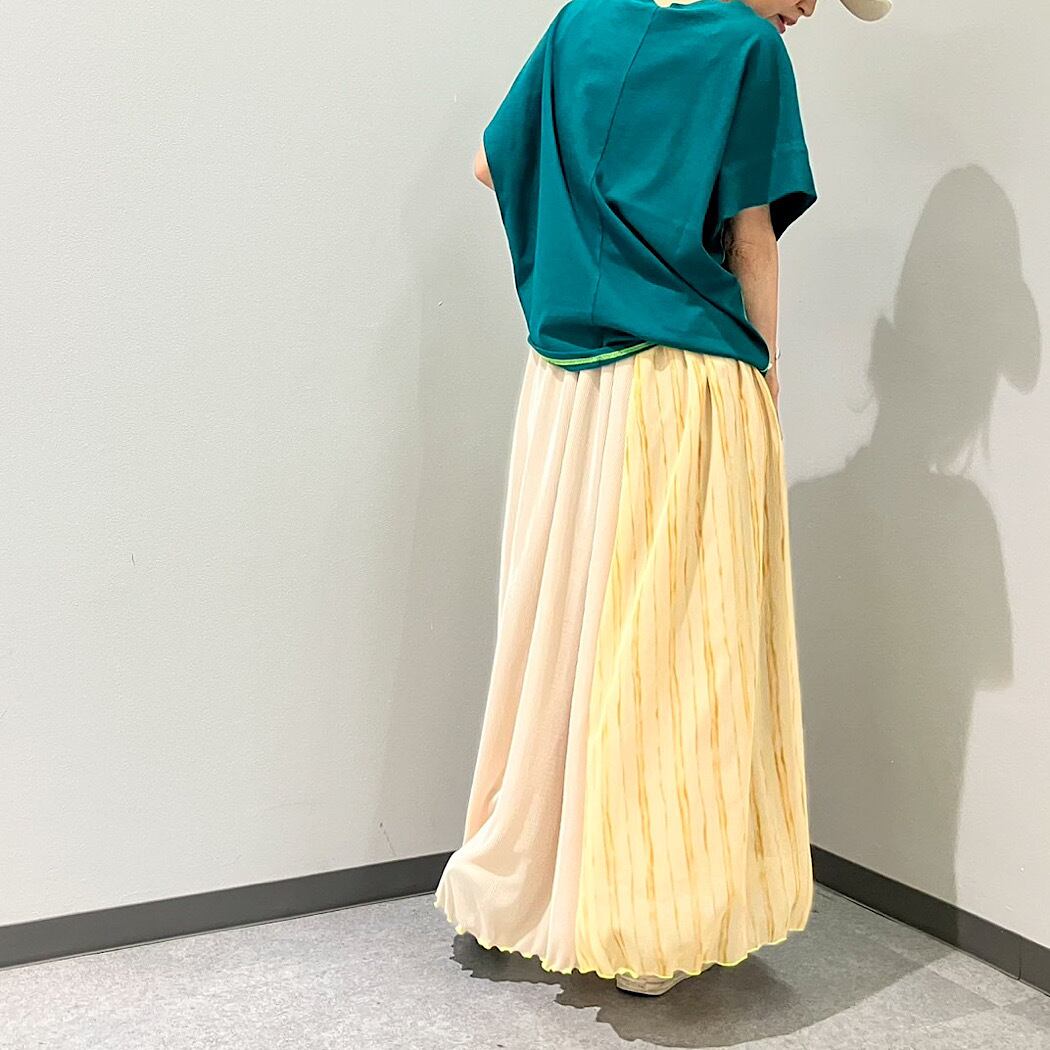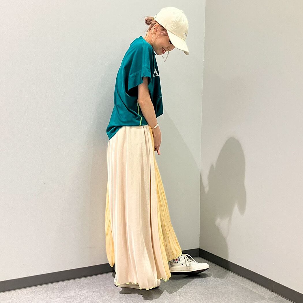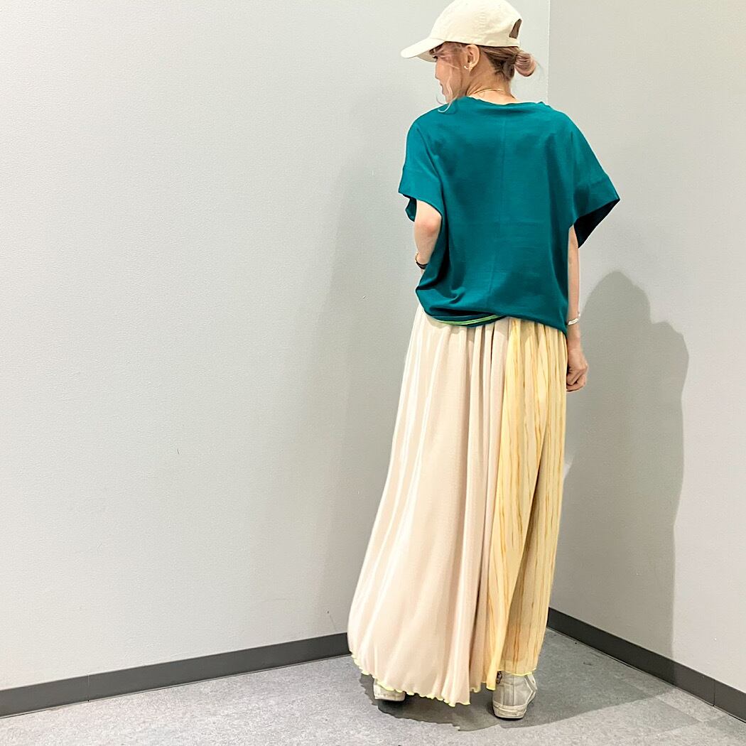 綿100%でお取り扱いもしやすいTシャツですが、シルエットで女性らしく魅せてくれる一着です。