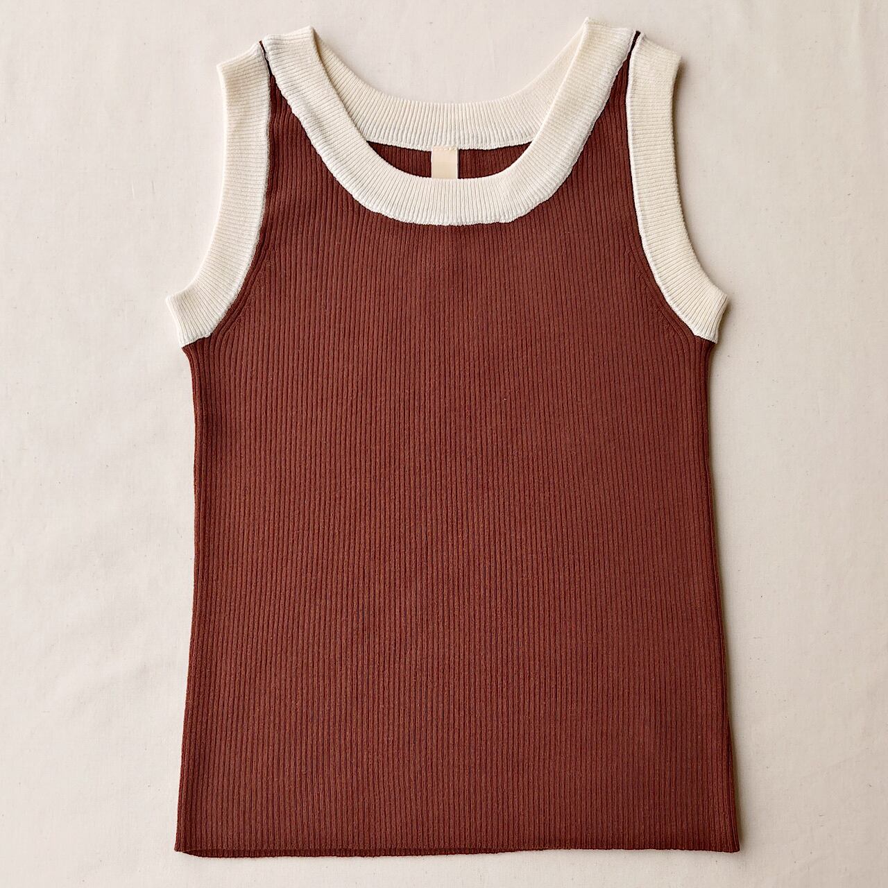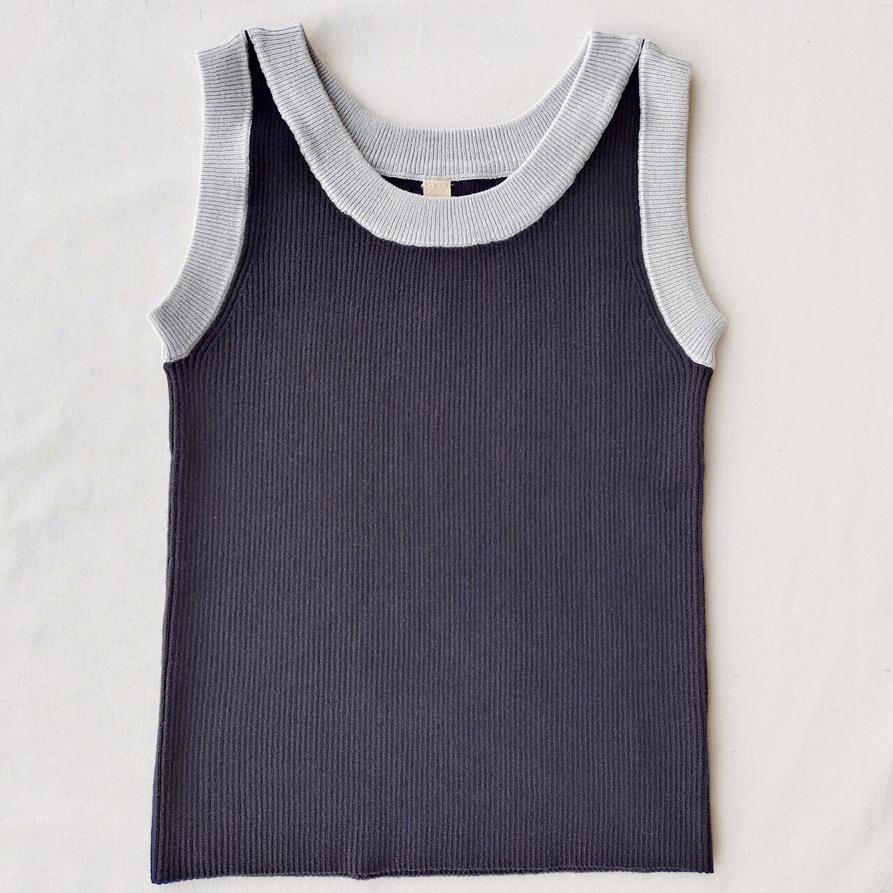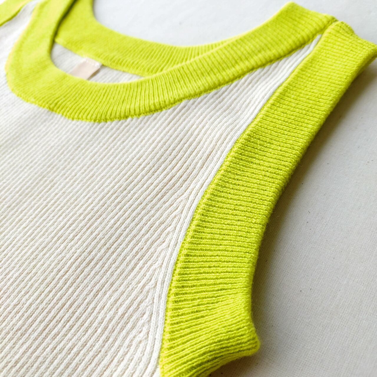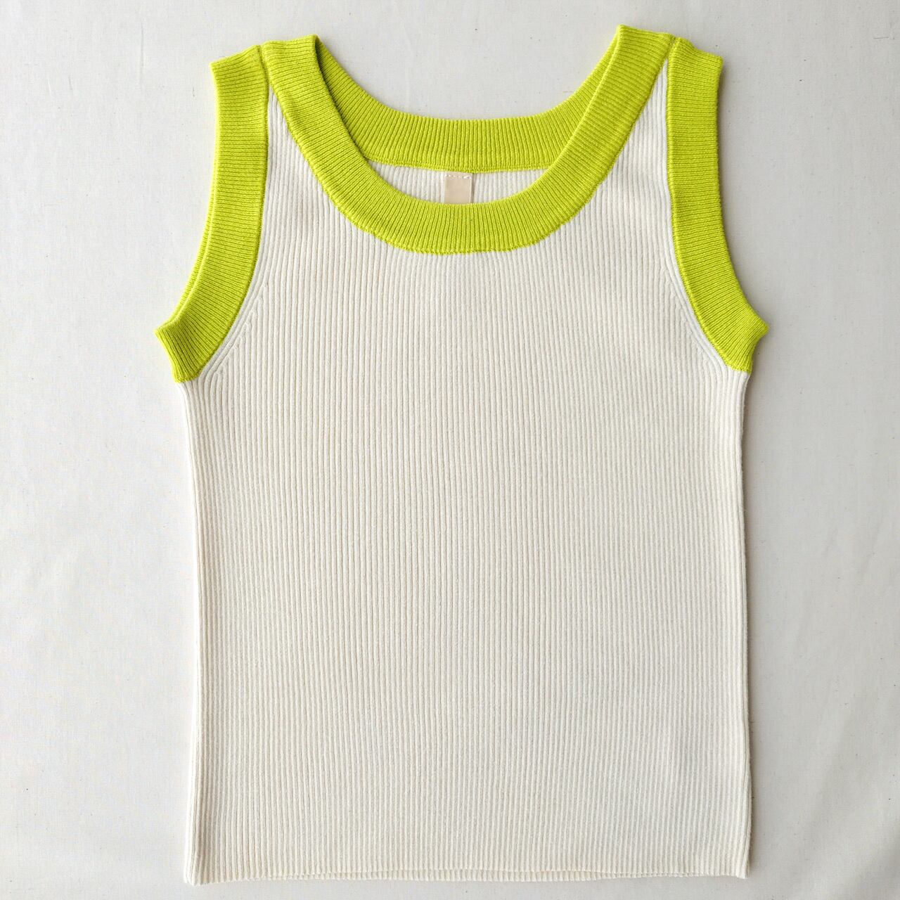 配色バインダーがアクセントになった、トレンド感満載のクロップド丈リブニットタンクトップが登場です。