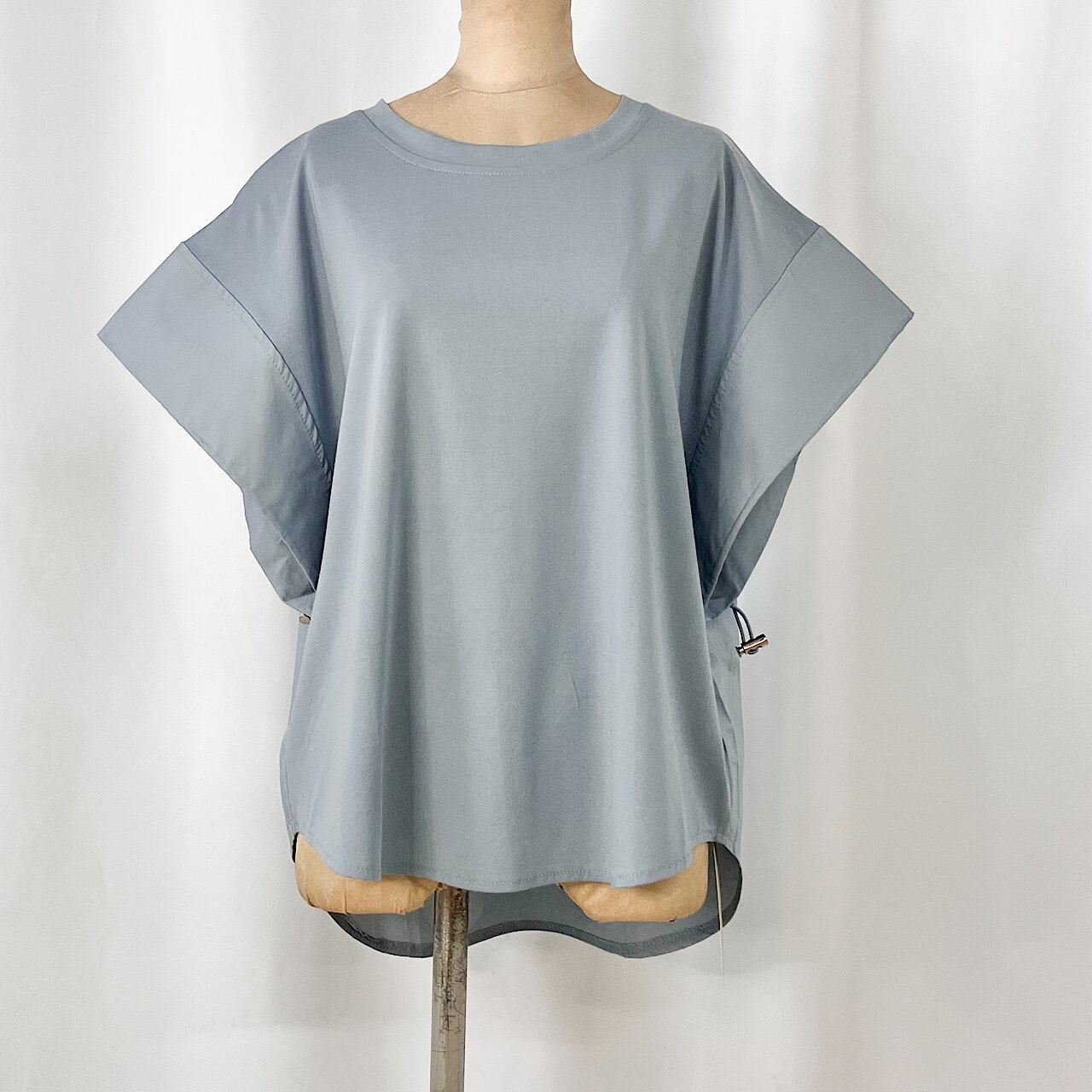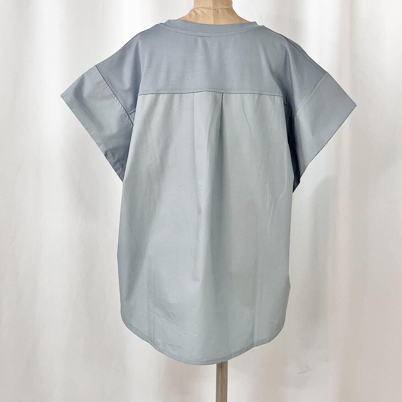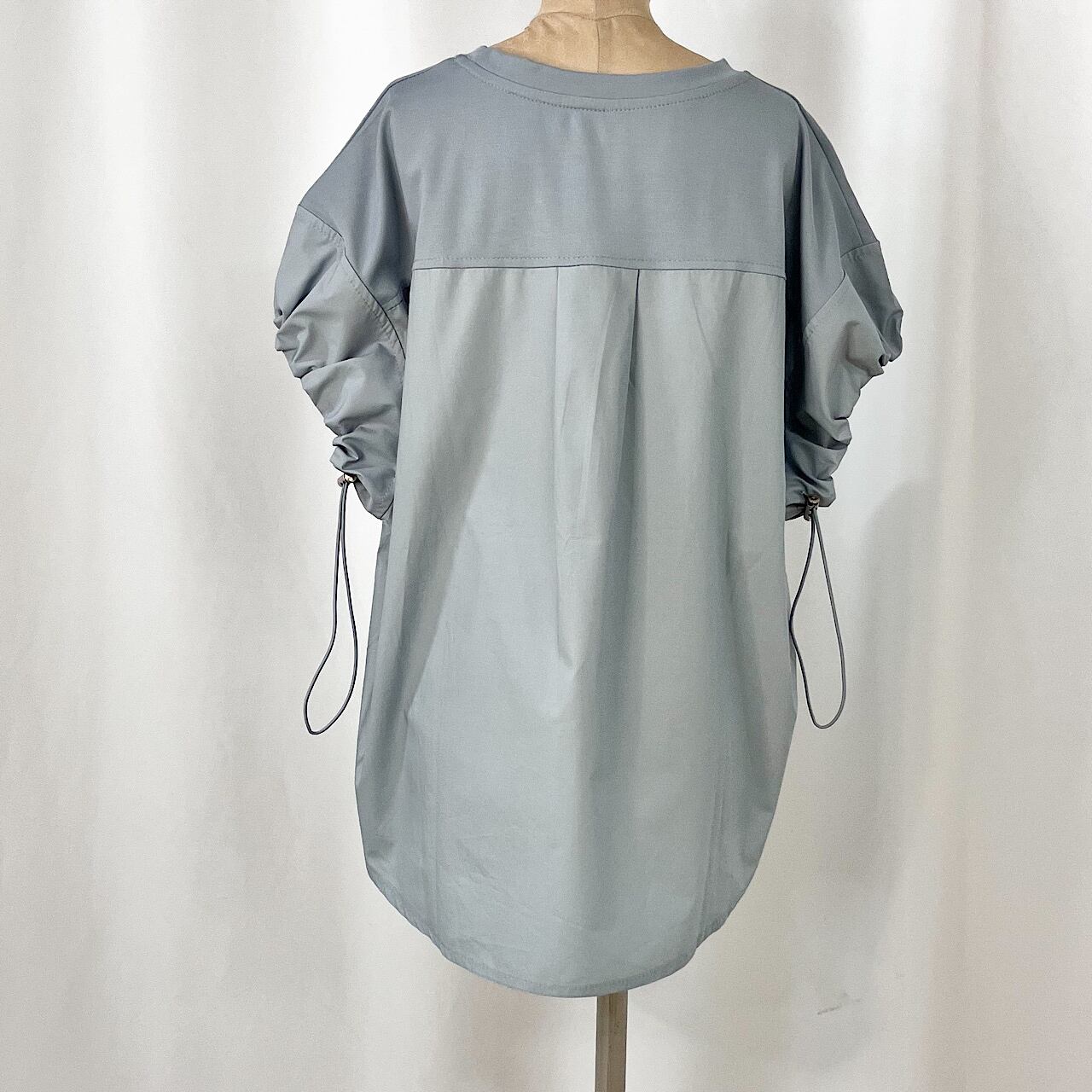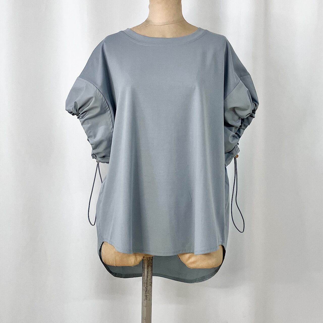 袖と後身頃部分に異素材を施したデザイントップスです。