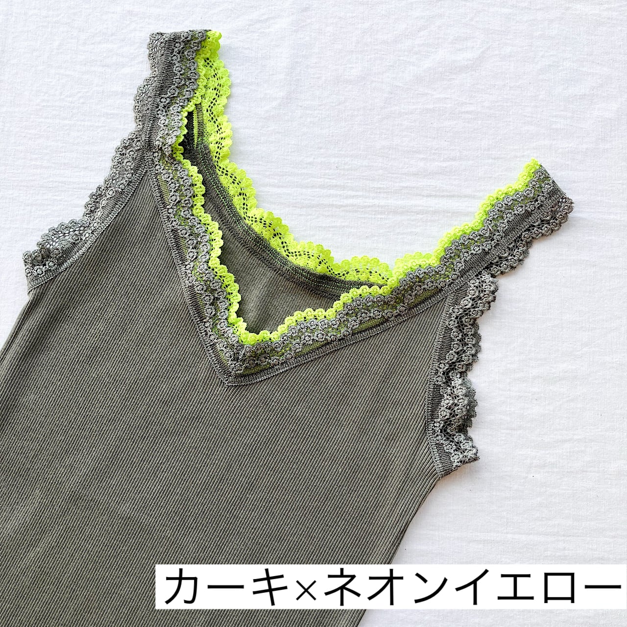 前後でV開き、U開きと違う形になっているので合わせるトップスに合わせてお好きな形で着用ください。