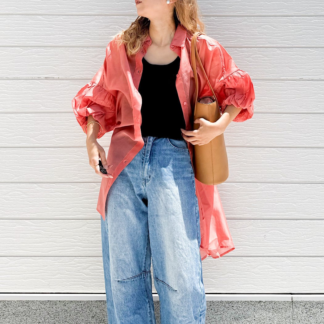 袖のバルーンデザインが女性らしさを引き立て、シンプルなコーディネートに華を添えてくれる一着です。