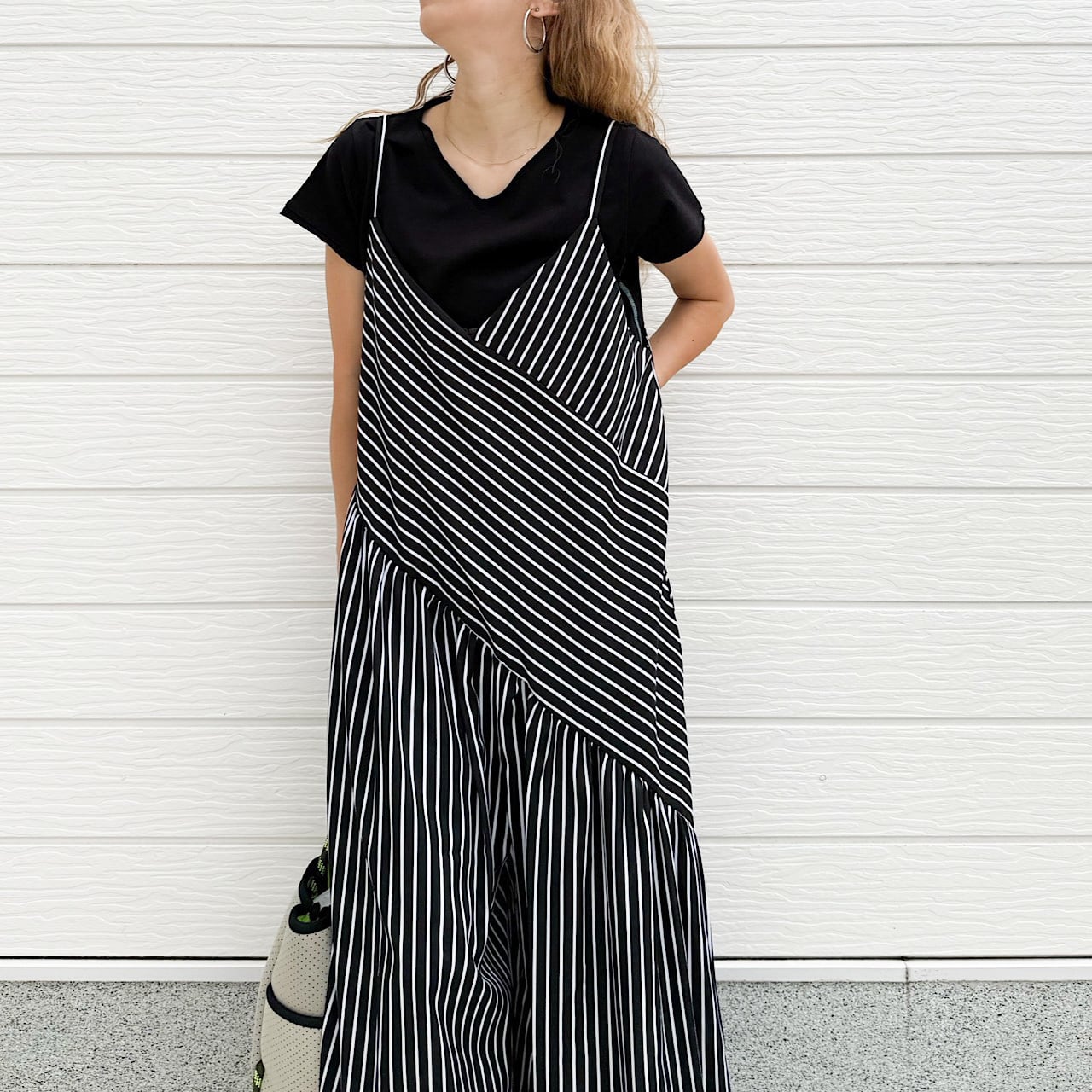 左右に流れる細めのストライプが身体のラインを細くきれいに見せてくれます。