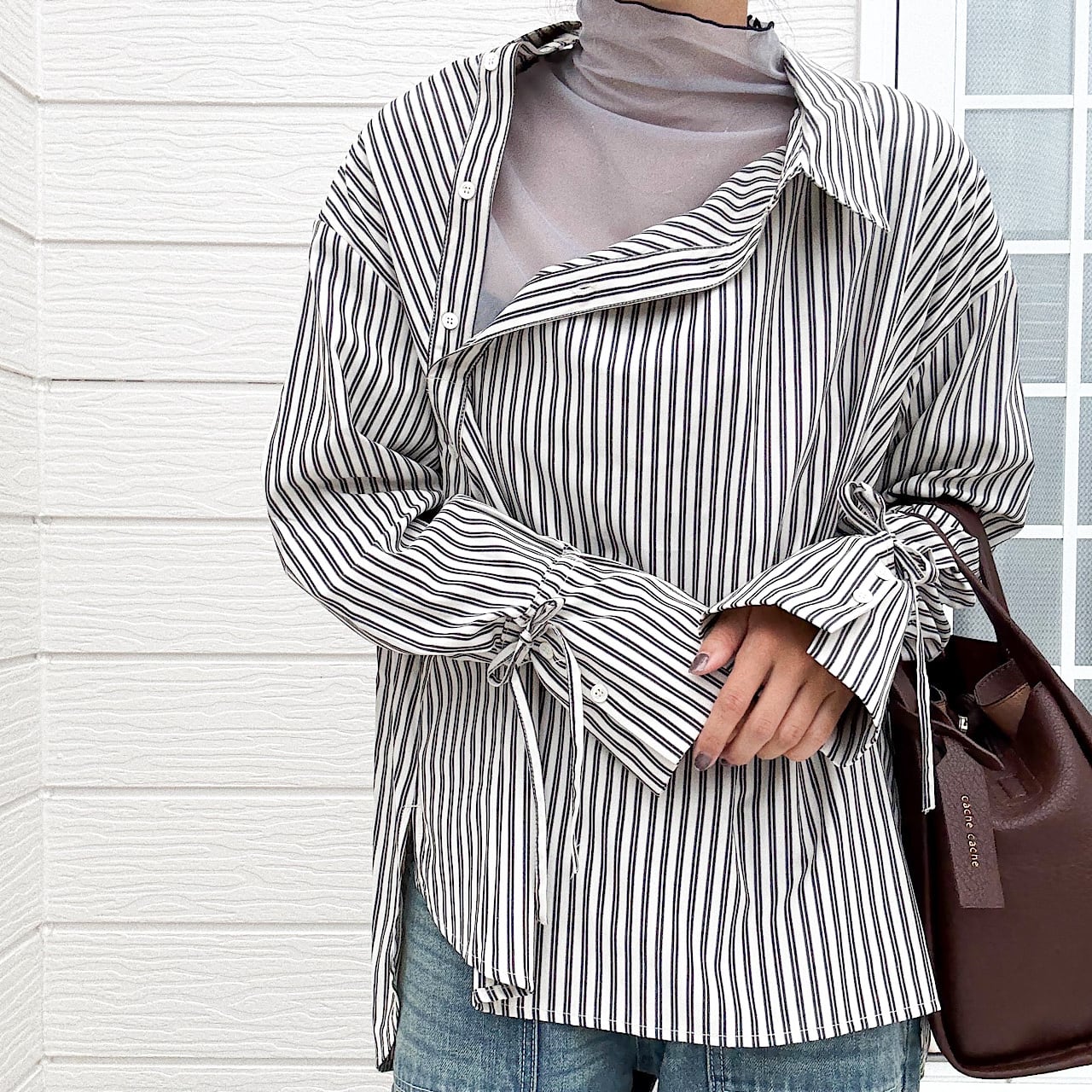 デザイン性の高いアシンメトリーなシャツは、ブラウスのようにボタンをしめて着るのもおすすめ◎