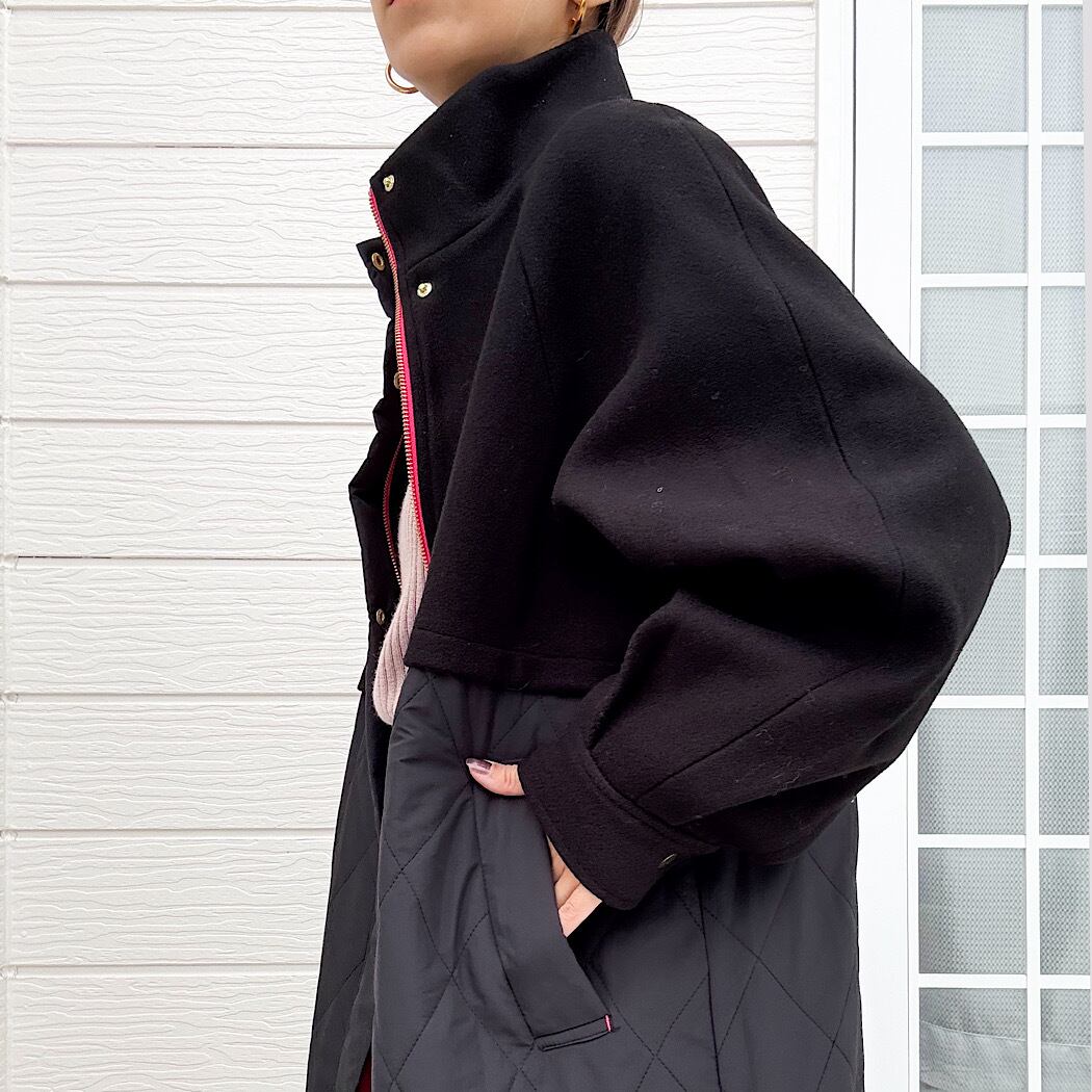 フロント部分はジップとスナップボタン仕様で、モード感のある仕上がりに。