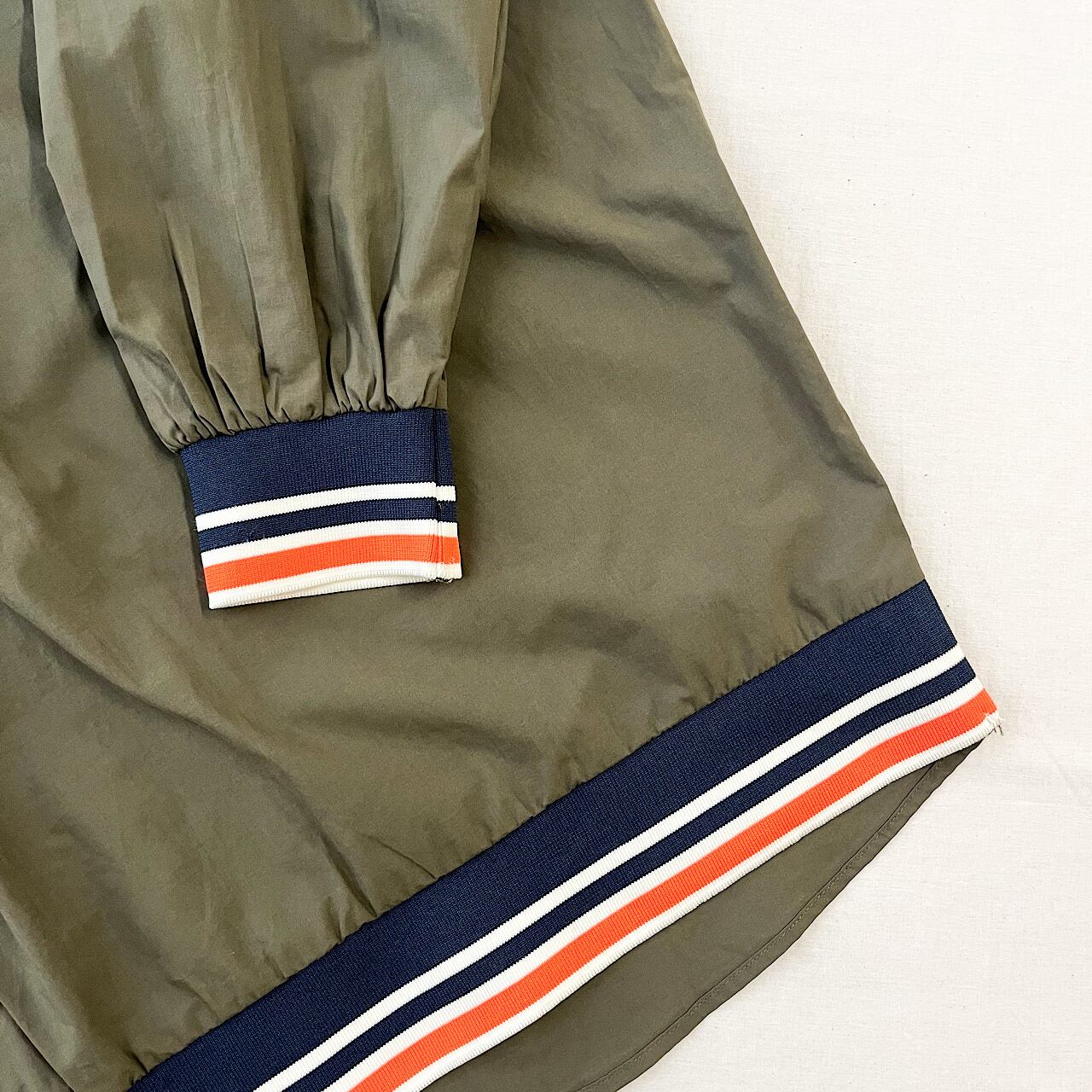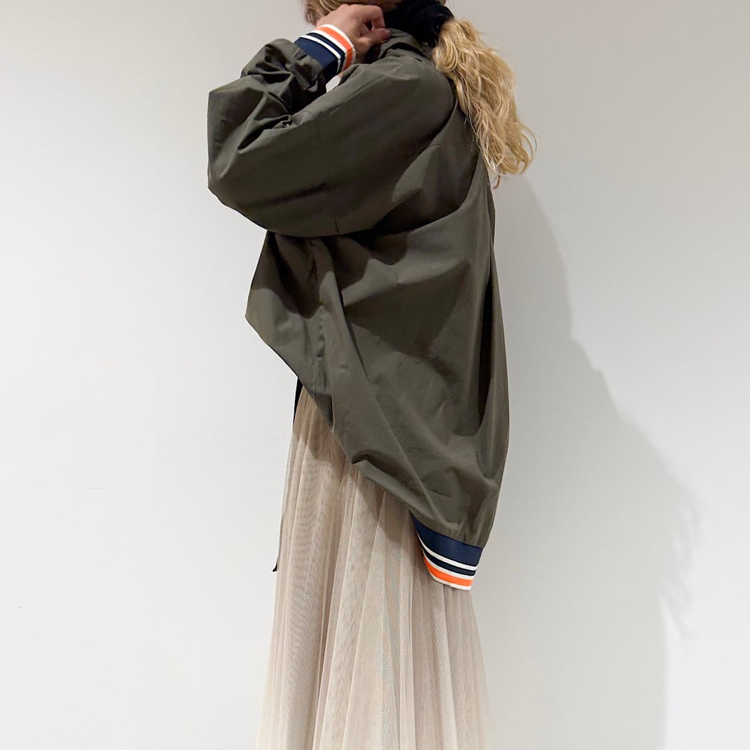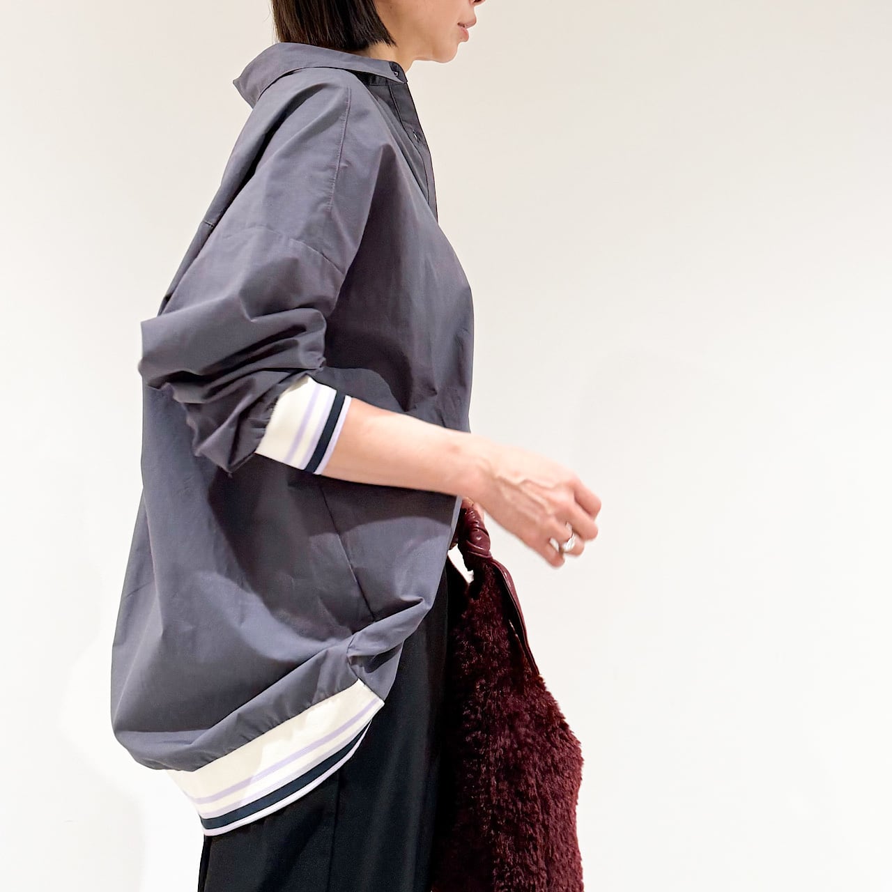 落ち着いたダークカラーの身頃にリブのカラーがアクセントのある仕上がりに。