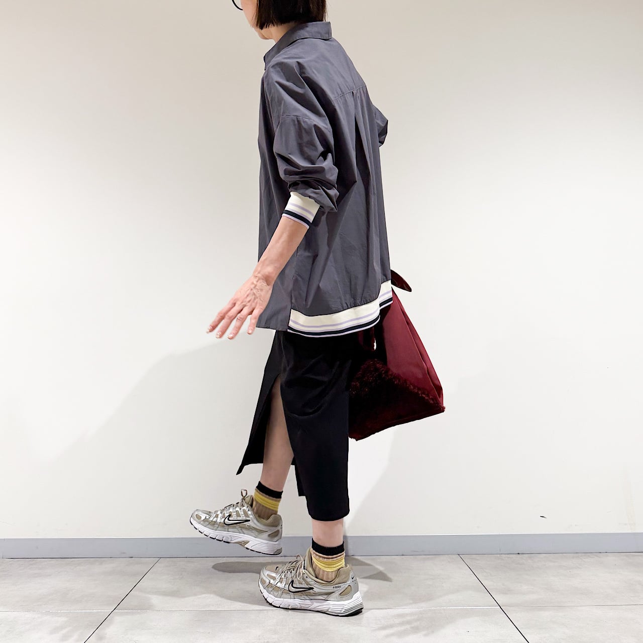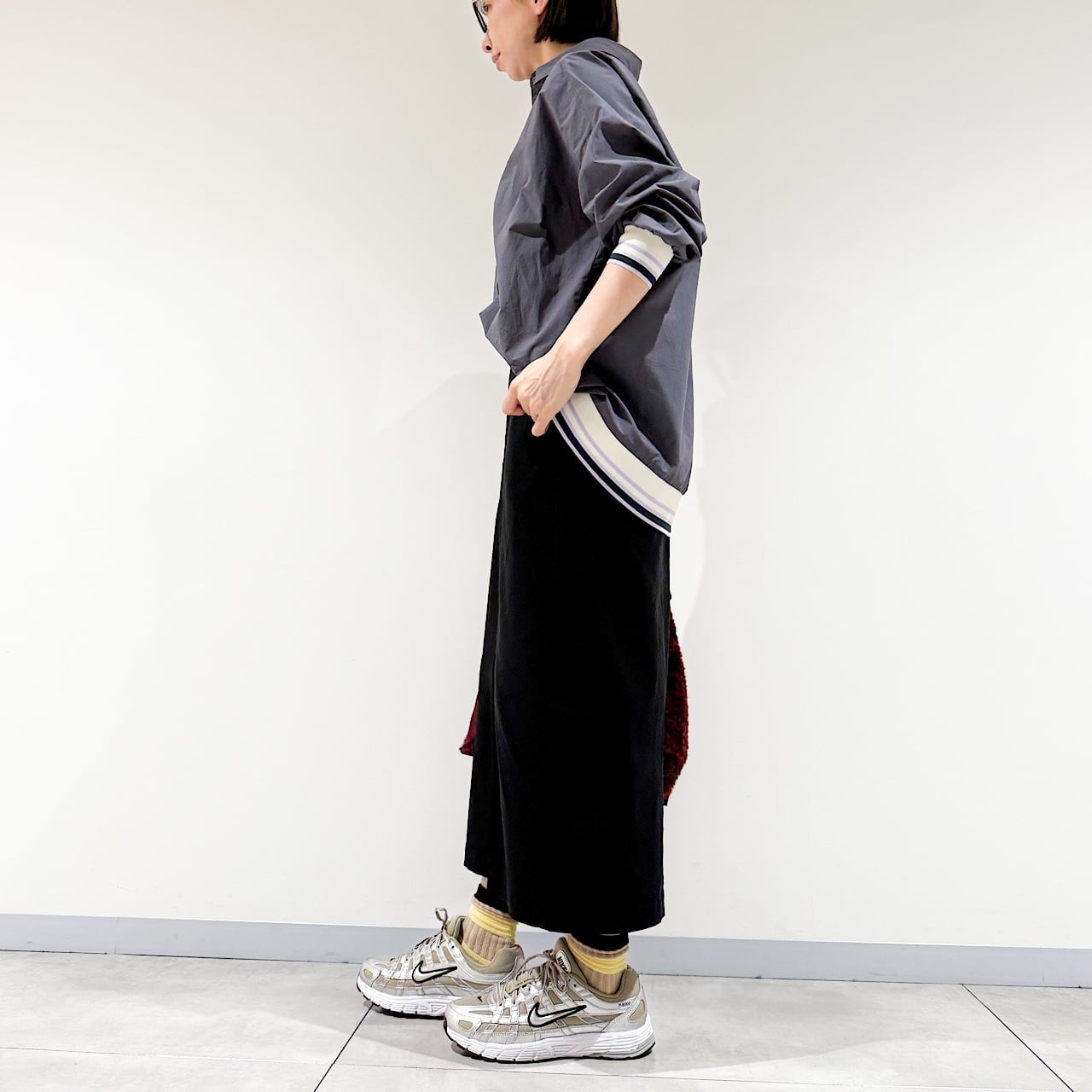 ボタンを止めて着ても、襟抜きでリラックス感を出すのもおすすめ。