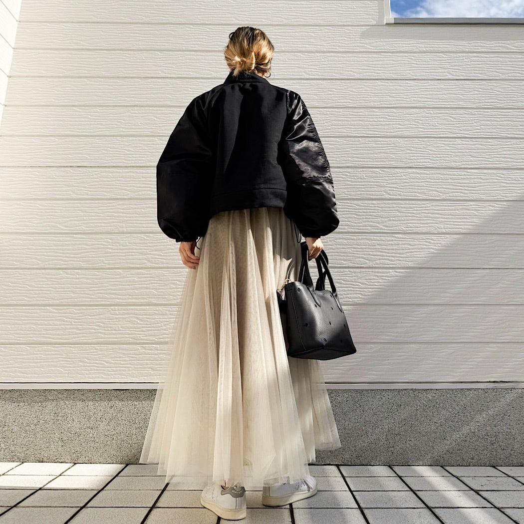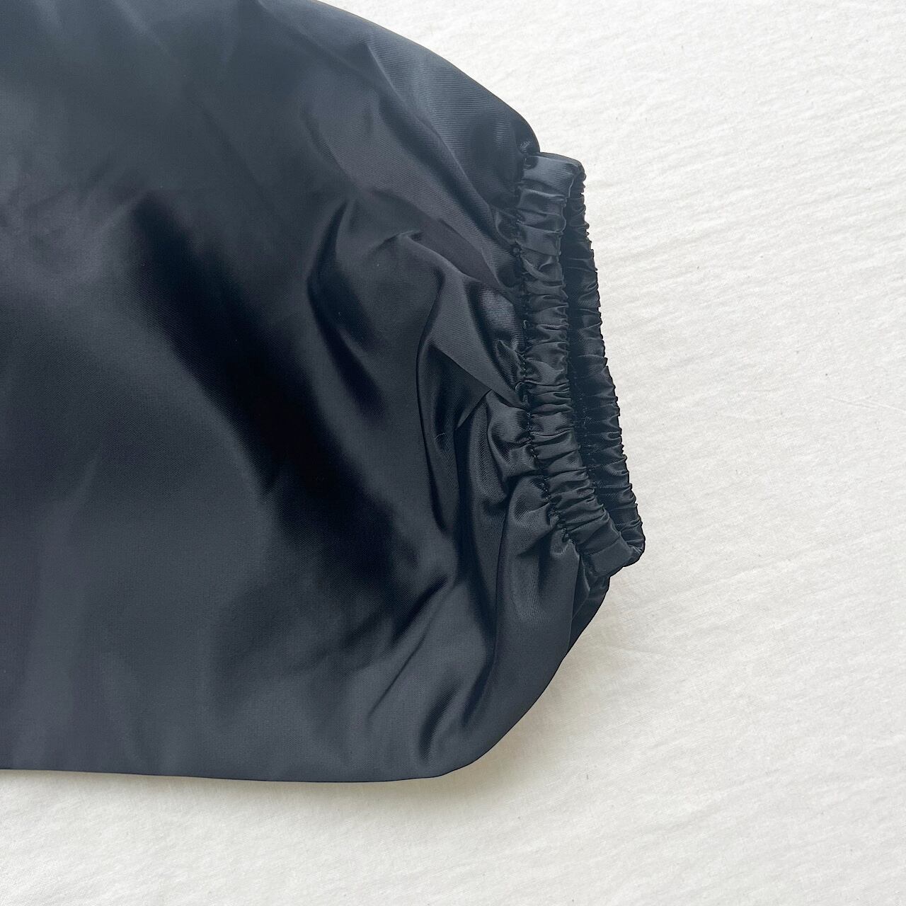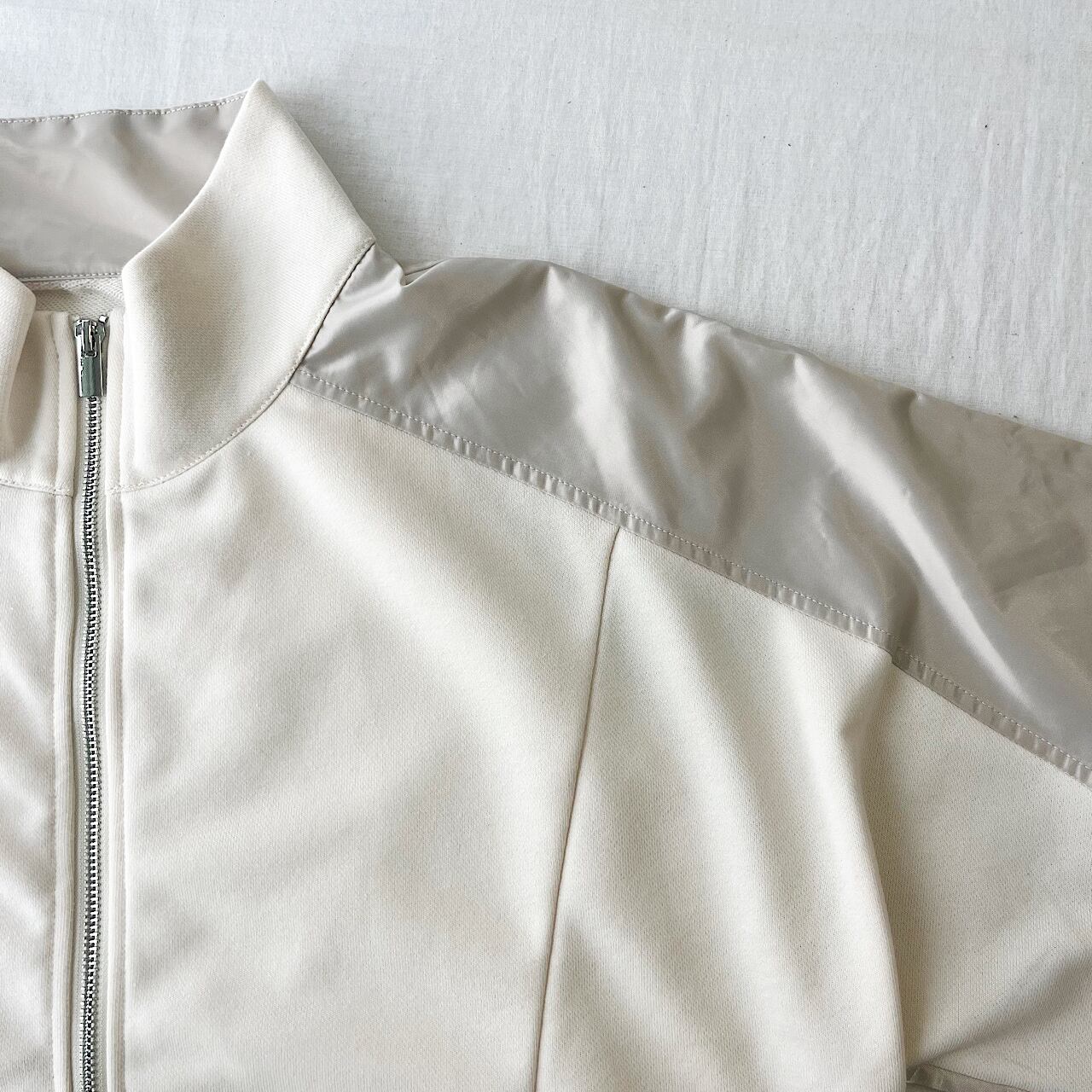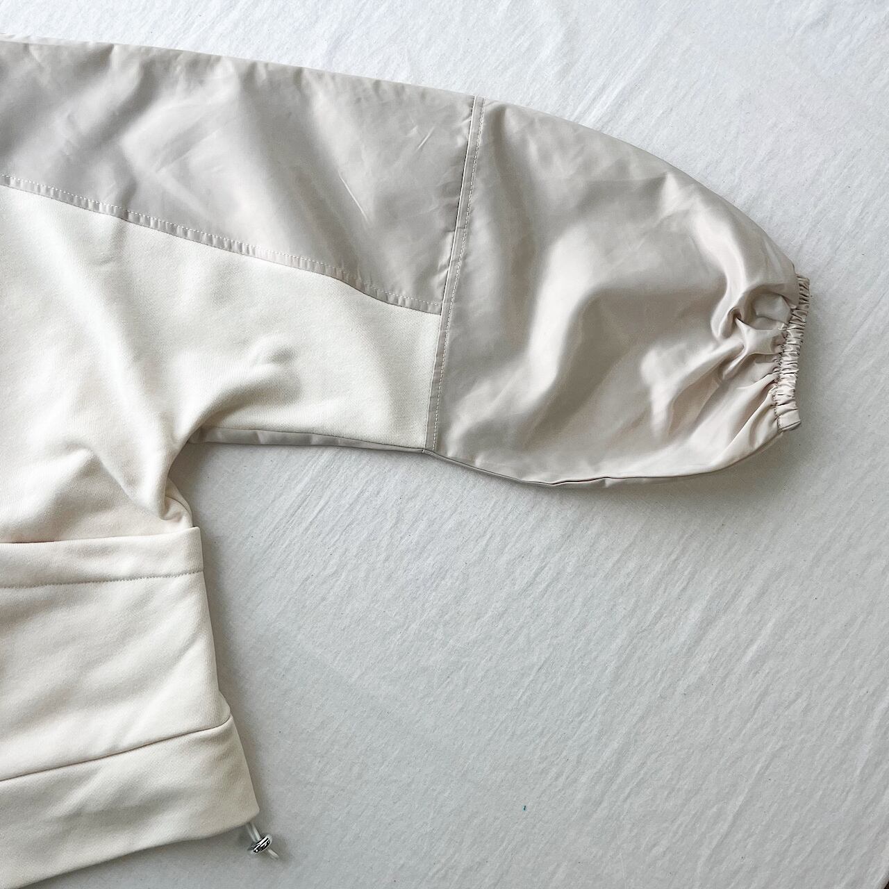 光沢のあるサテンとの切替がスタイリッシュで動きやすく、ドロストコードで雰囲気も変えて飽きの来ないデザインです。