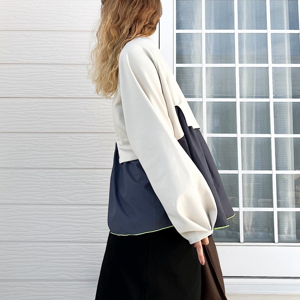 コントラストが効いたバイカラーデザインが印象的な一着。