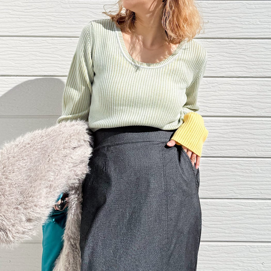 伸縮性のあるリブ素材が体に馴染み、ジャケットやカーディガンのインナーとしても、1枚でさらっと着ても映える万能アイテムです。