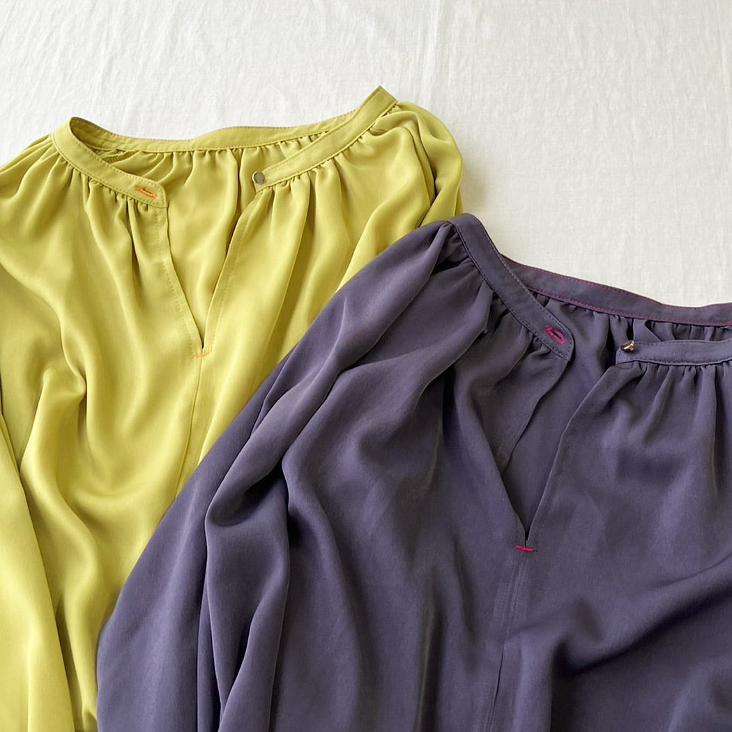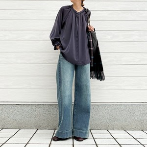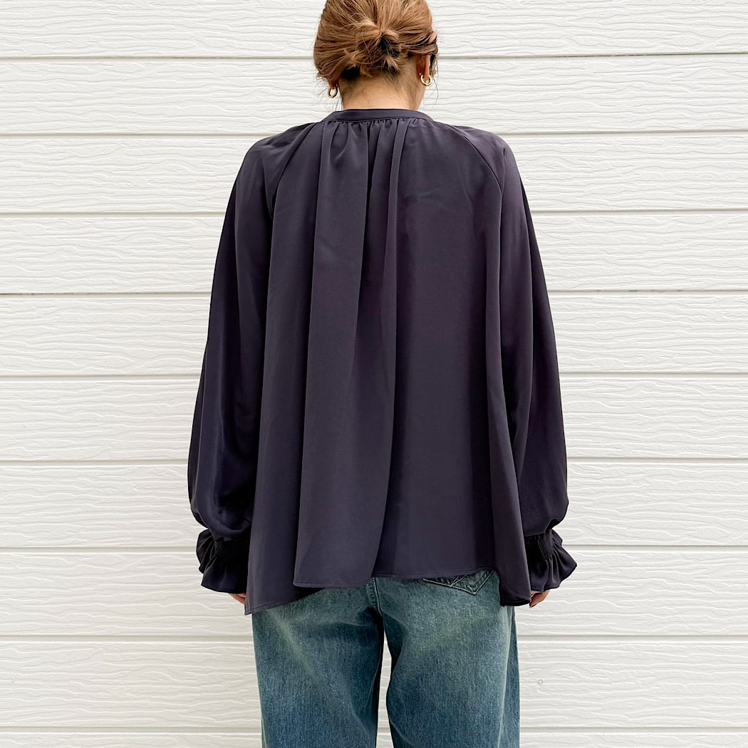 ふんわりとした袖と、ネックに寄せた繊細なギャザーが女性らしい柔らかさを演出します。
