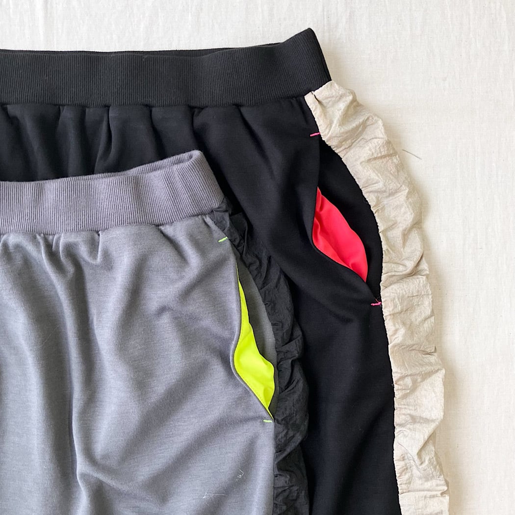 両サイドにトラックパンツのようなサイドラインを施し、スポーティーミックスなスタイルに仕上げました。