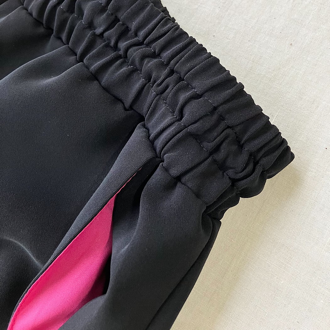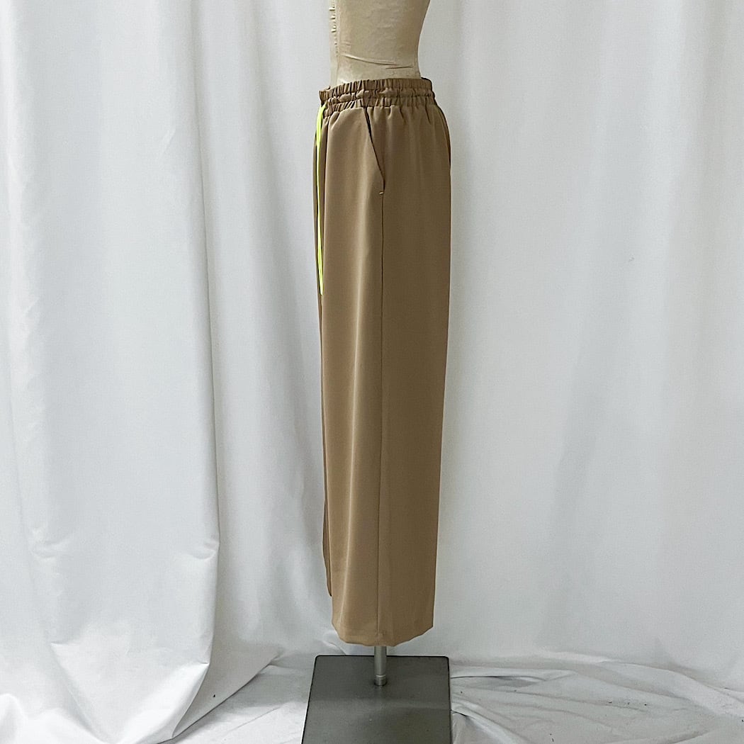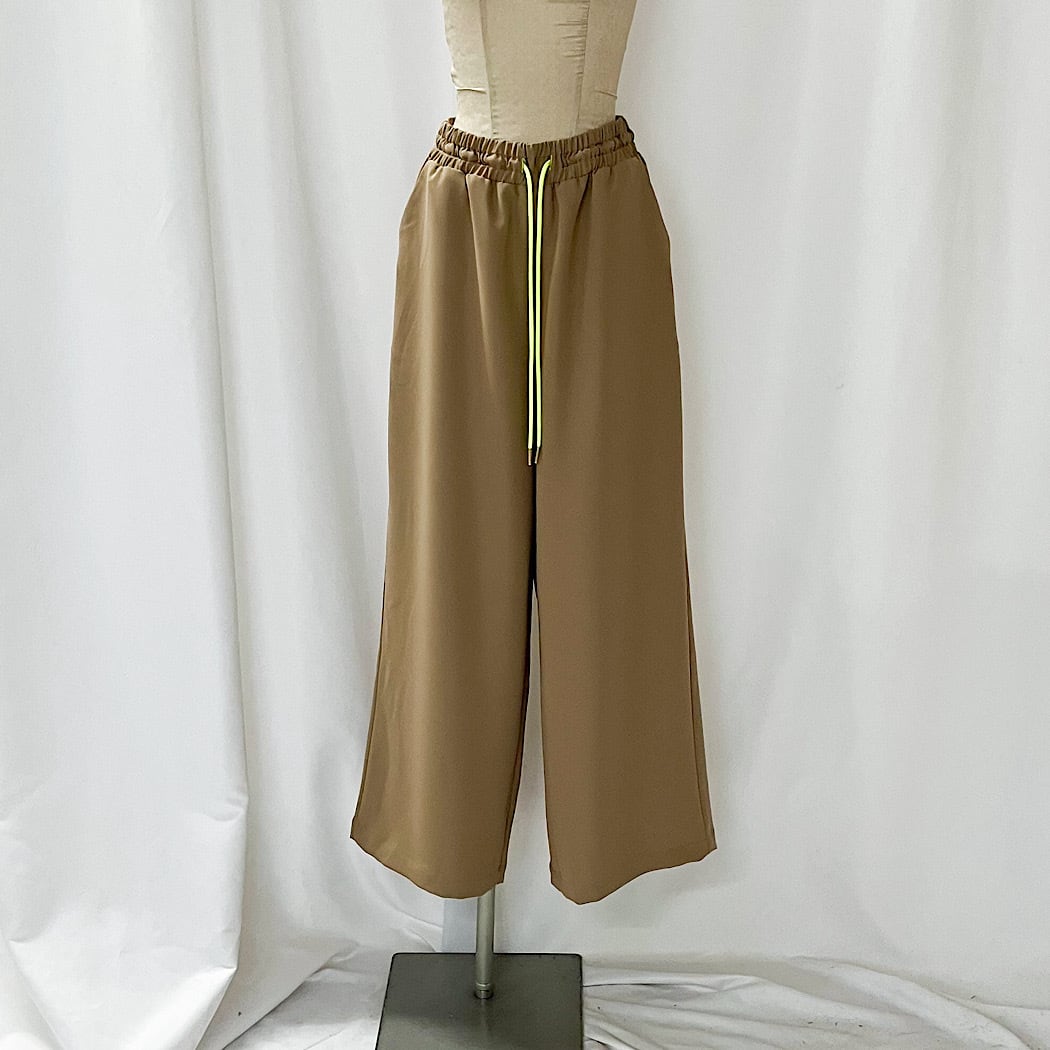 ほどよい落ち感ときれいなワイドラインが魅力のウエストギャザーパンツです。