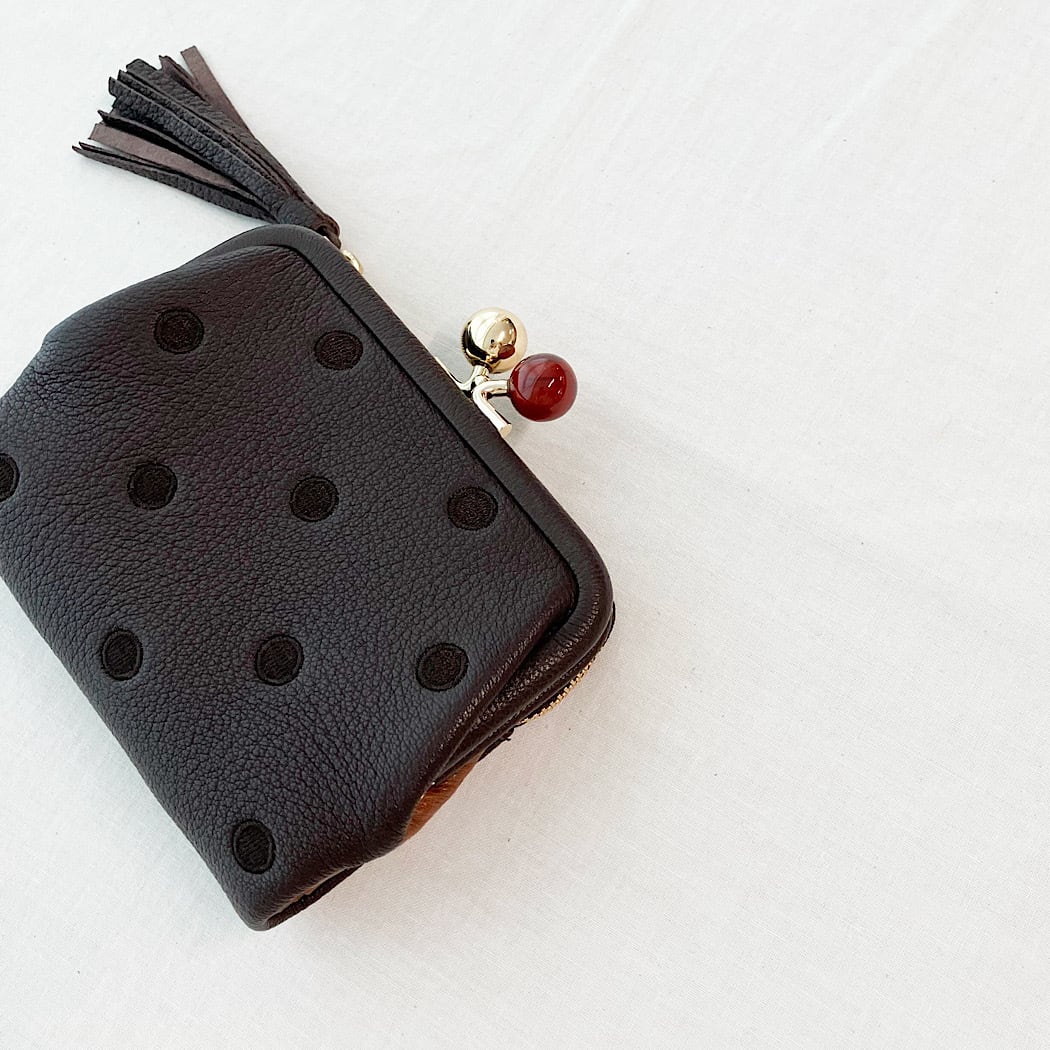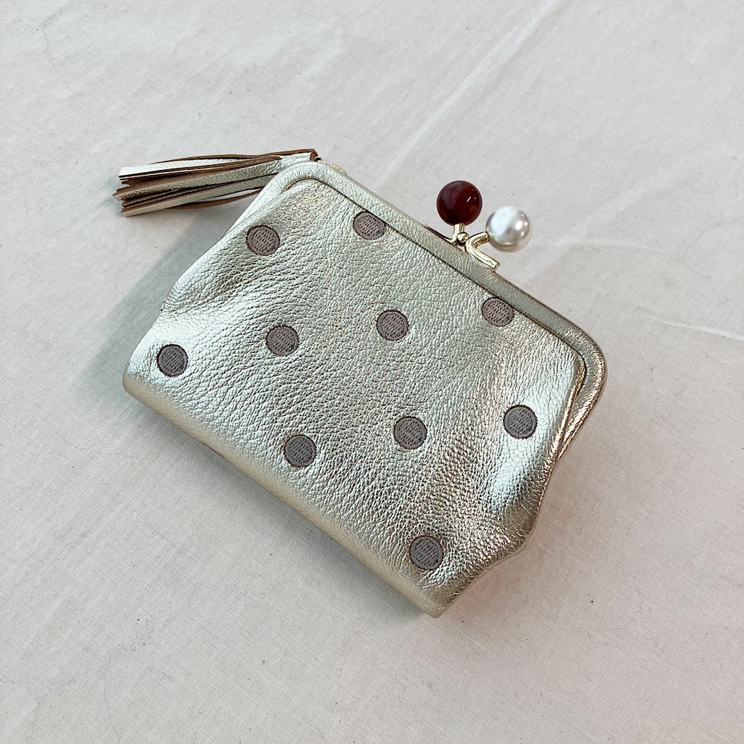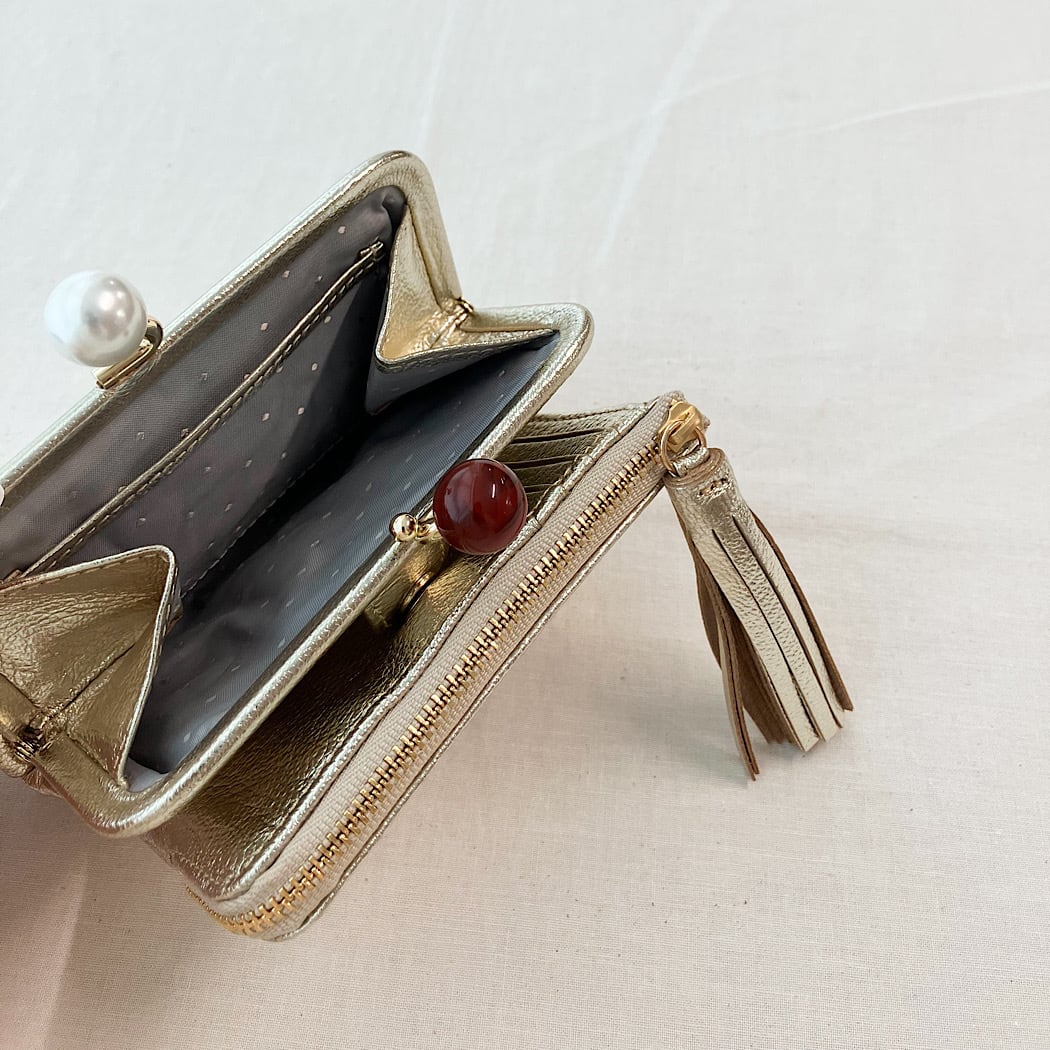 がま口部分のアクリル玉がかわいい2つ折り財布です。