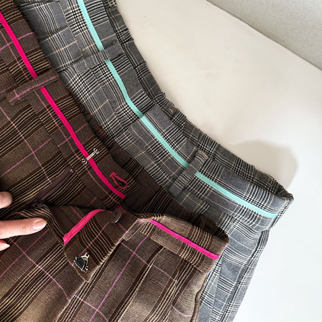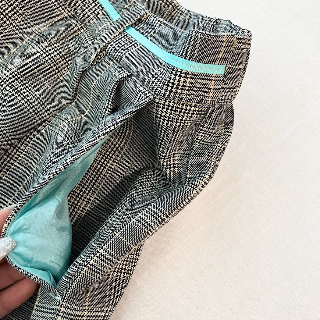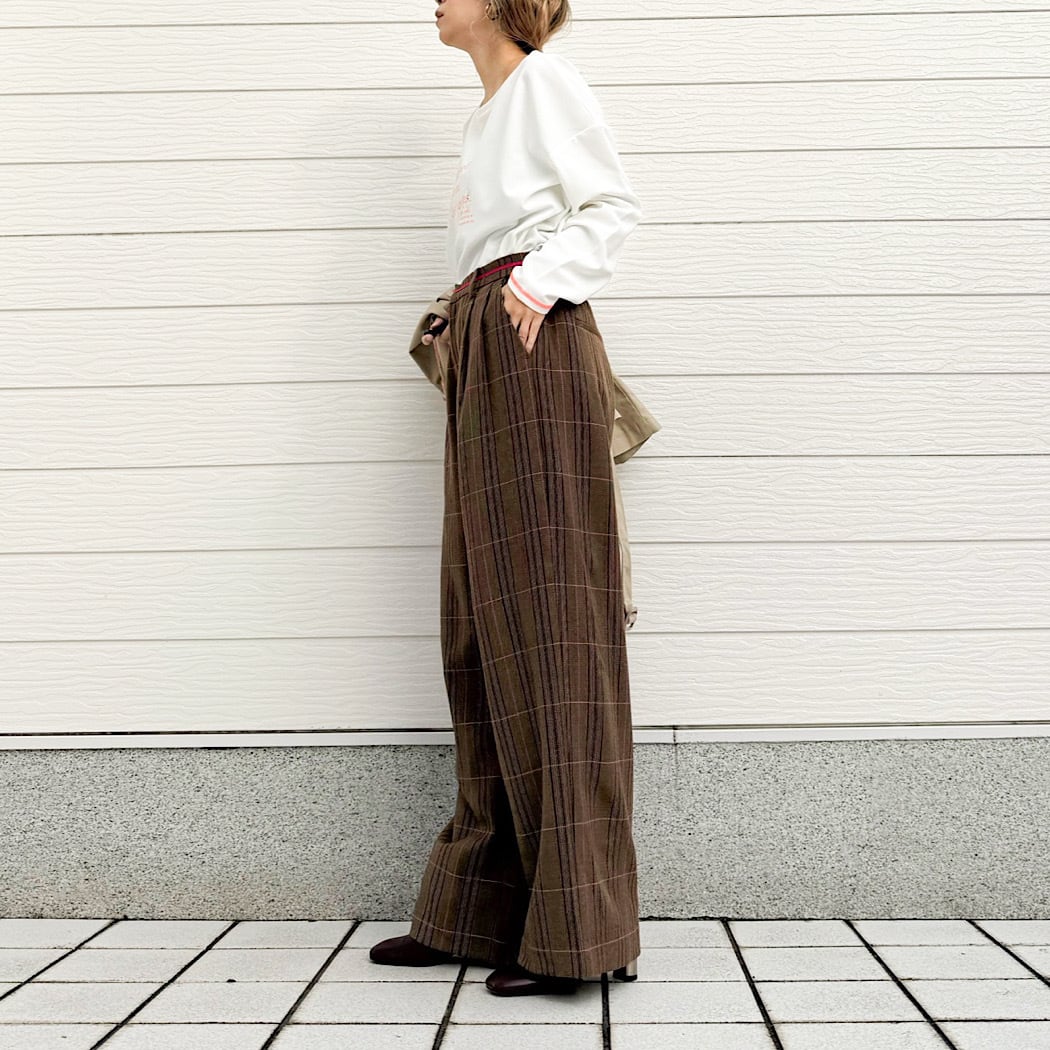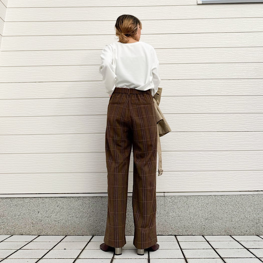 ウエストのグログランラインがアクセントのチェックパンツです。