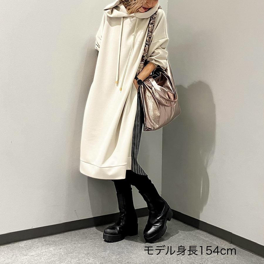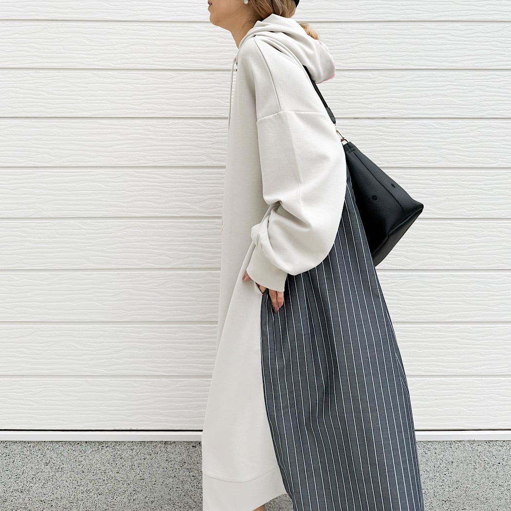 後身頃にシャツ素材をドッキングさせた、フード付きワンピースです。