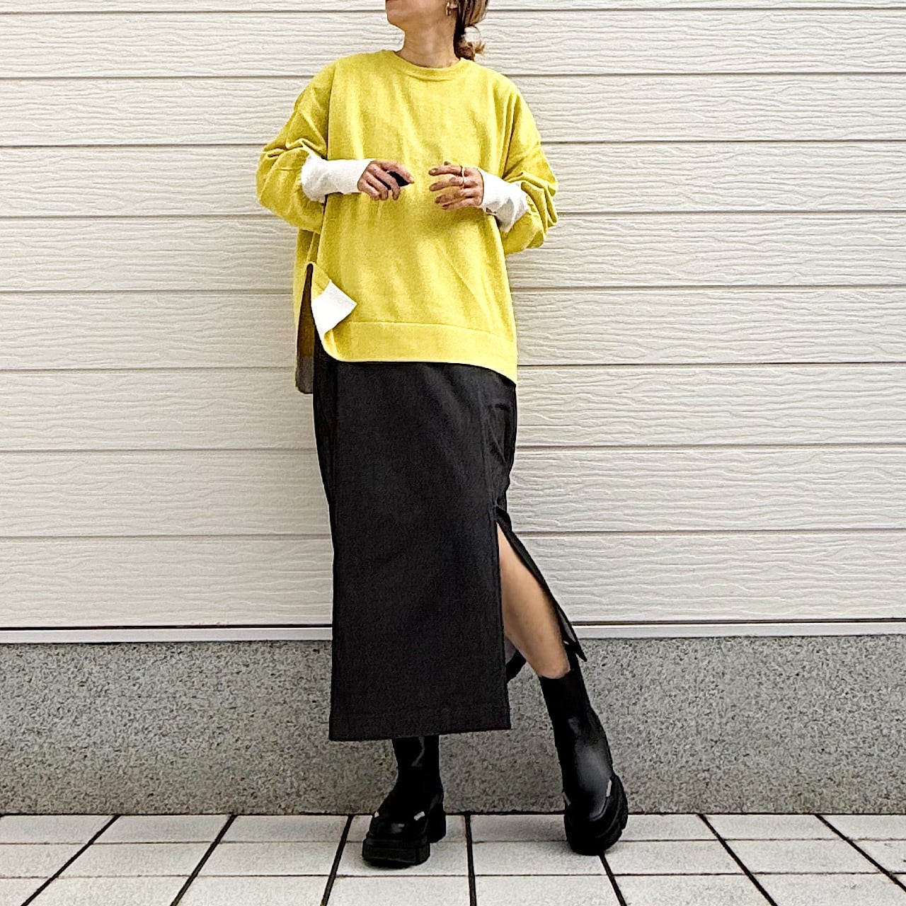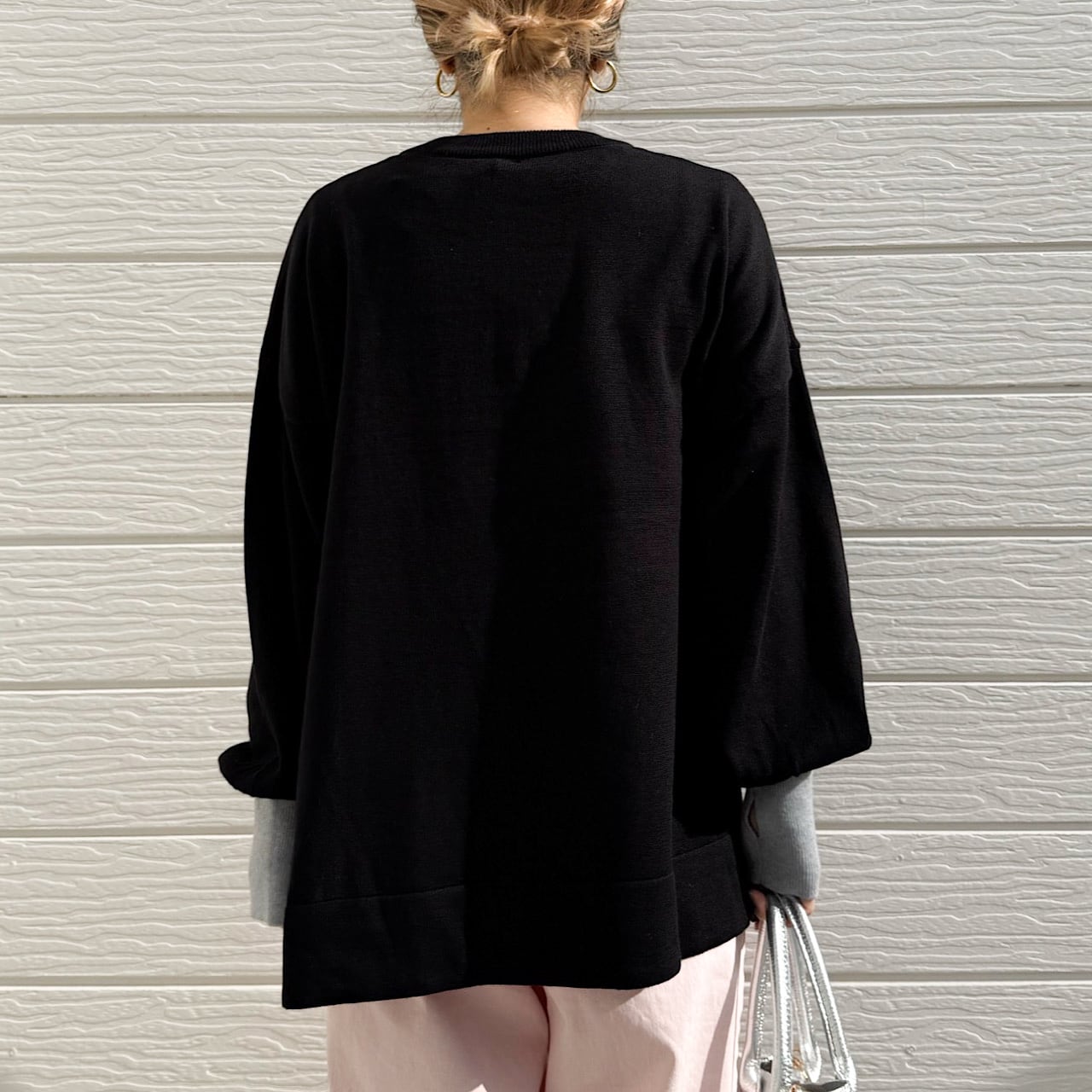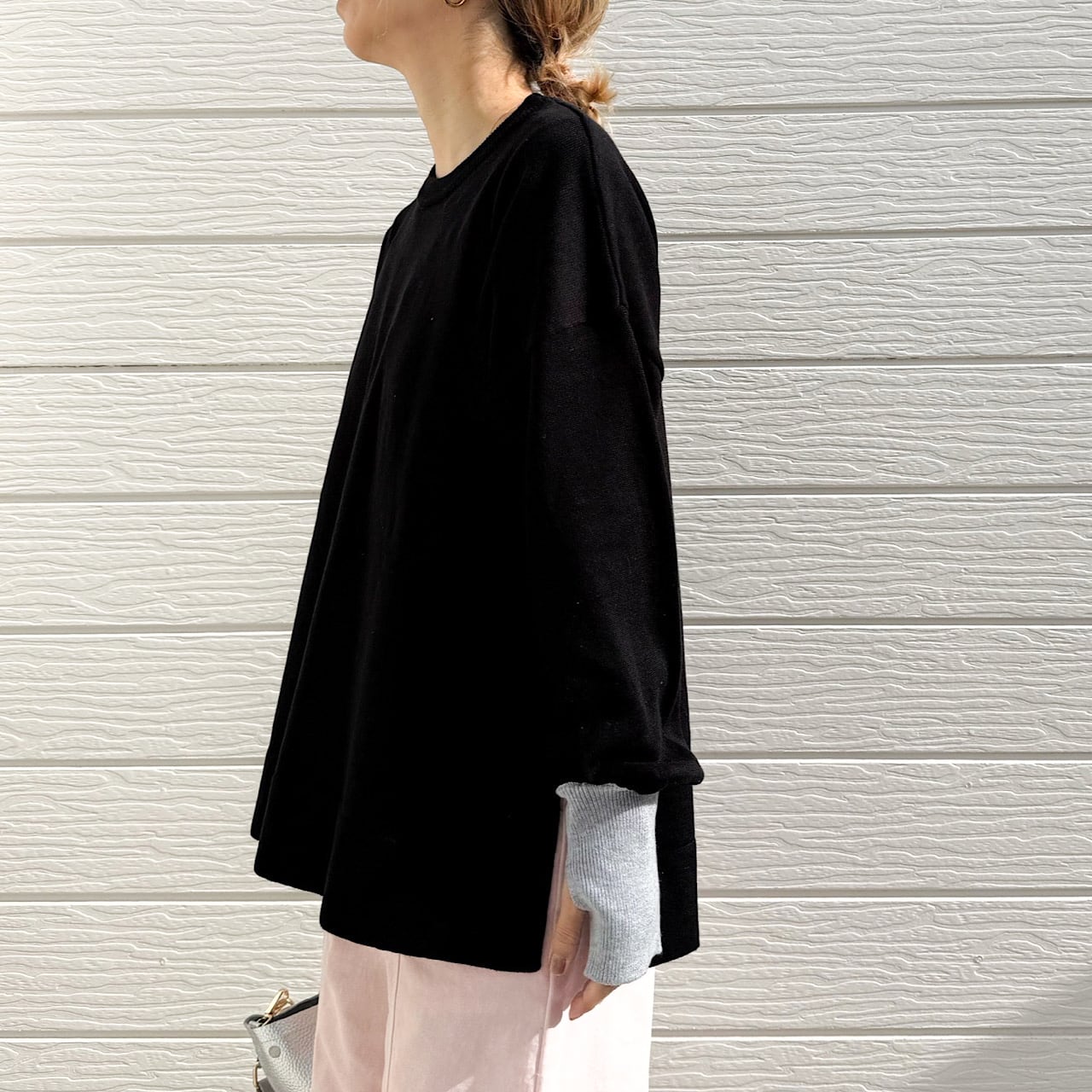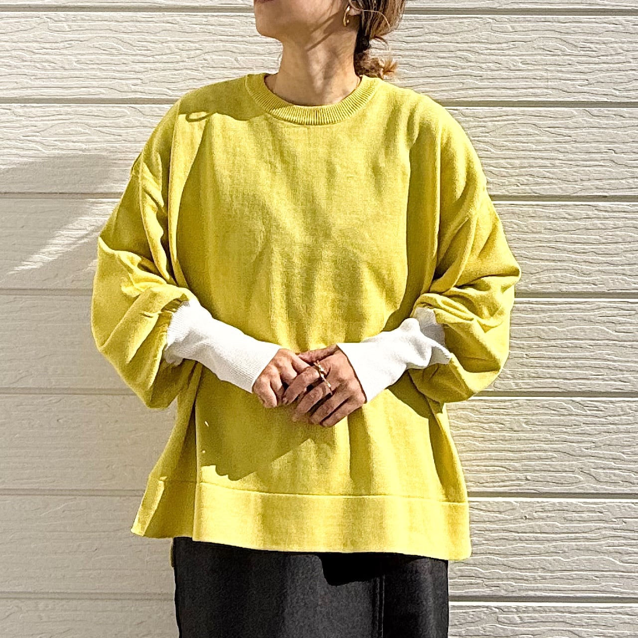 着回しが効くので、ワイドやスキニーなど様々なボトムに合わせられる万能さも魅力のニットです。