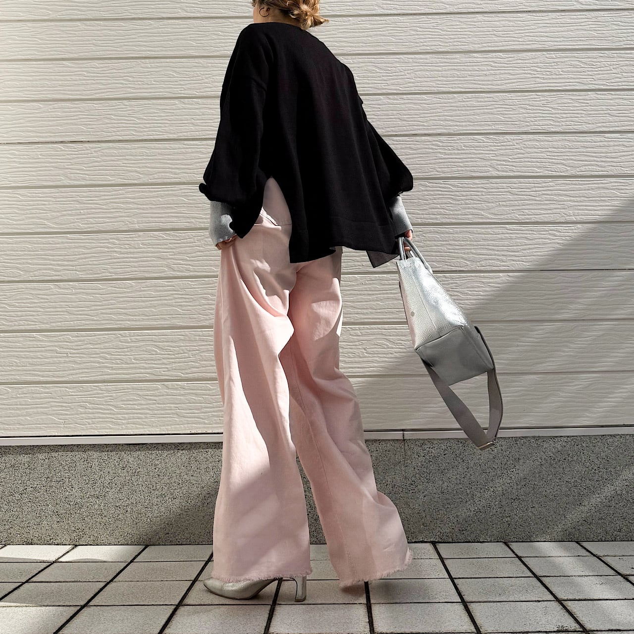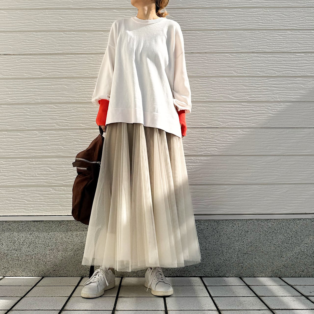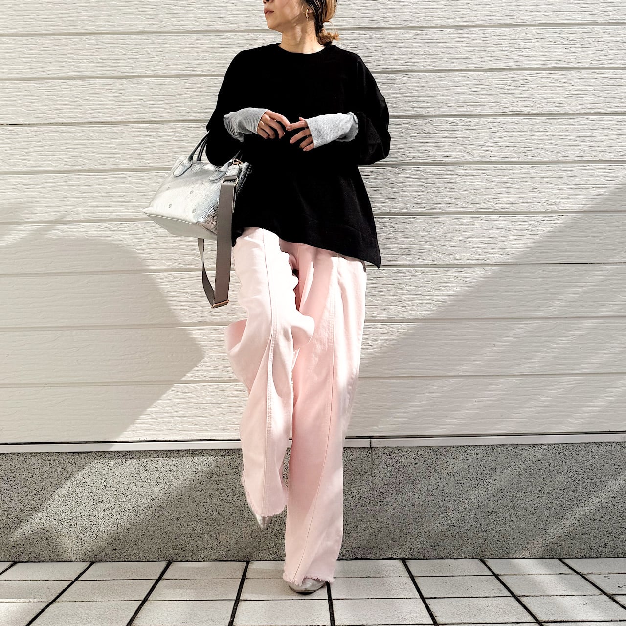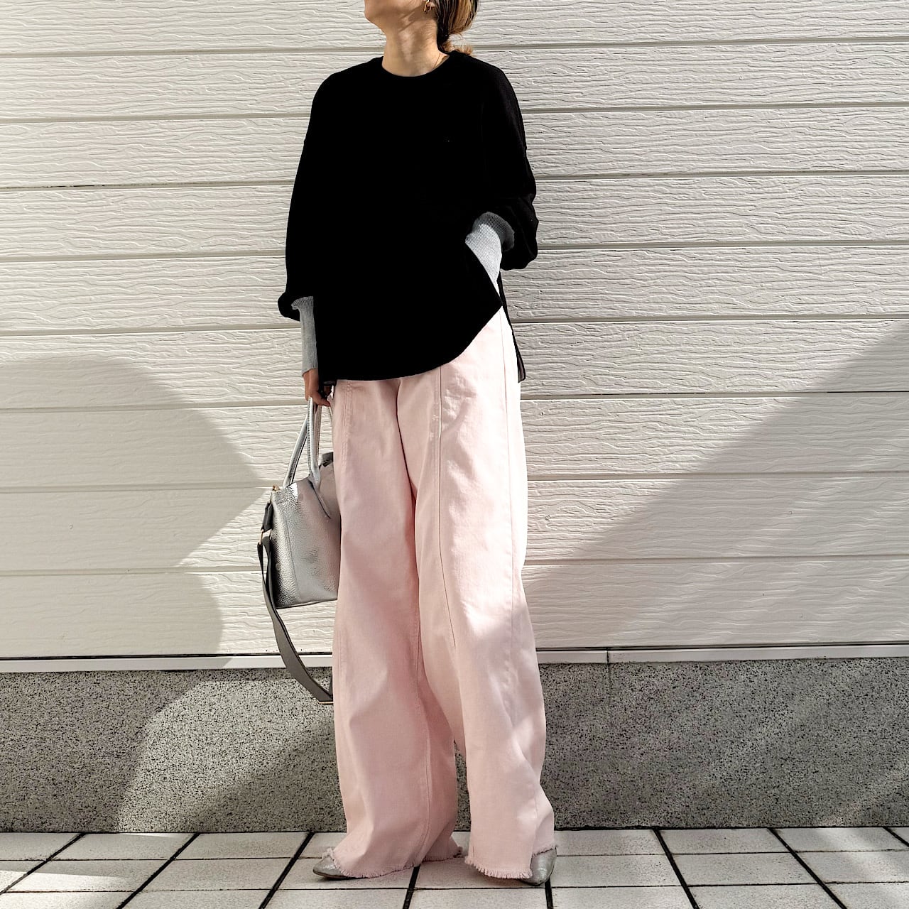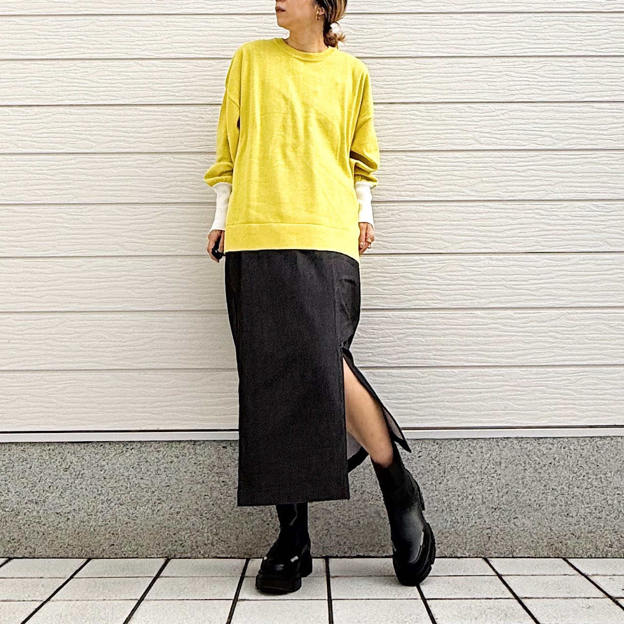 着回しが効くので、ワイドやスキニーなど様々なボトムに合わせられる万能さも魅力のニットです。