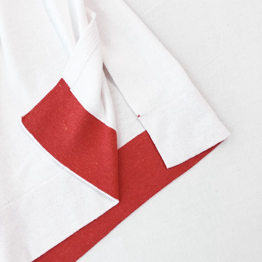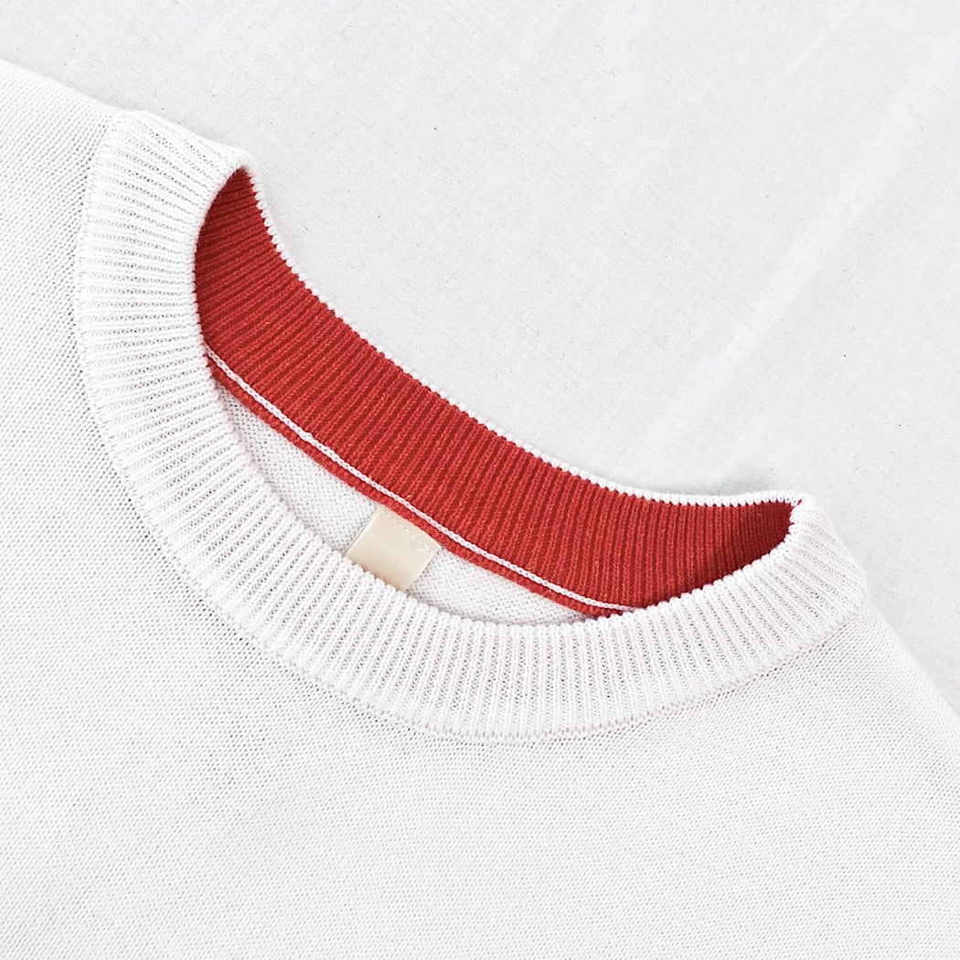 配色のアクセントが目を惹く、シンプルながらも存在感のあるニットトップスです。