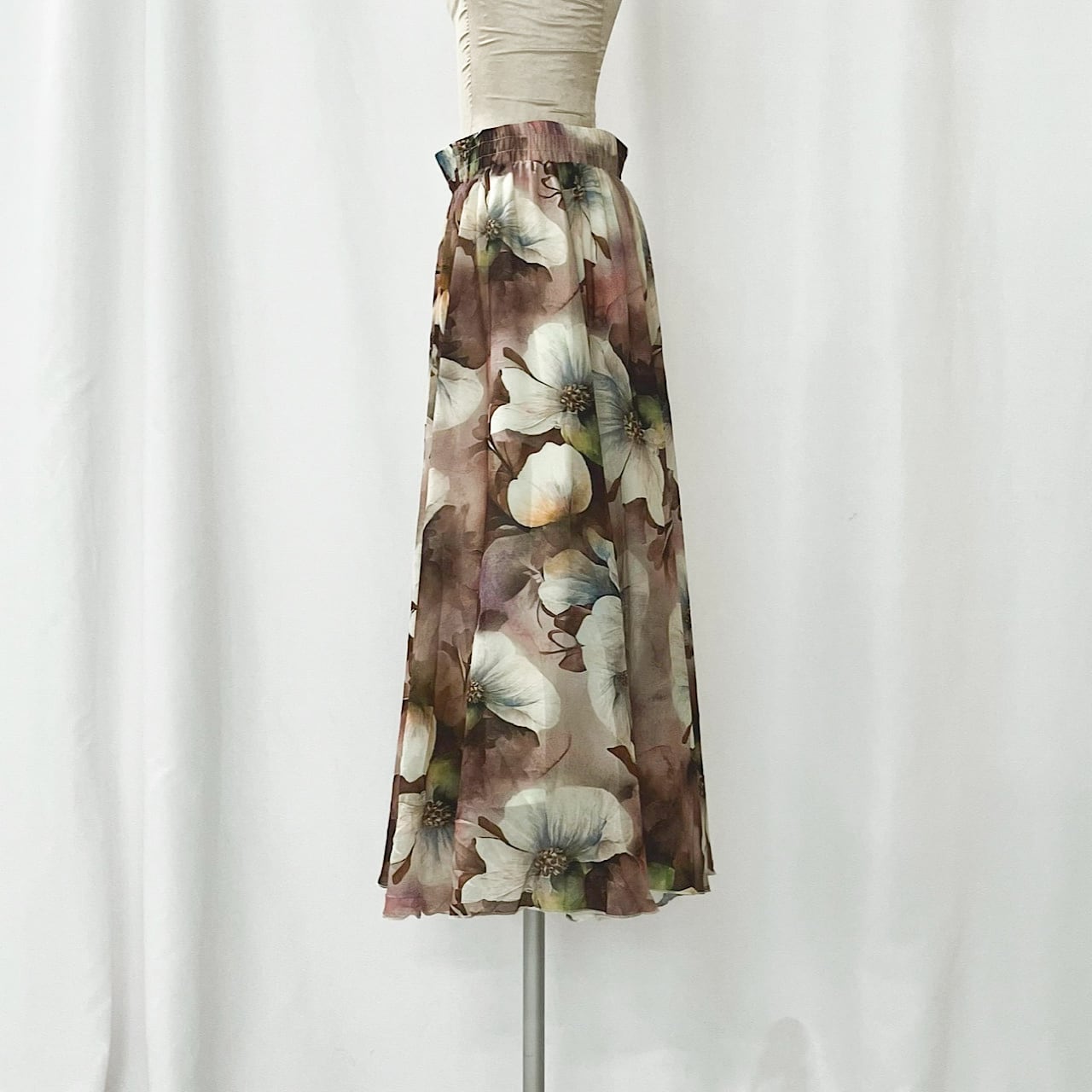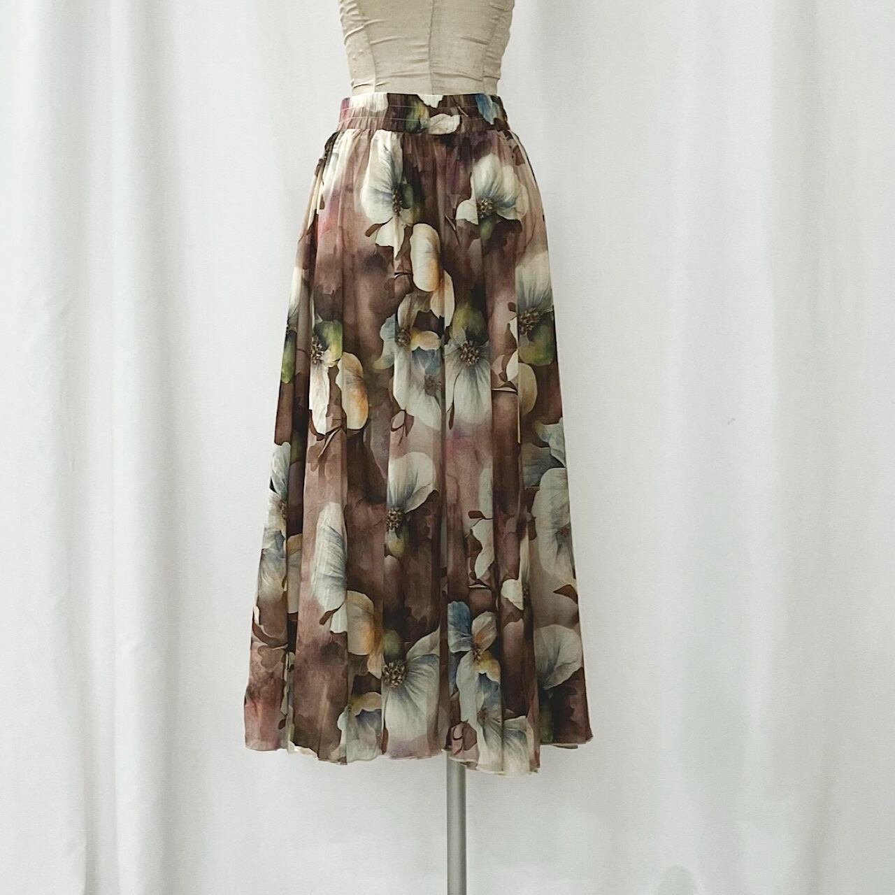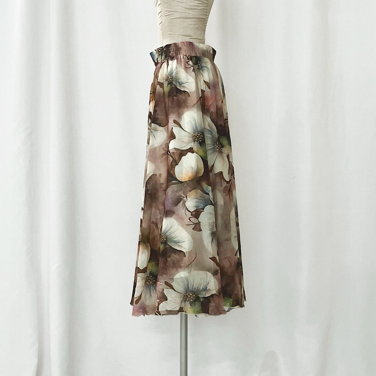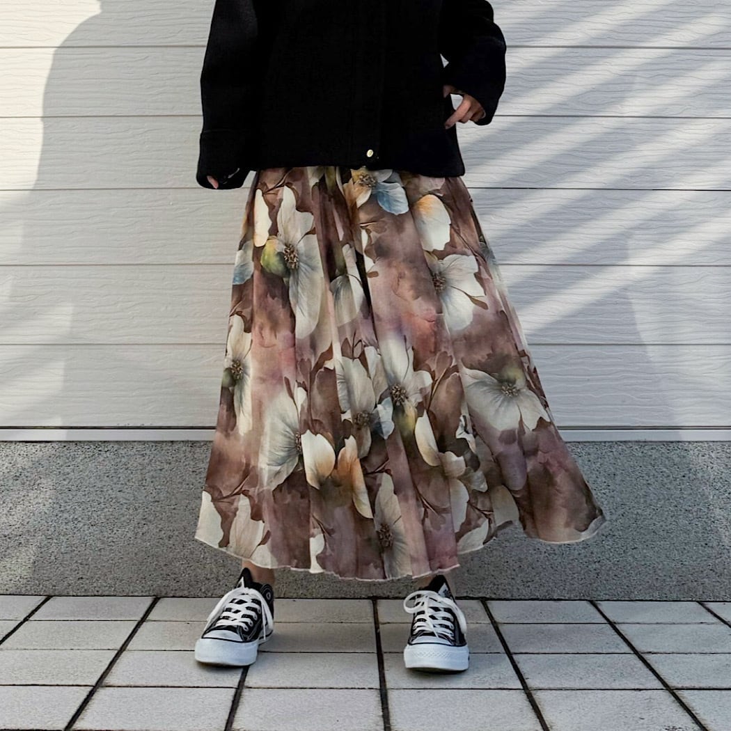 水彩画のように滲むフラワープリントが印象的な、ニュアンス感たっぷりのフレアスカート。