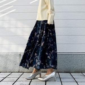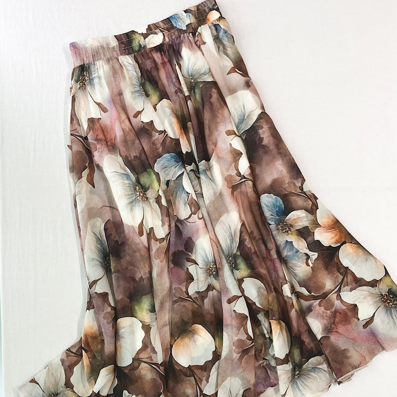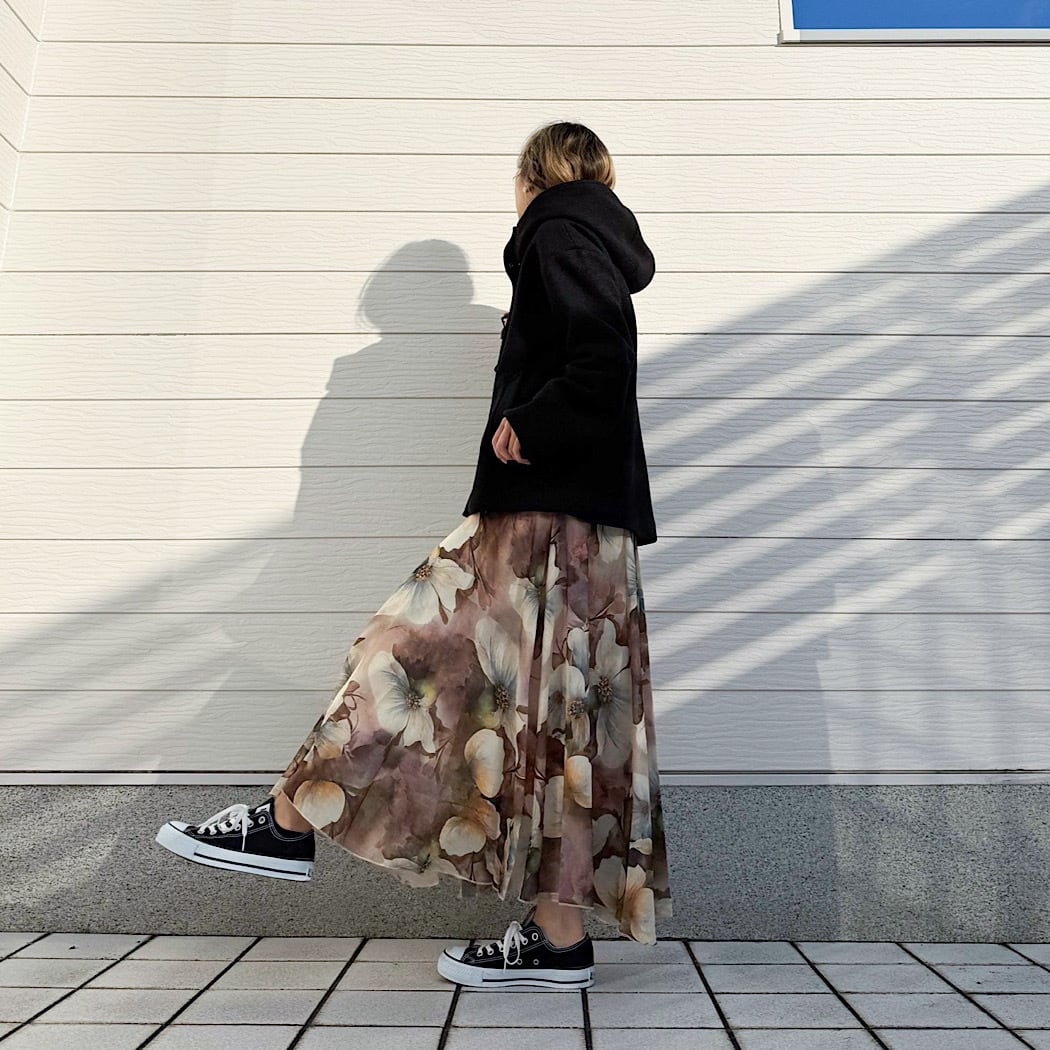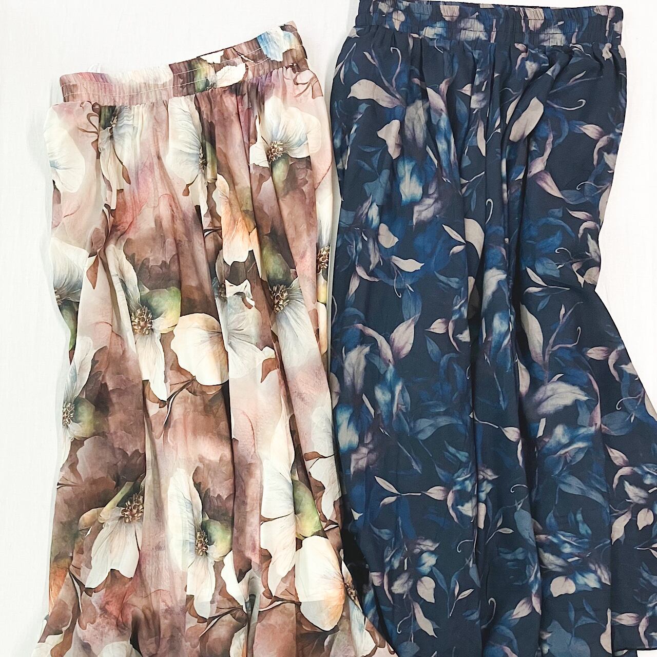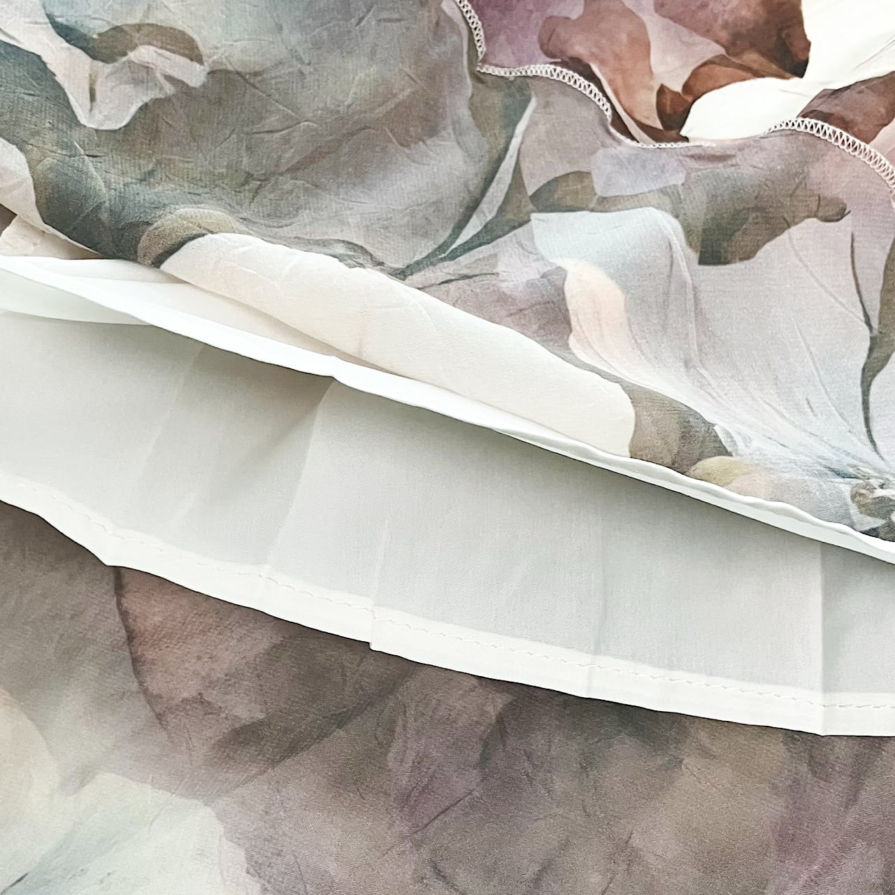 水彩画のように滲むフラワープリントが印象的な、ニュアンス感たっぷりのフレアスカート。