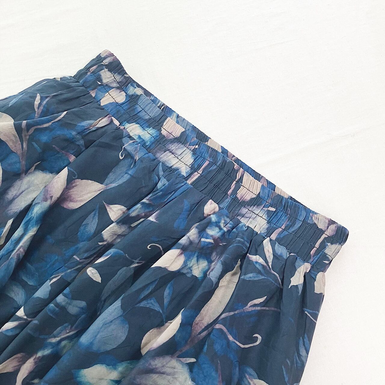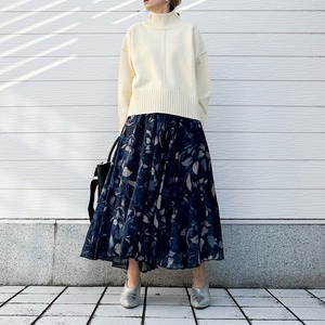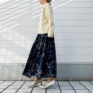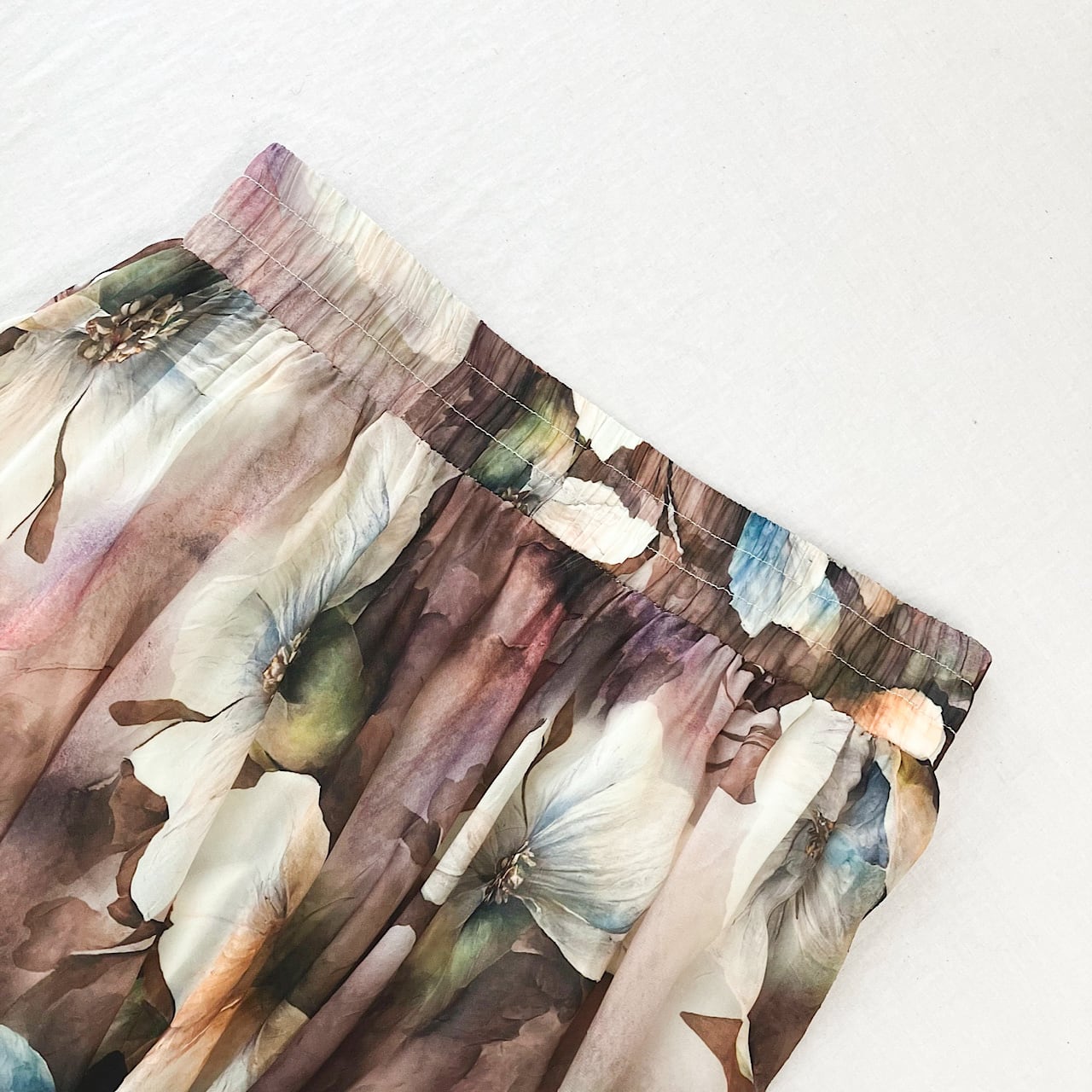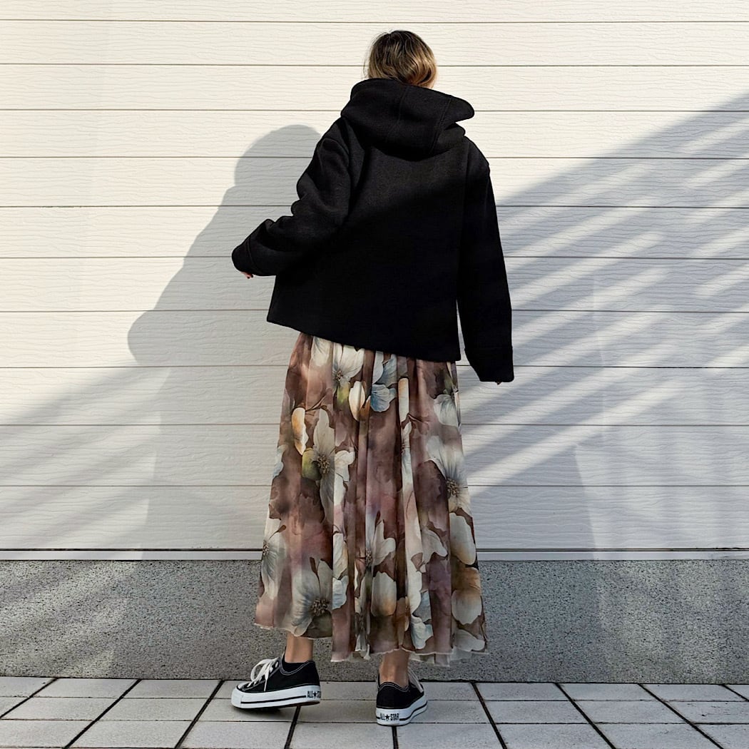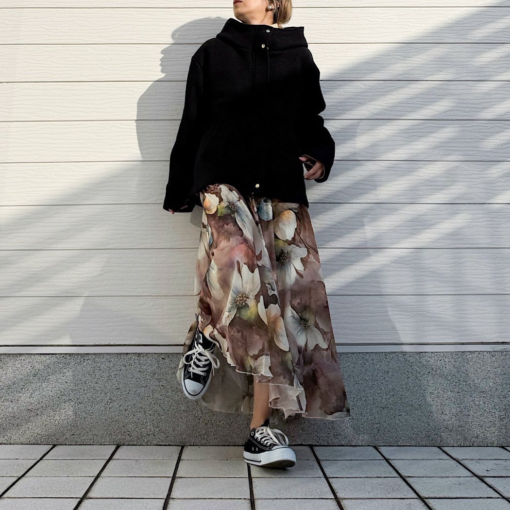 水彩画のように滲むフラワープリントが印象的な、ニュアンス感たっぷりのフレアスカート。