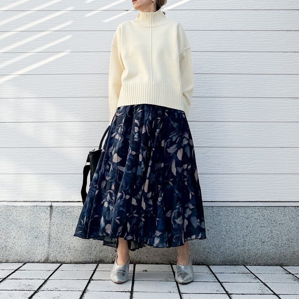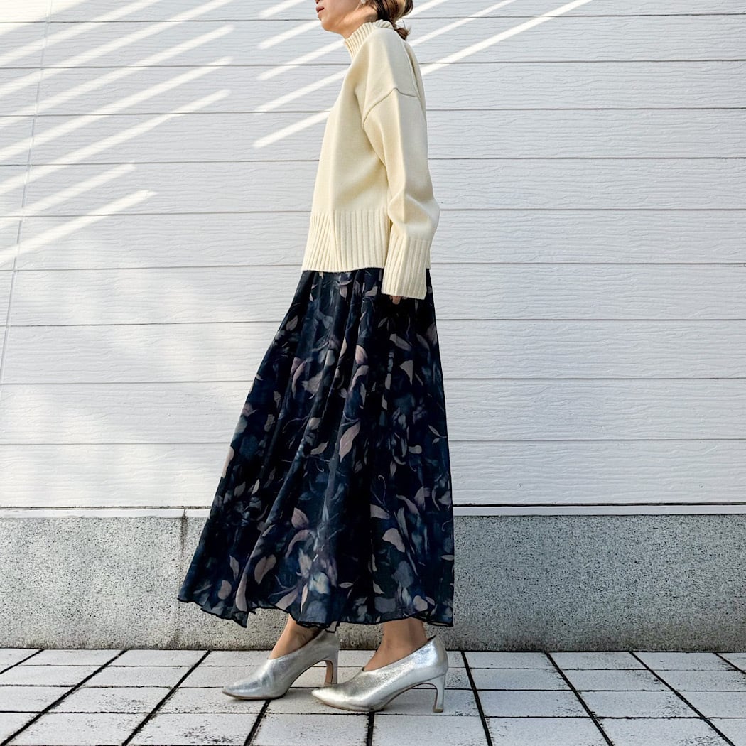 軽やかに揺れる素材感と、程よく分量感のあるフレアシルエットが、歩くたびに美しいラインを演出してくれます。