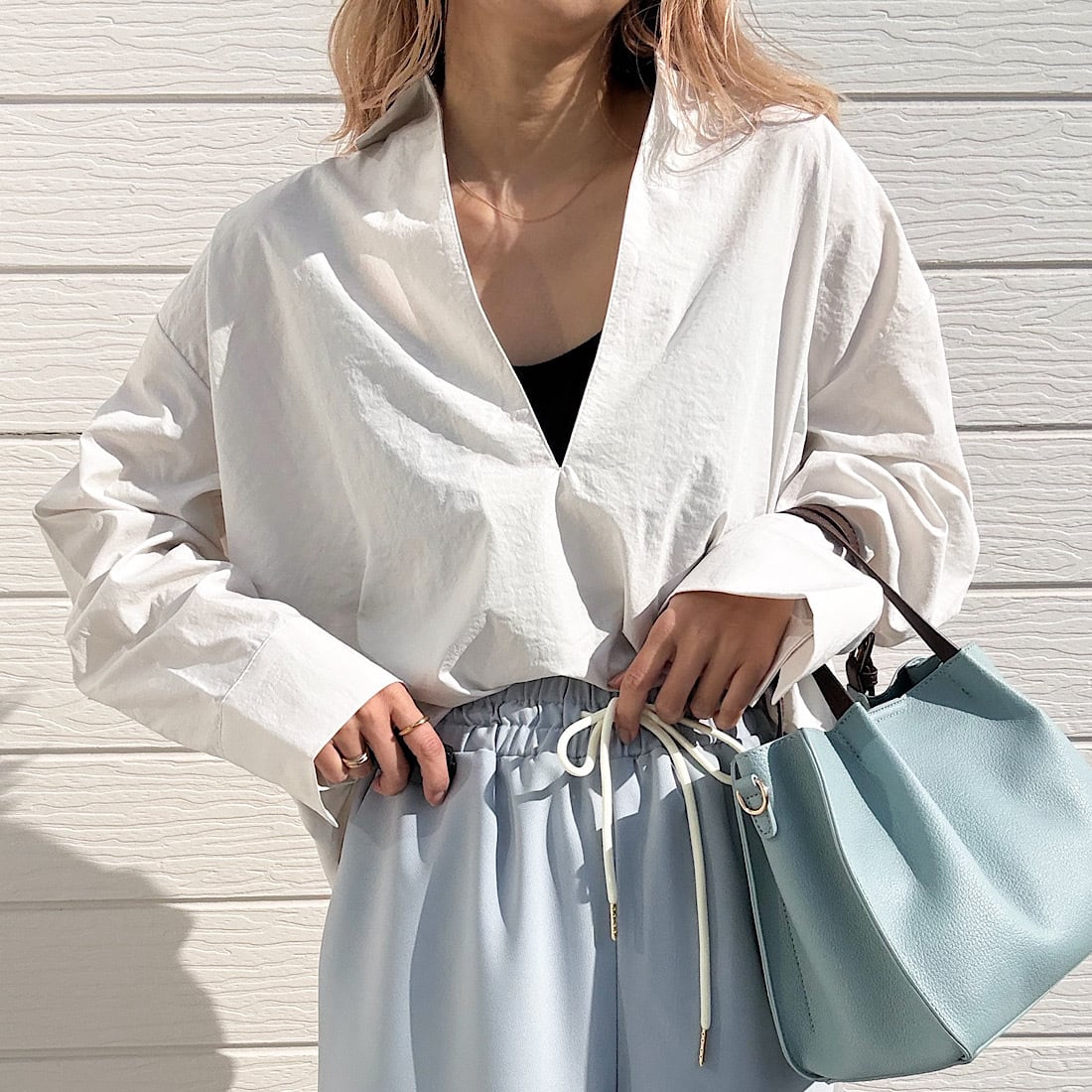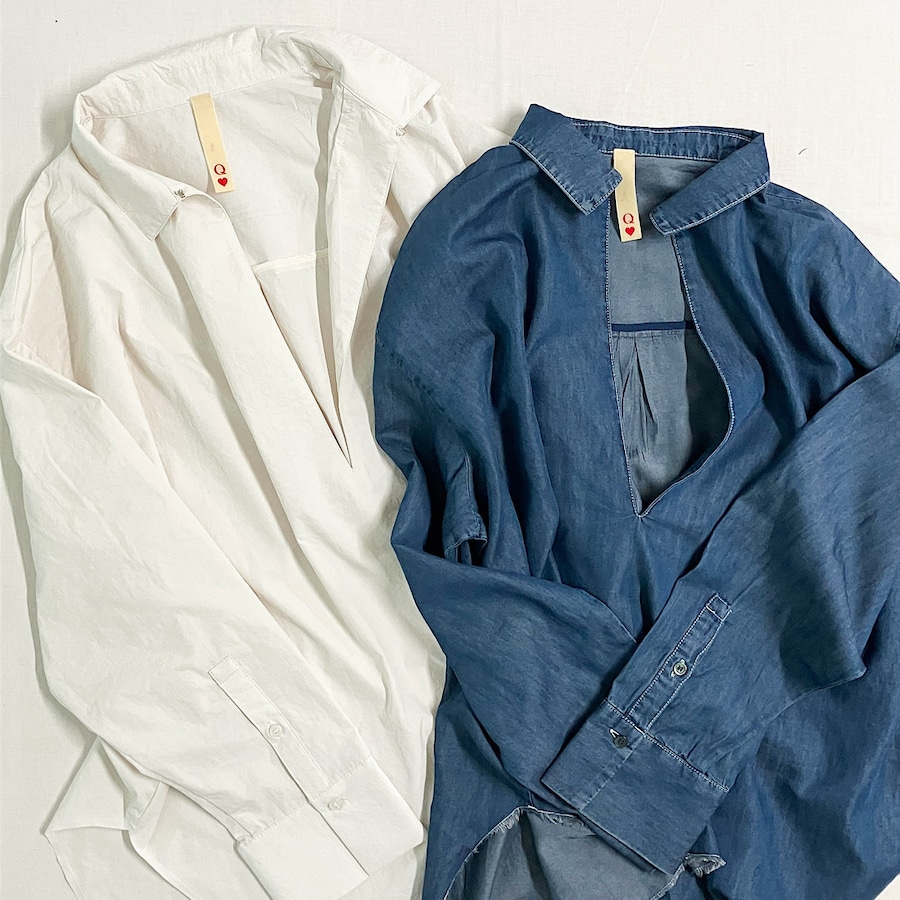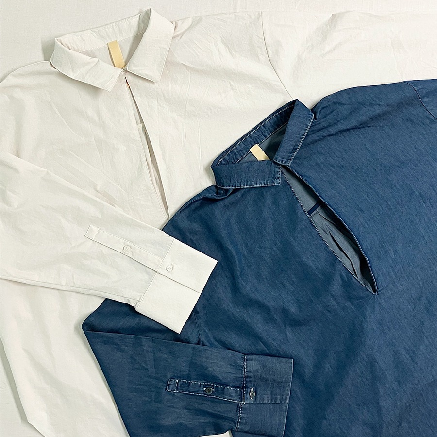 ブルーはテンセルデニム、白はポリエステルのエアフロー加工入りの生地を使用したスキッパーシャツです。