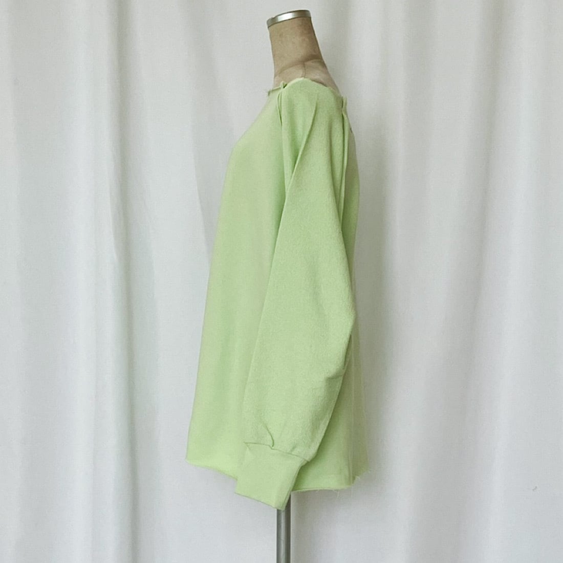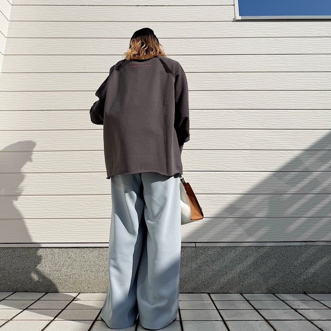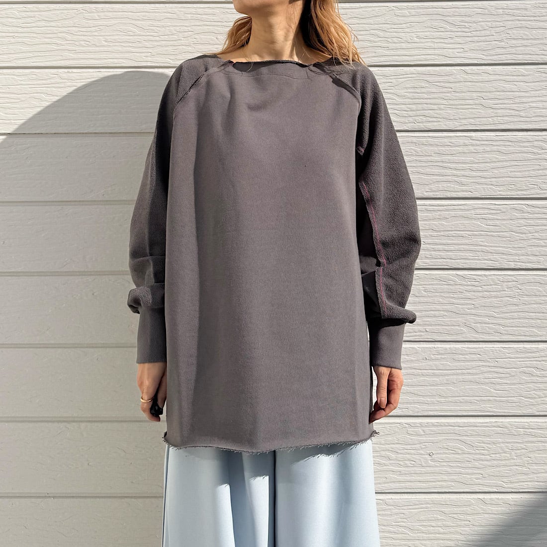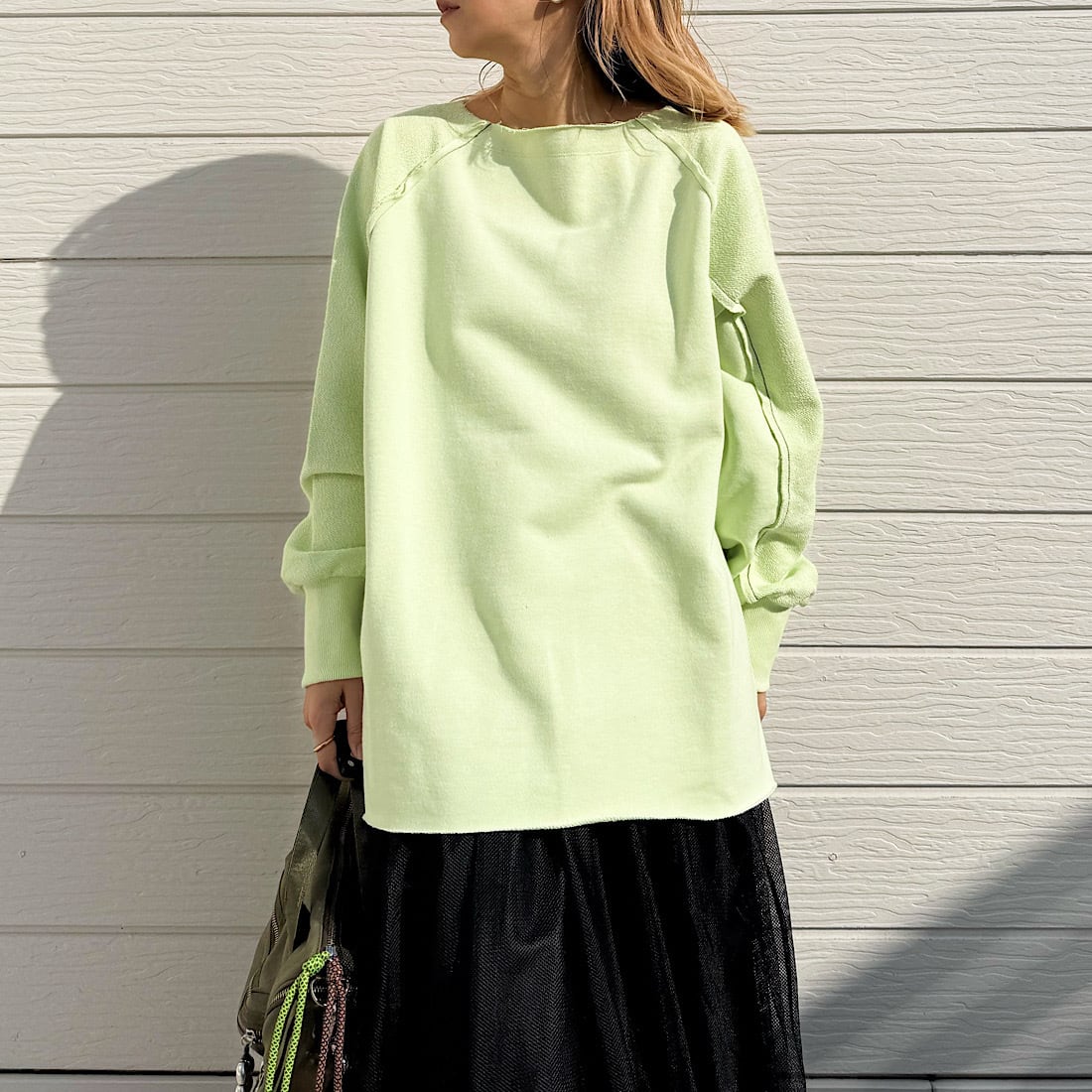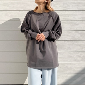 ラグラン切り替えでお袖から下は裏の生地をテレコで使用している軽めの裏毛トップスです。