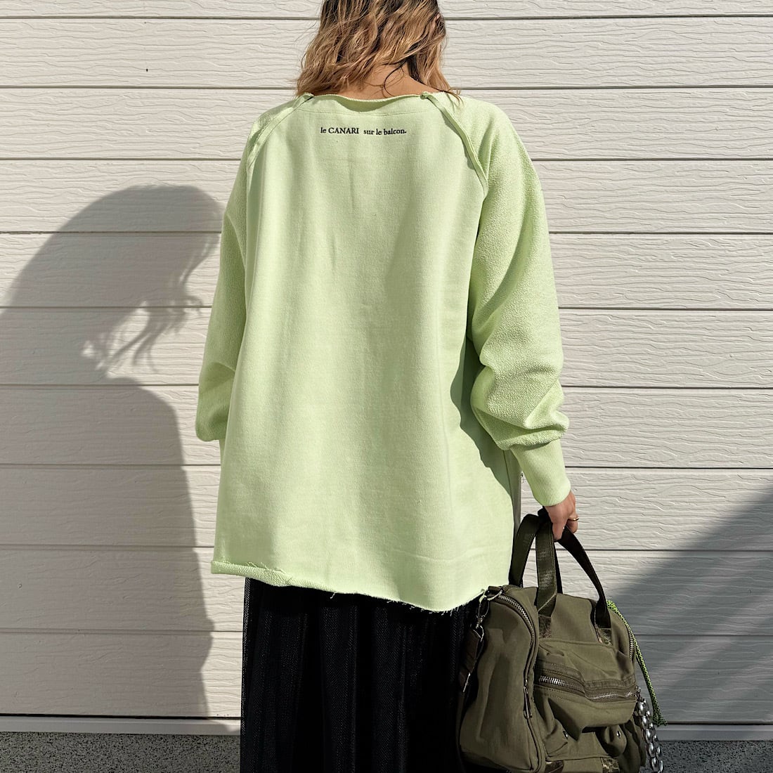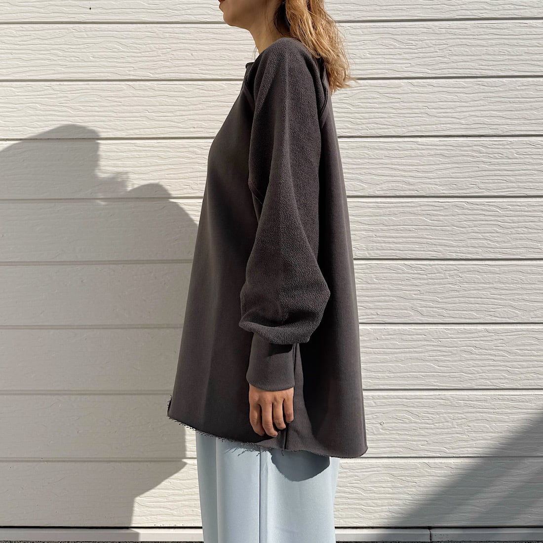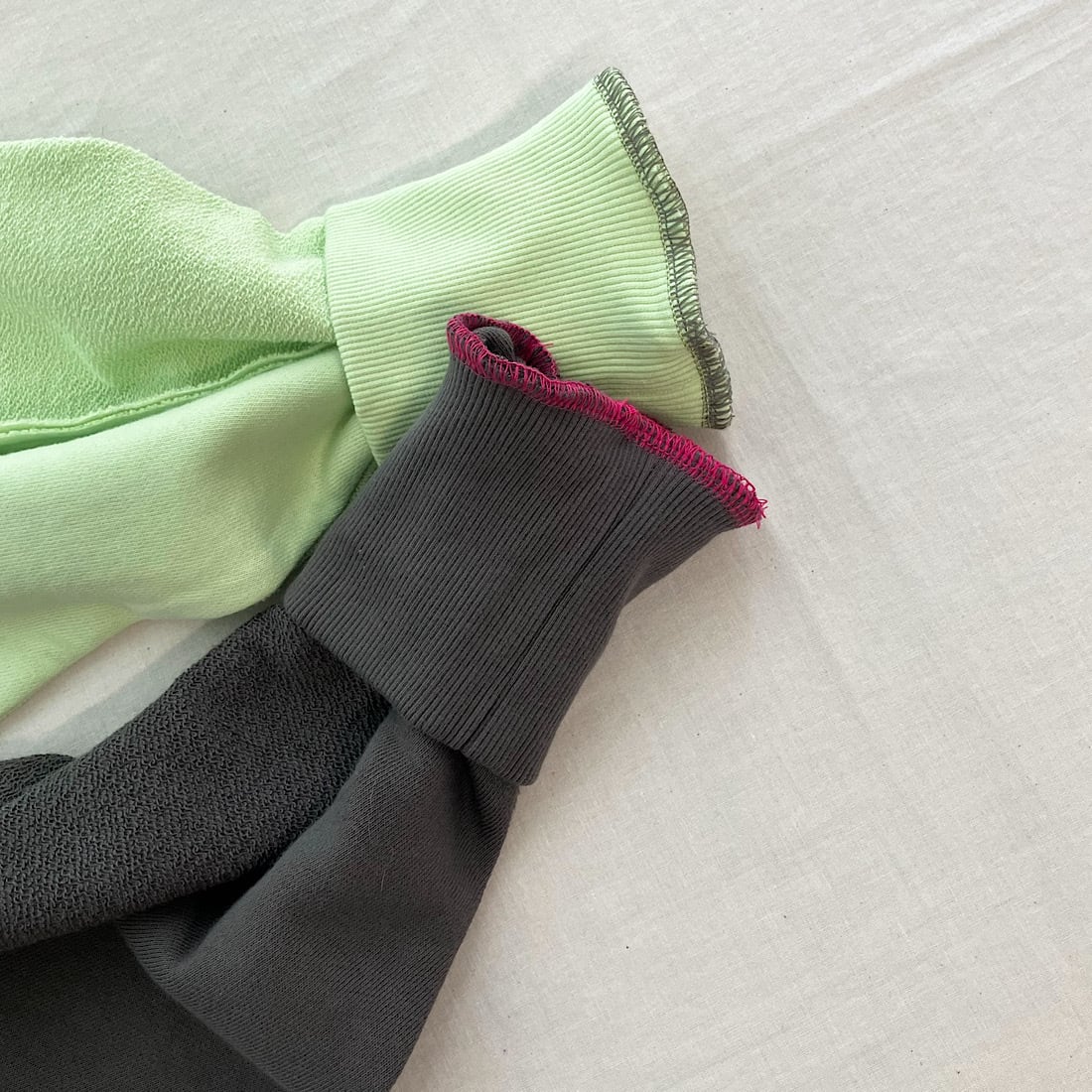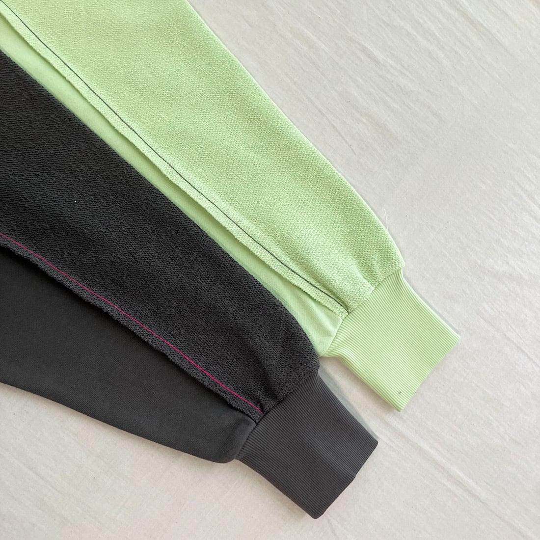 ラグラン切り替えでお袖から下は裏の生地をテレコで使用している軽めの裏毛トップスです。