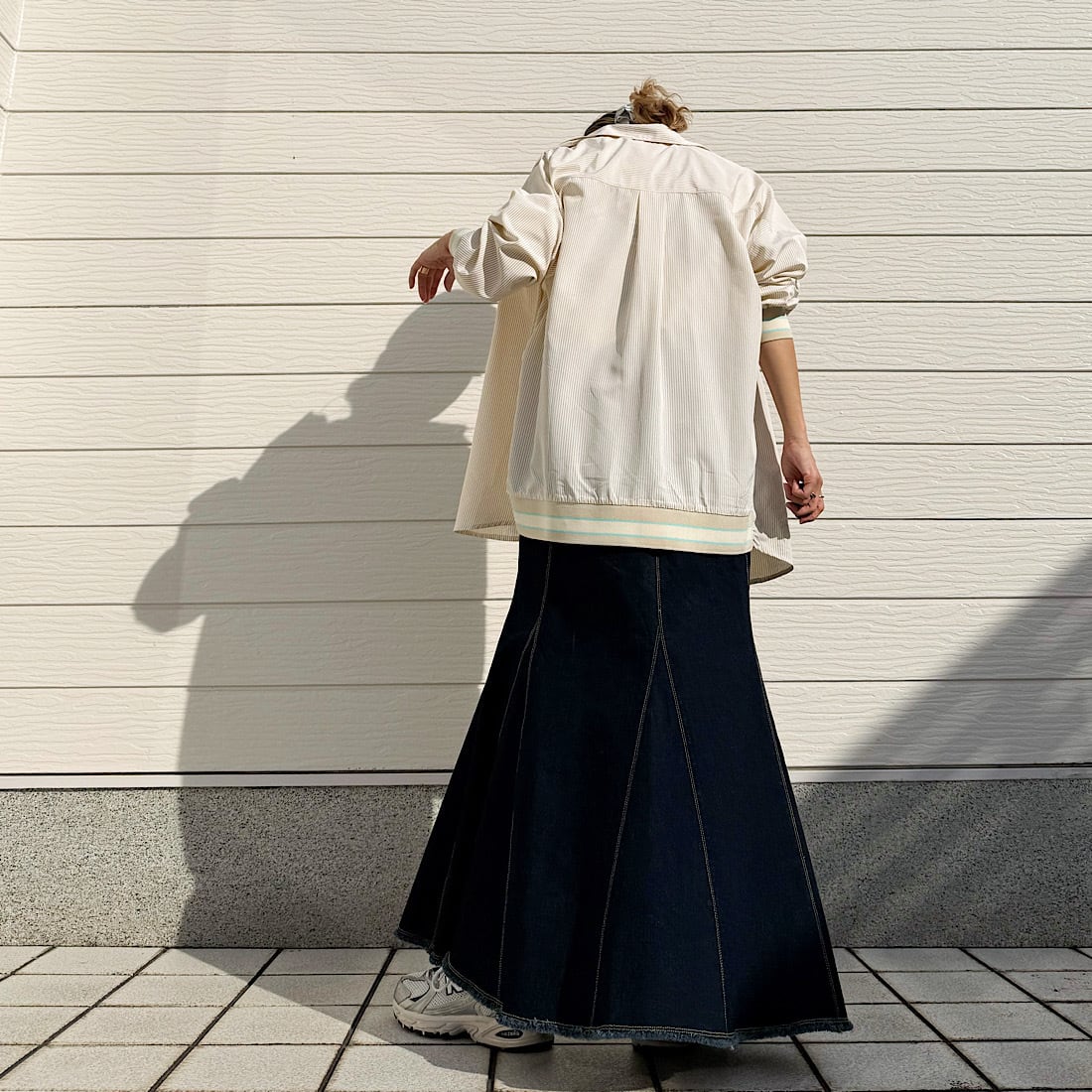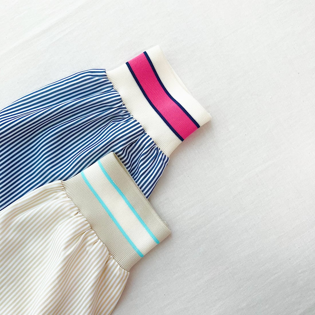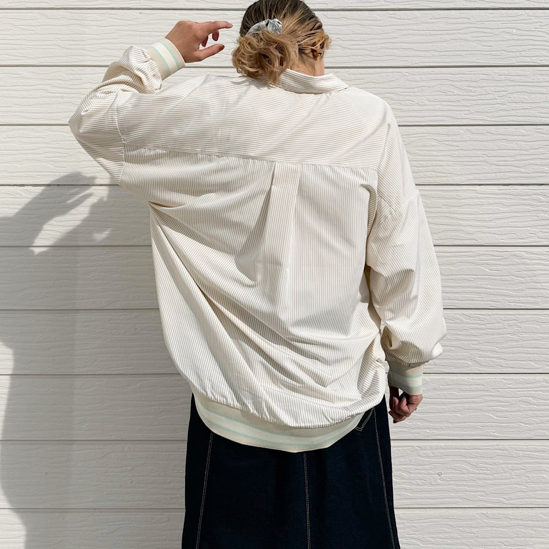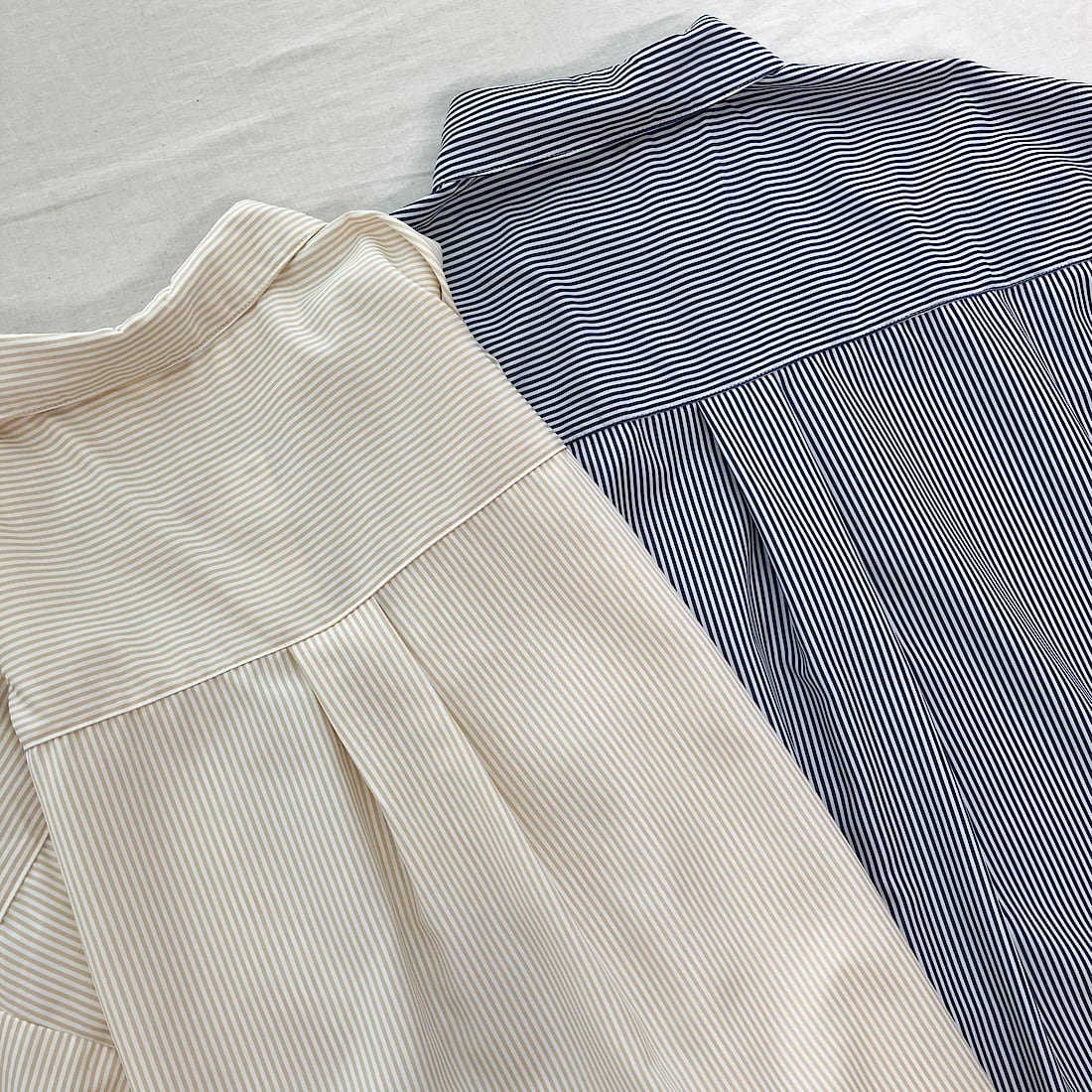 ストライプは細いピッチのものを使用しているので、カジュアルなポイントを入れながらも上品な雰囲気に仕上がっています。