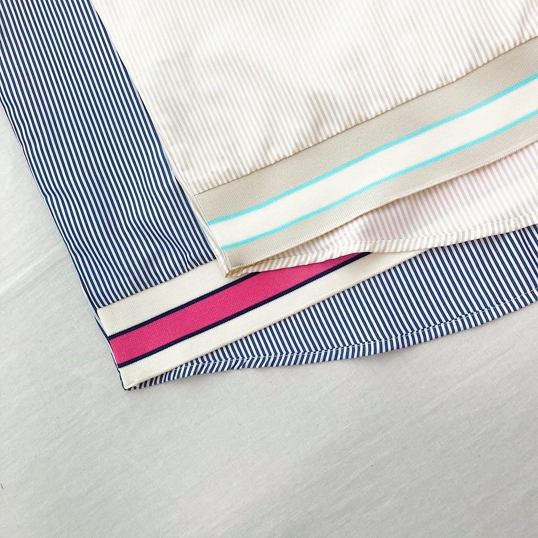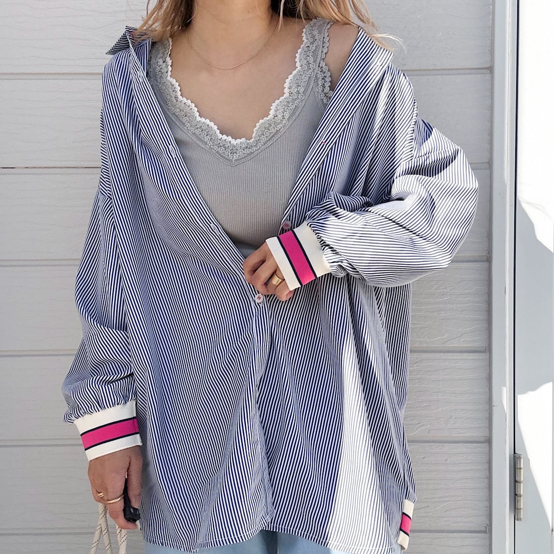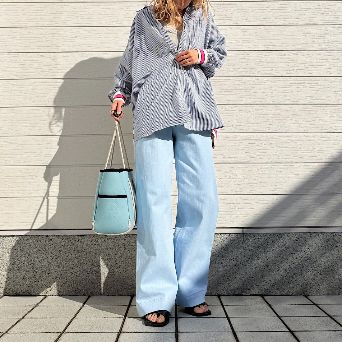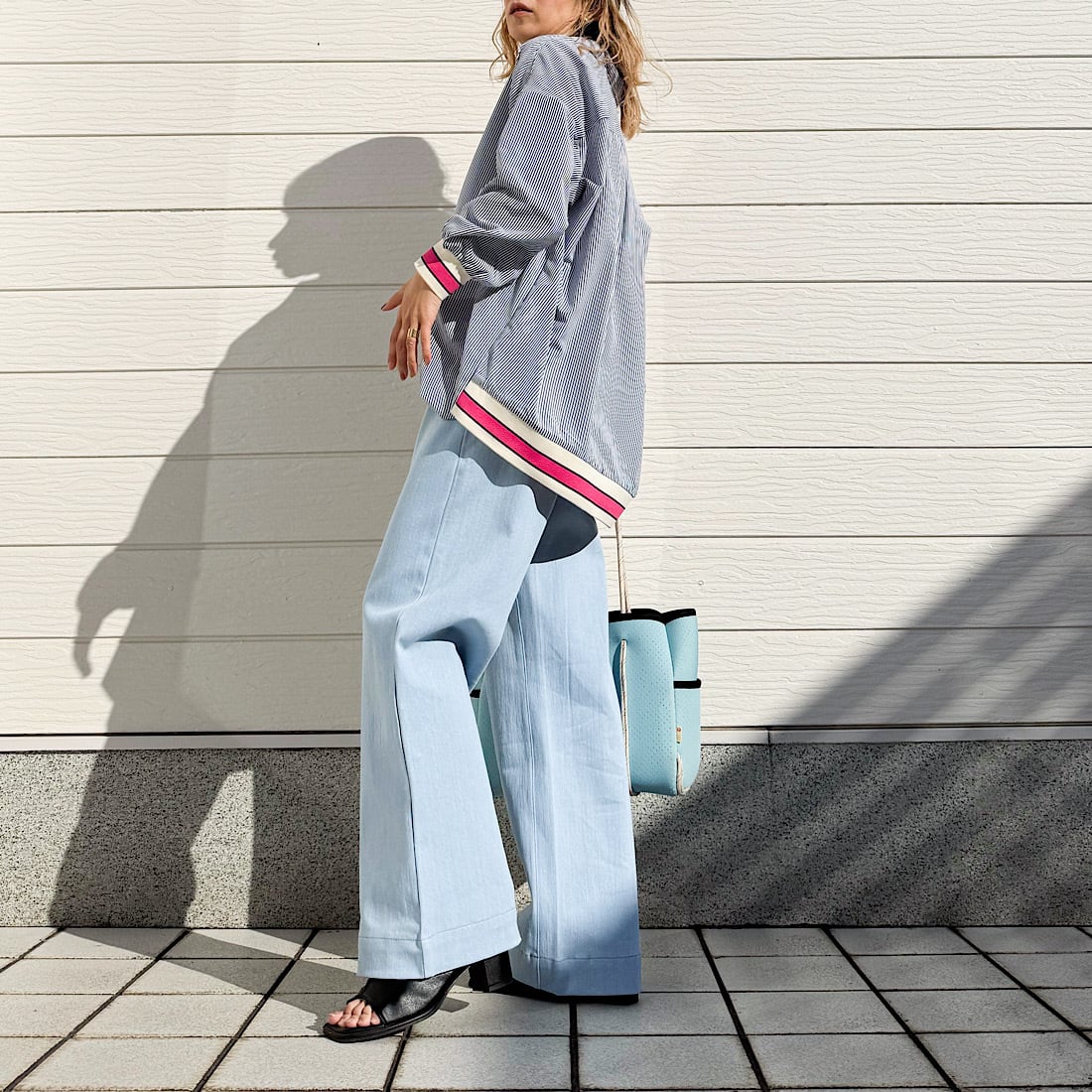 ストライプは細いピッチのものを使用しているので、カジュアルなポイントを入れながらも上品な雰囲気に仕上がっています。