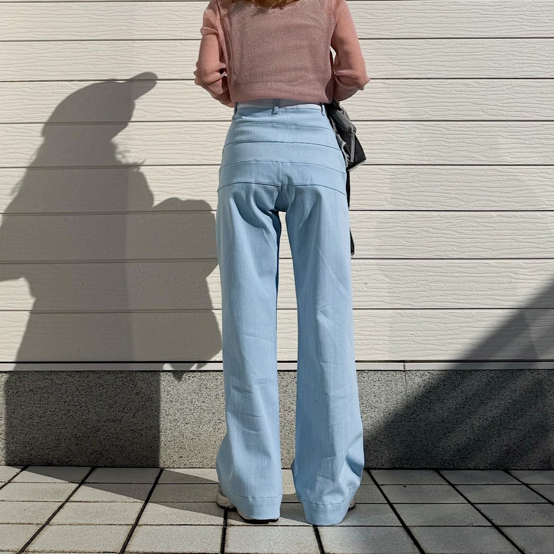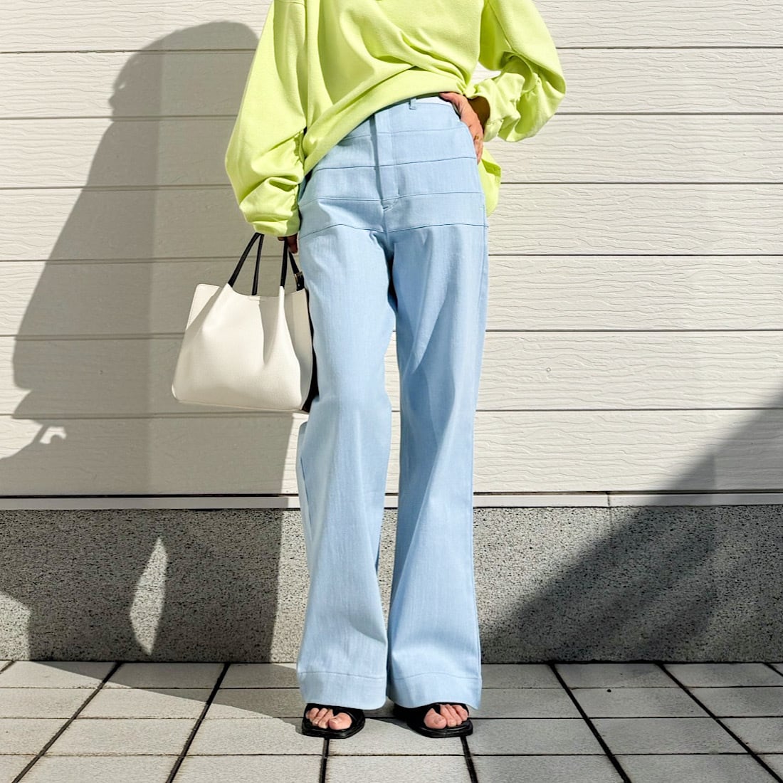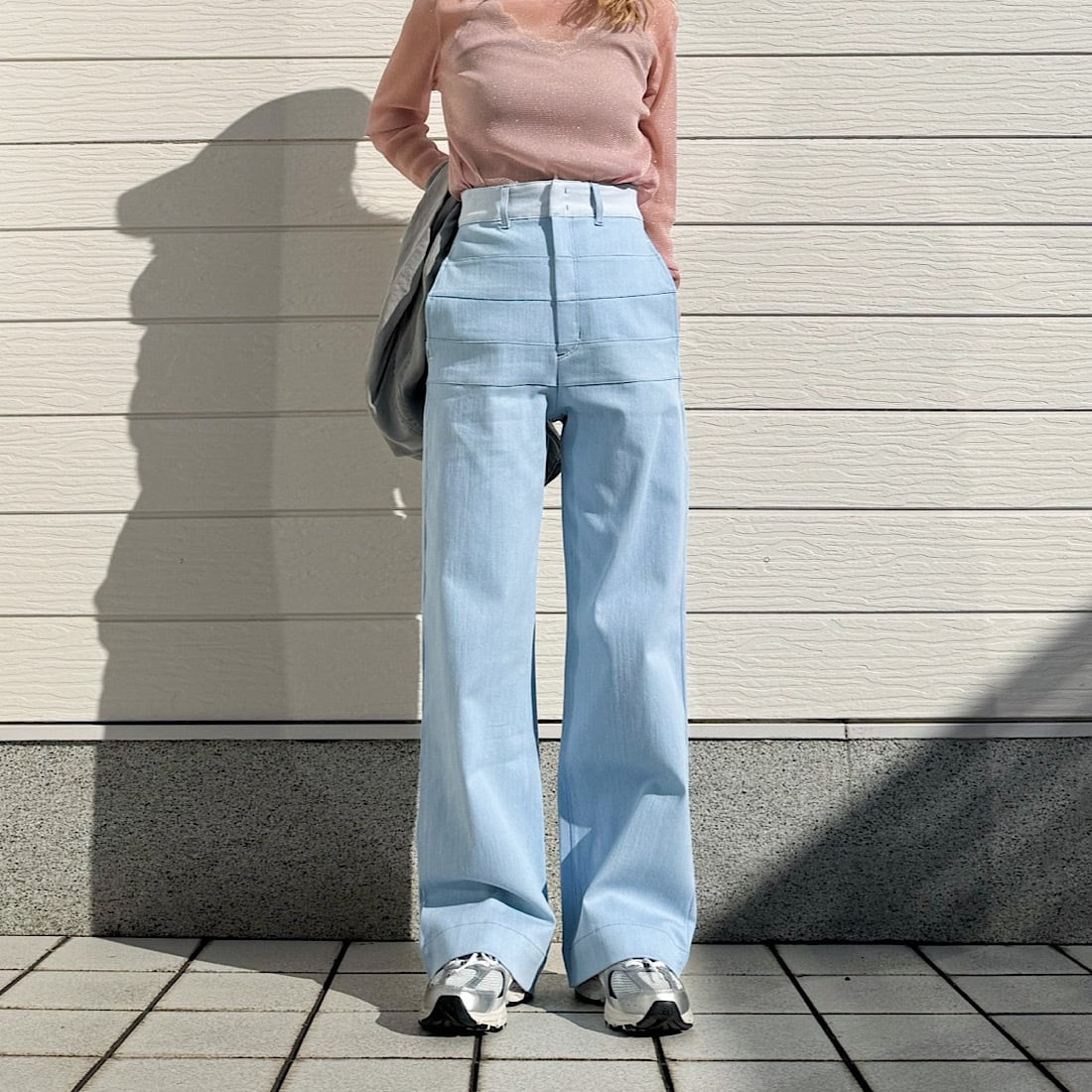 腰回りにボーダーのような切替えが入った、ワイドデニムです。