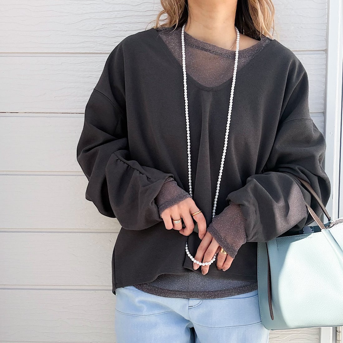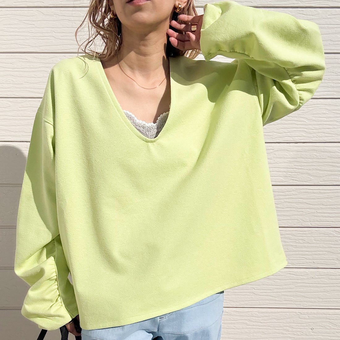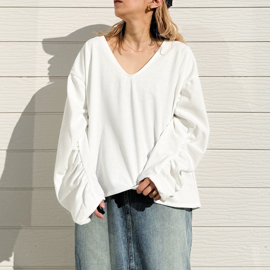 ブークレ糸とダンボールニットの生地を組み合わせた表面感ある深めのVネックトップスです。