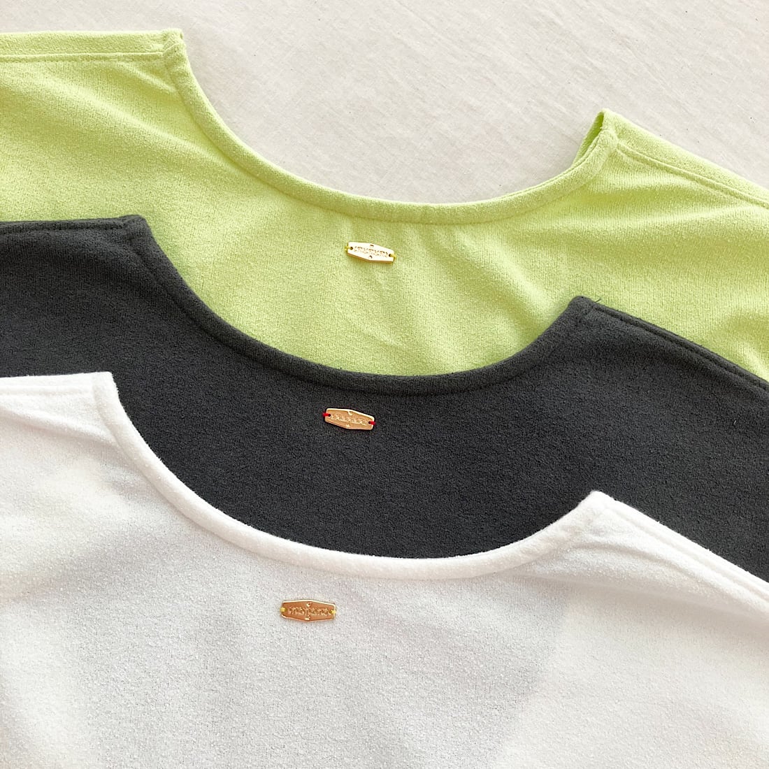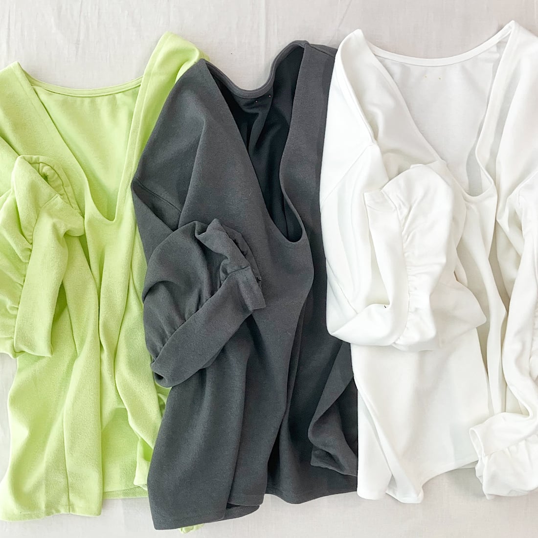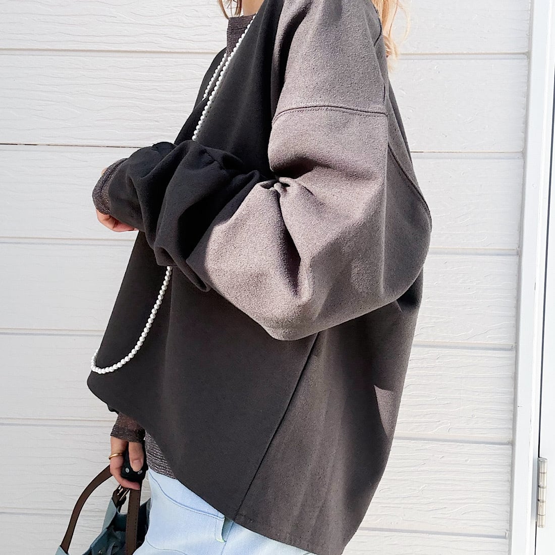 ブークレ糸とダンボールニットの生地を組み合わせた表面感ある深めのVネックトップスです。