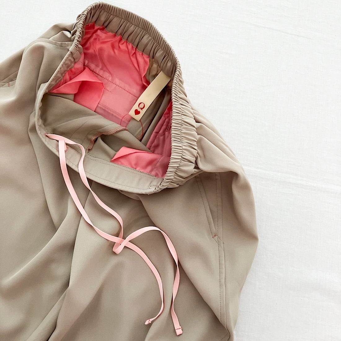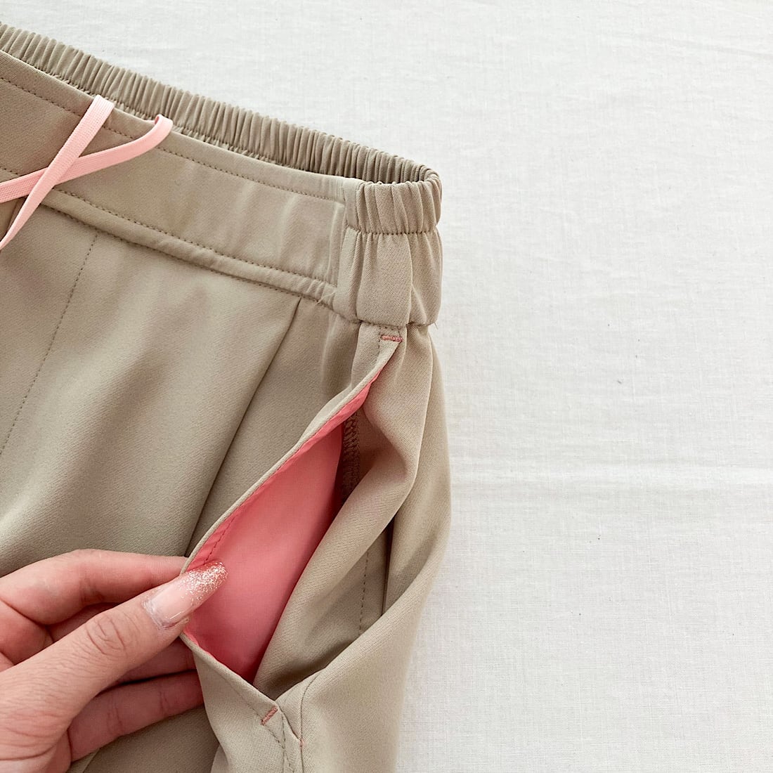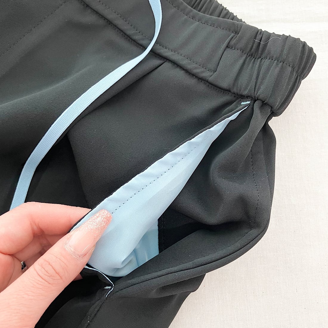 ウエストはゴム仕様に加え、内側には調整用の紐も備わっており、サイズ感を調整できるのが嬉しいポイント◎