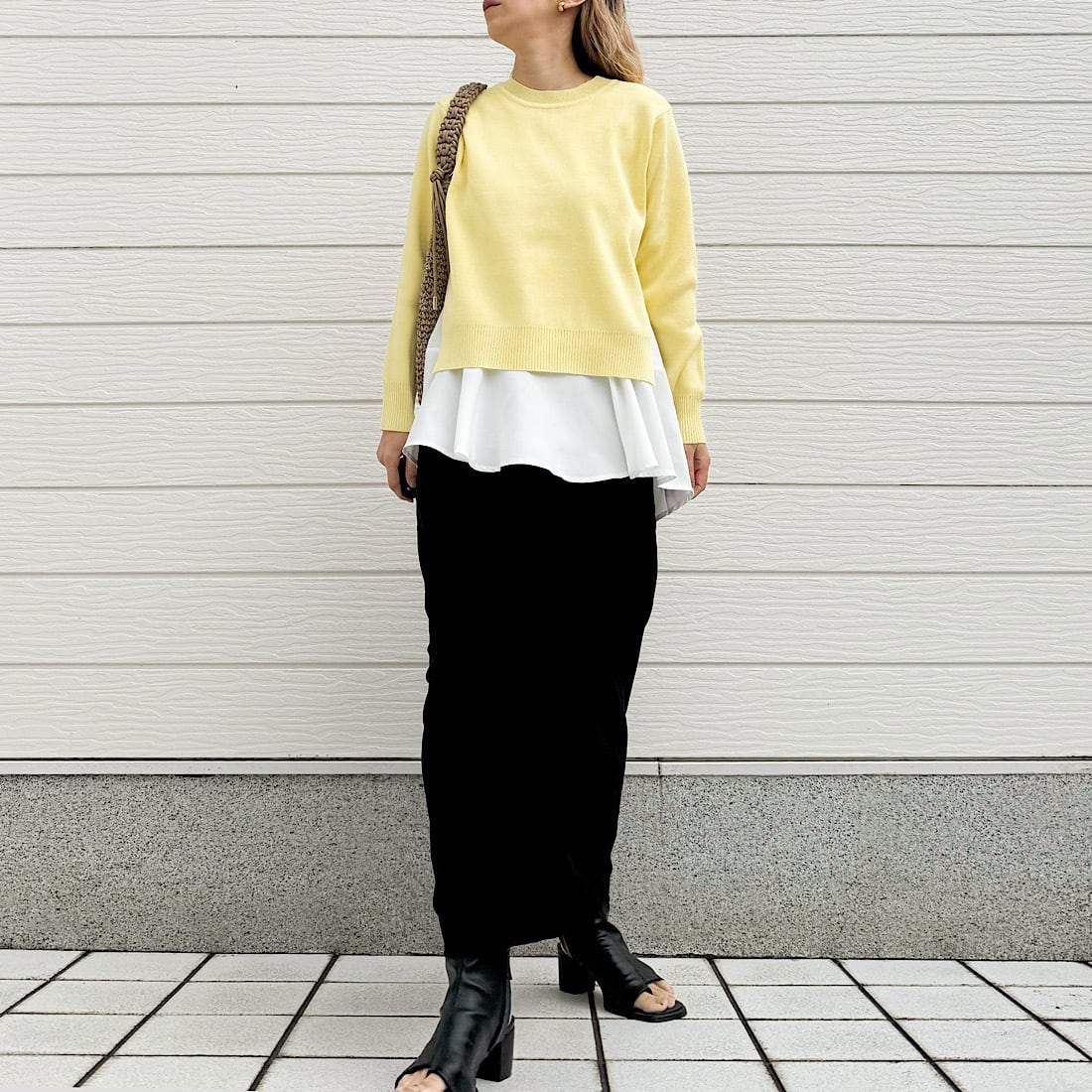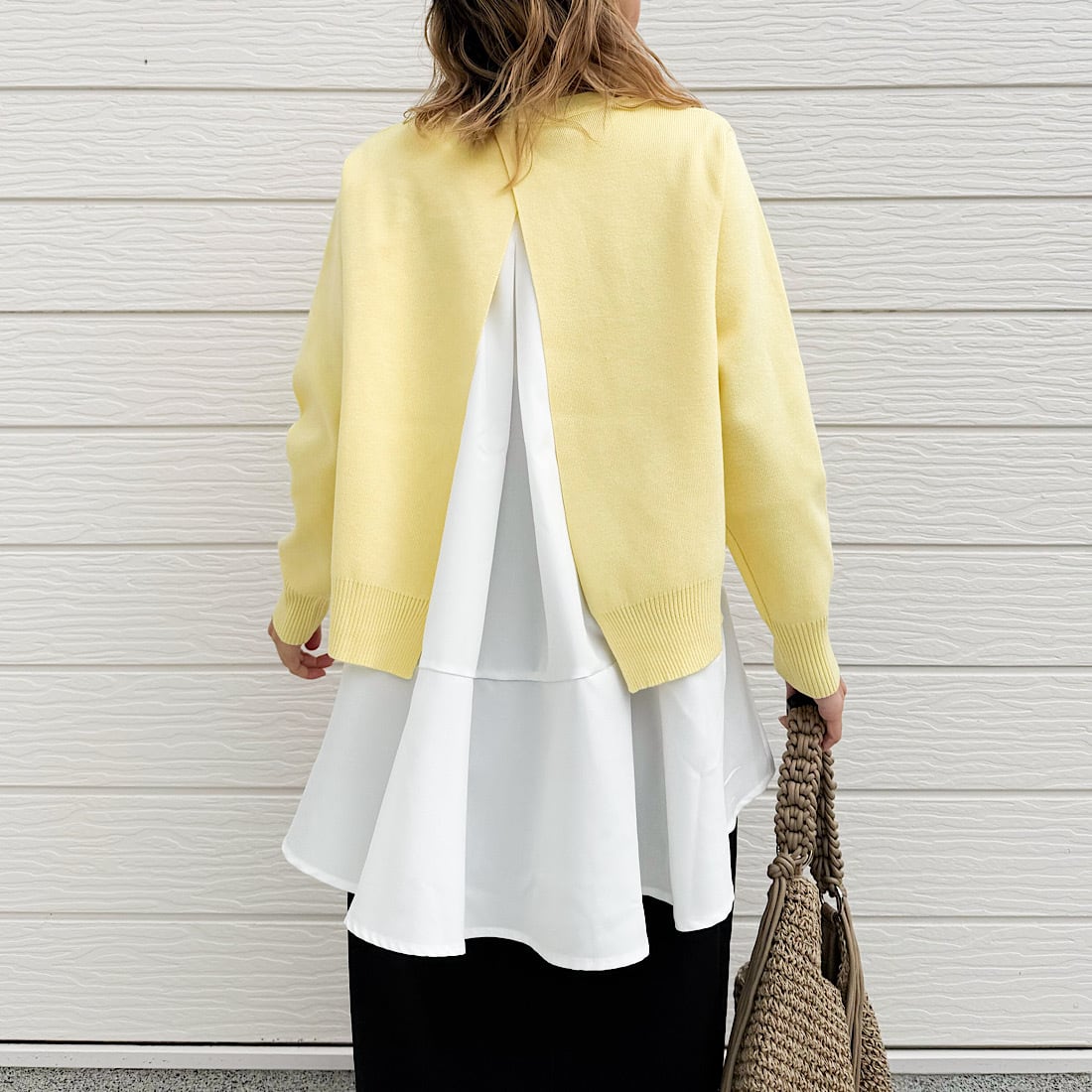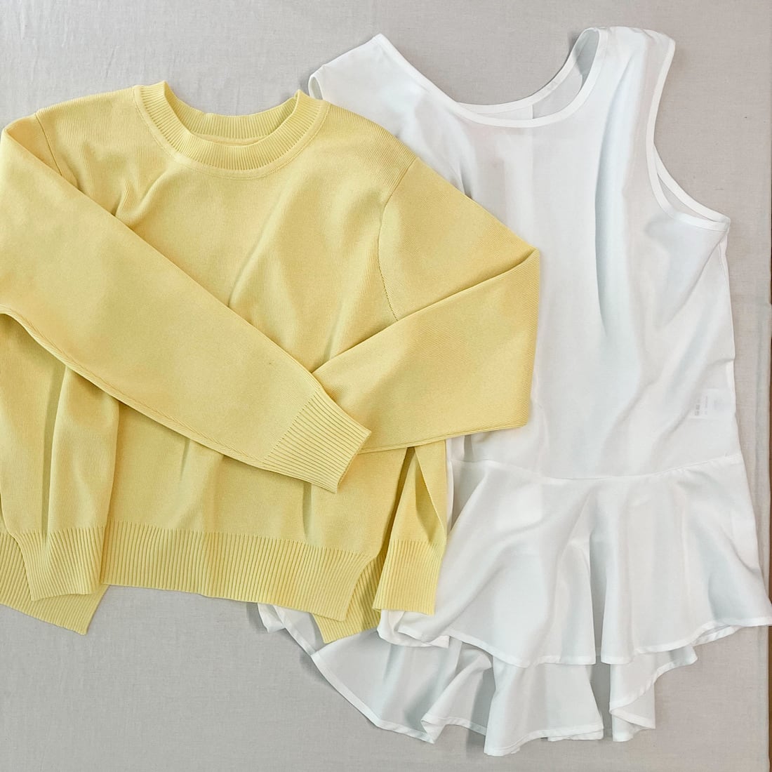 やわらかなニットに、裾が広がるフレアタンクをドッキング。