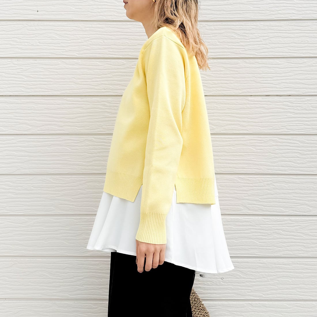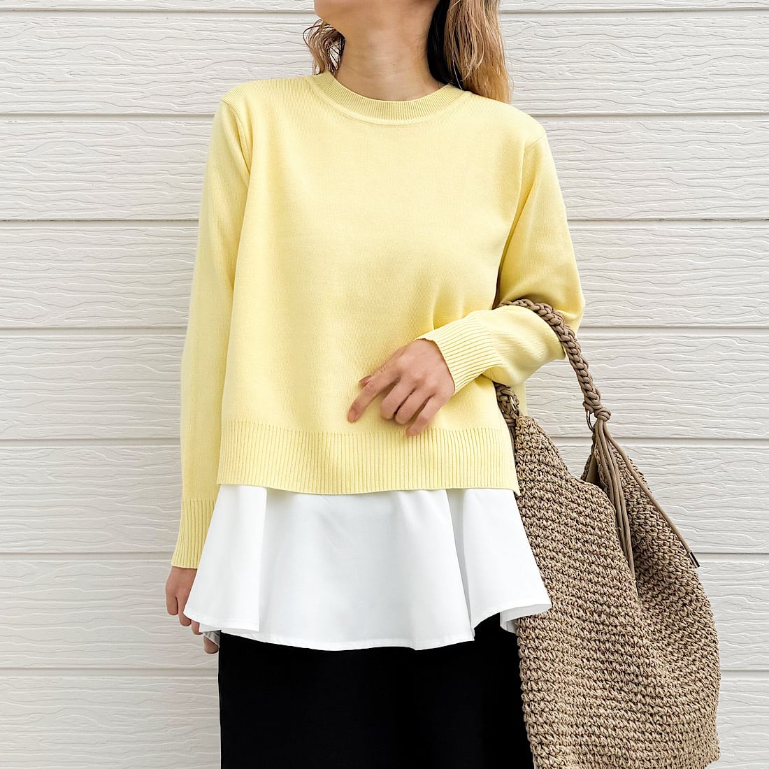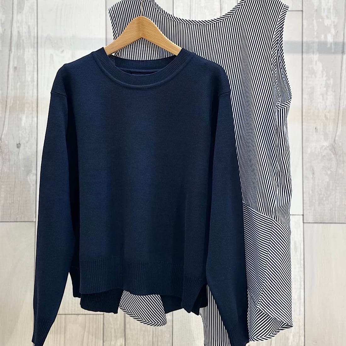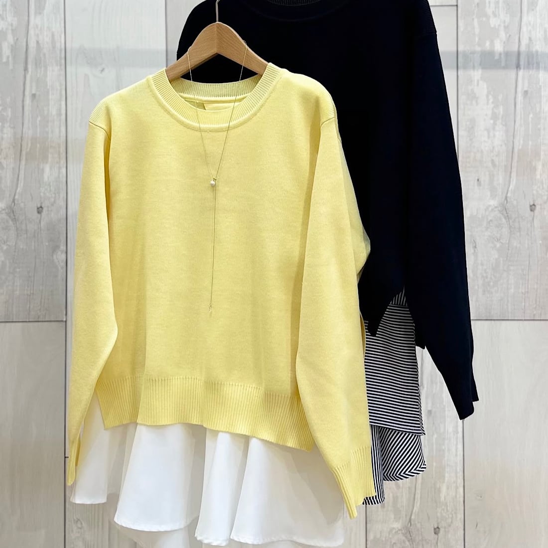 季節の変わり目に一枚で着映えを叶える、レイヤードデザインニットです。