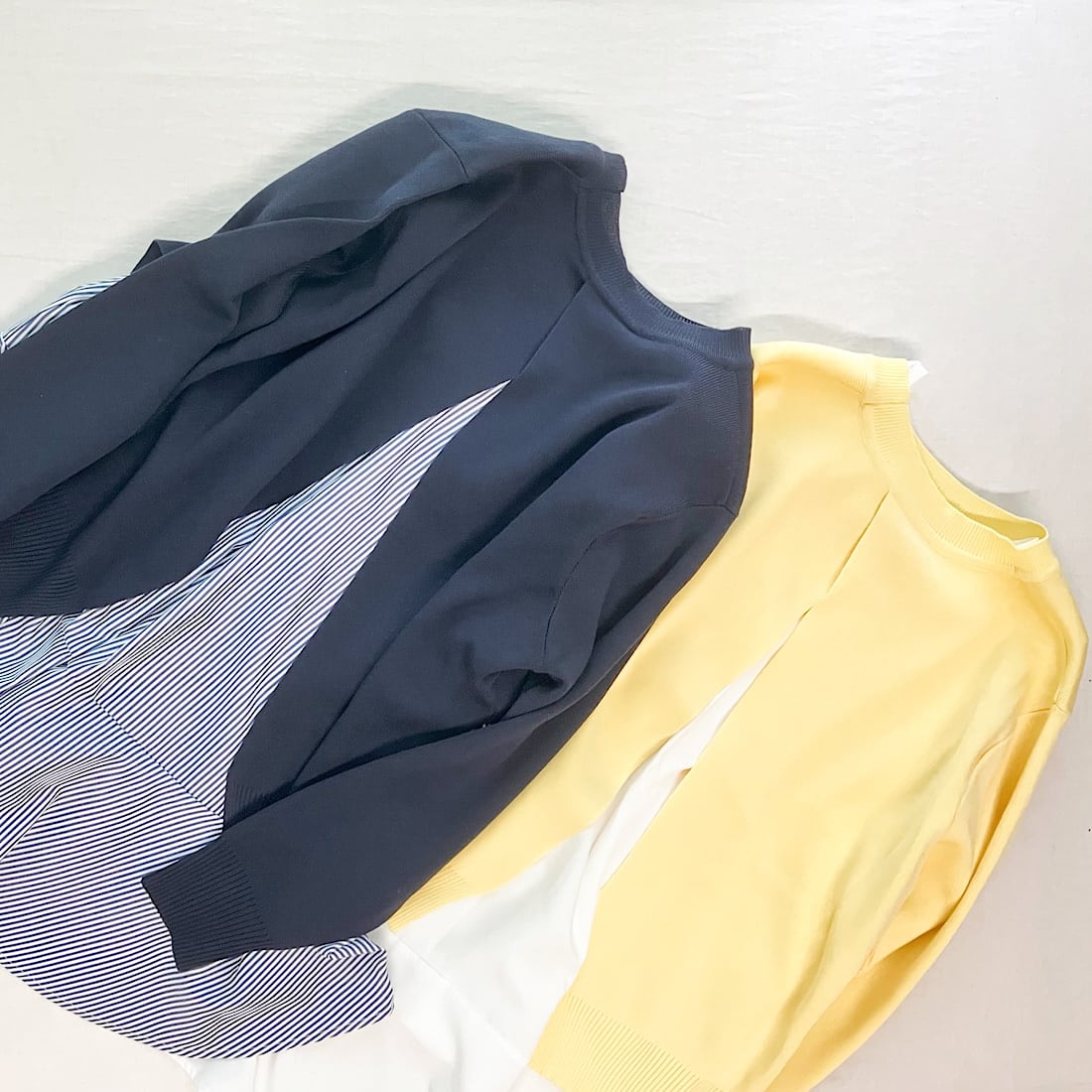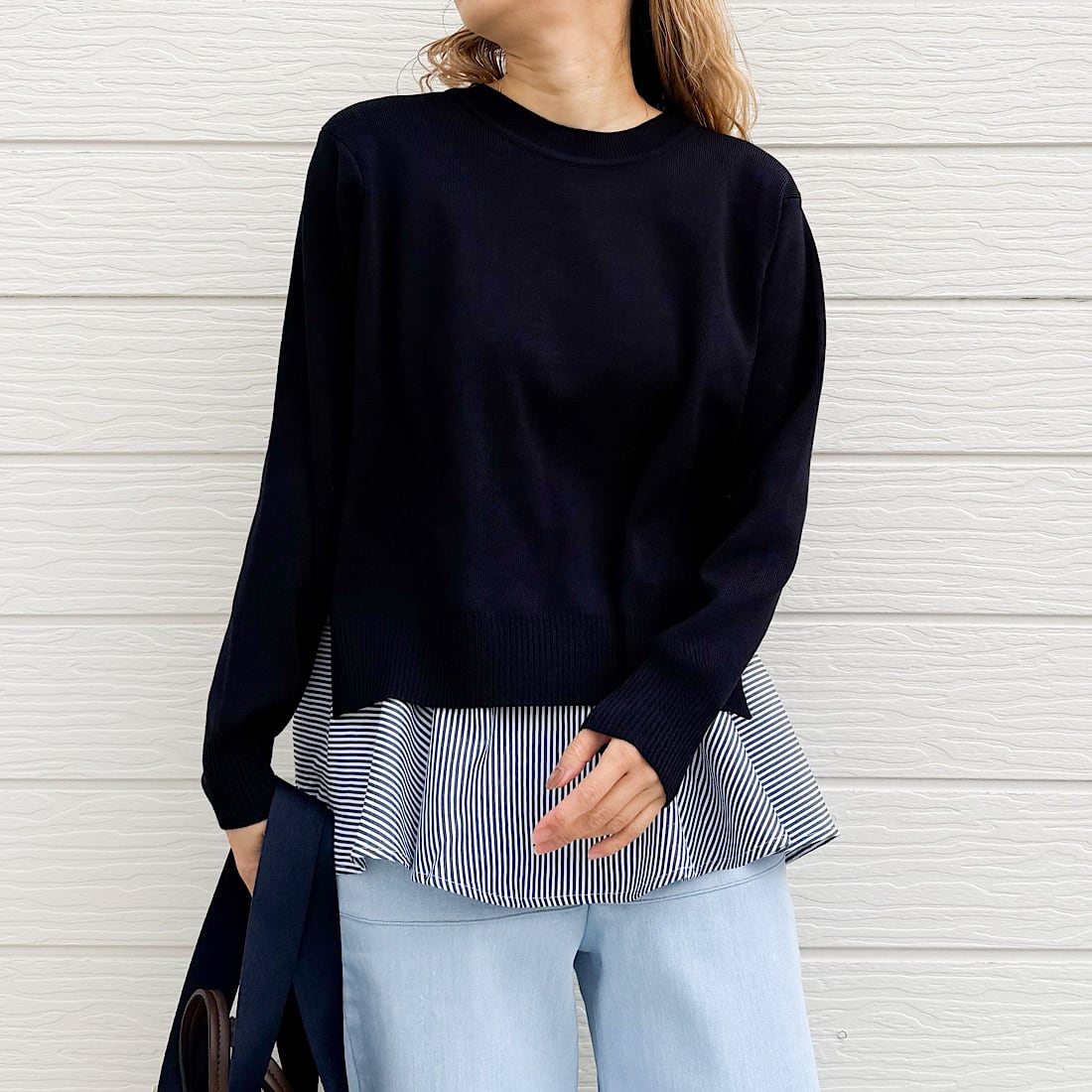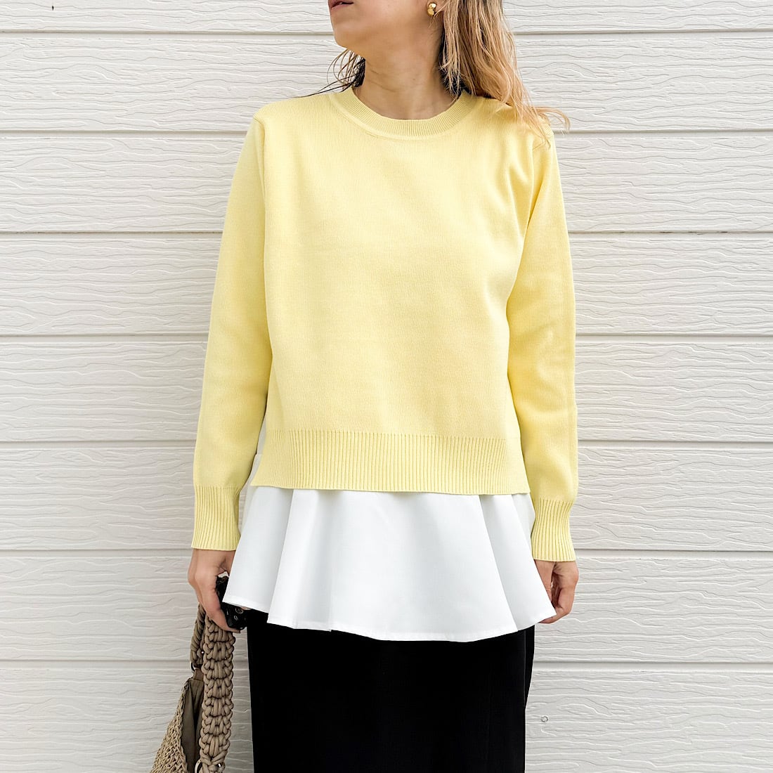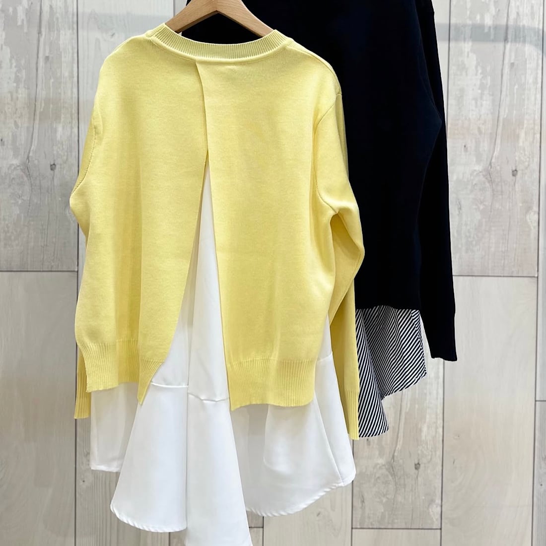 季節の変わり目に一枚で着映えを叶える、レイヤードデザインニットです。