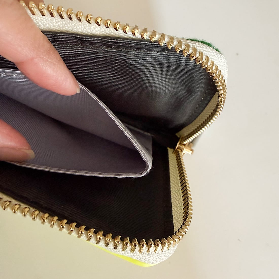 内側はコインポケットのみのシンプル設計で、お札は折って収納可能。