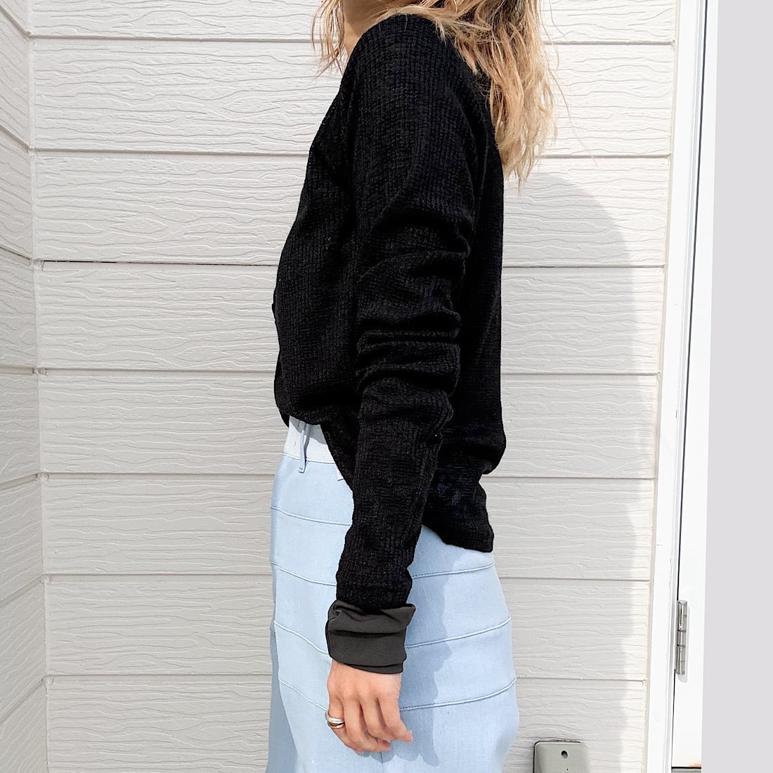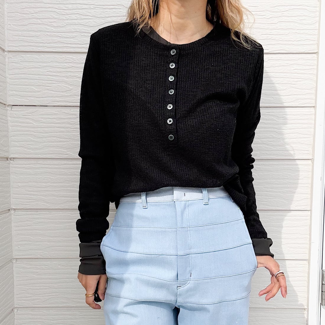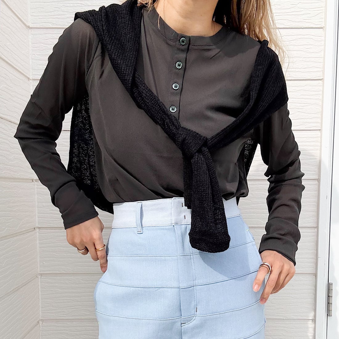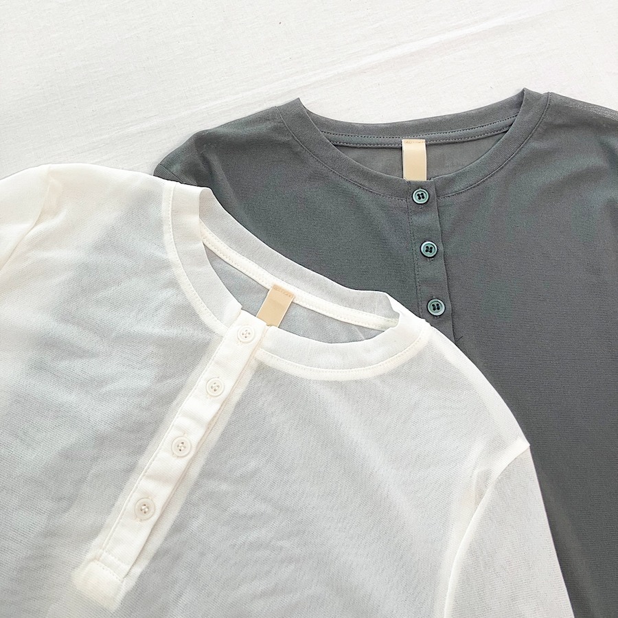 程よい透け感が魅力の、シアーヘンリートップスです。