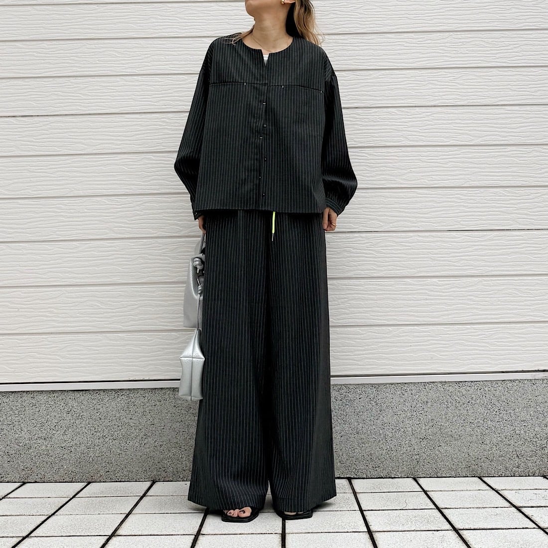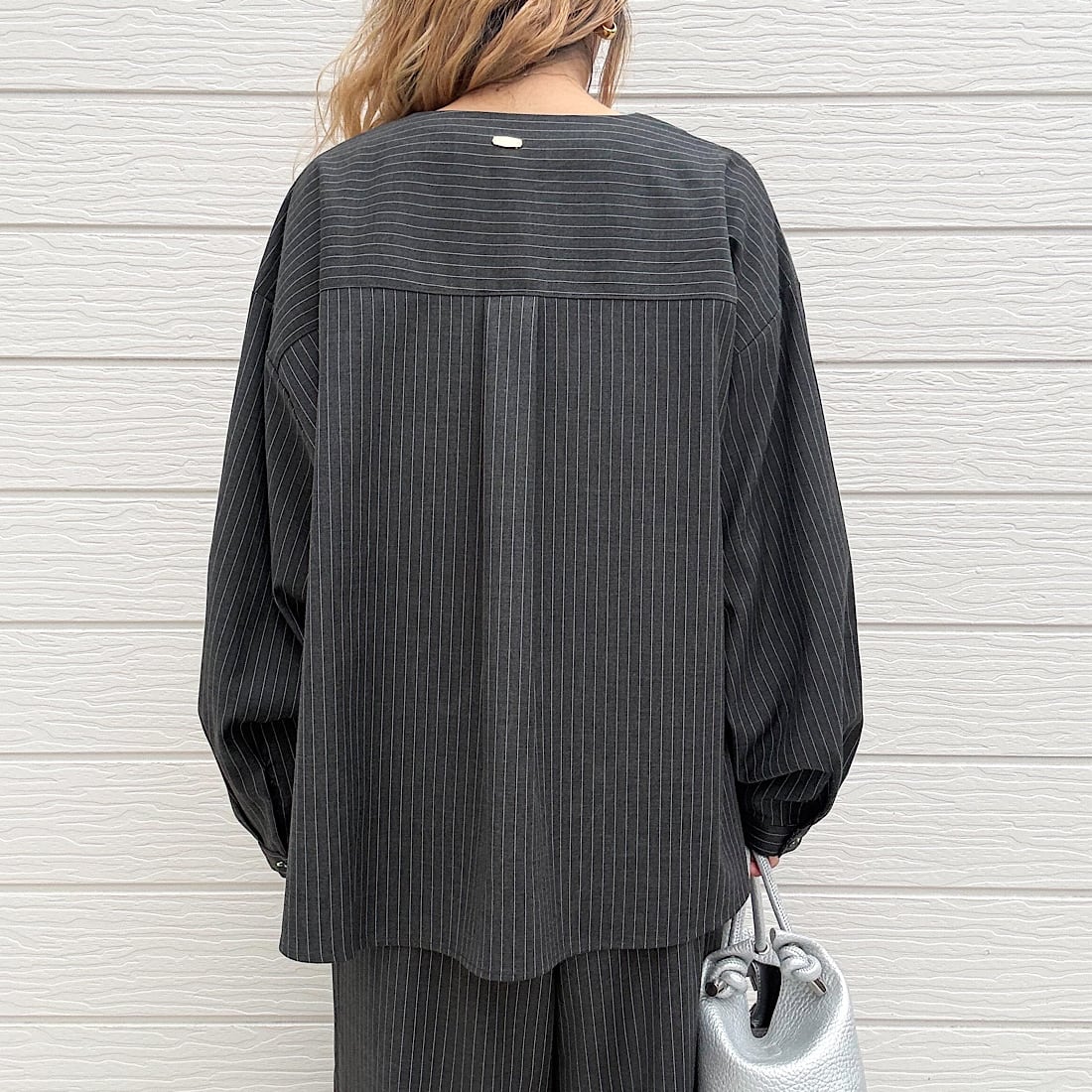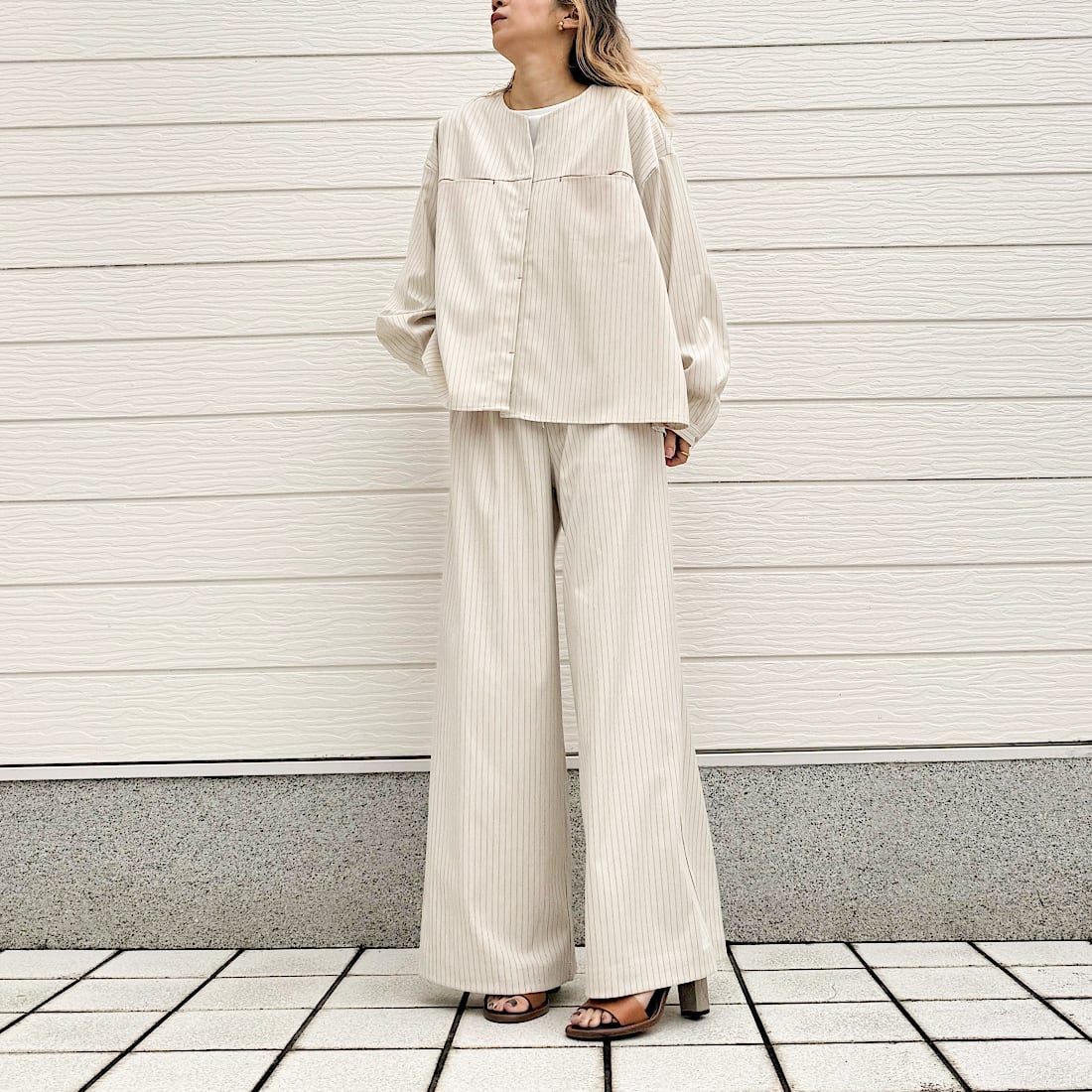繊細なピンストライプをのせたデザインは、羽織るだけで顔周りをパッと明るく、洗練された印象になります。