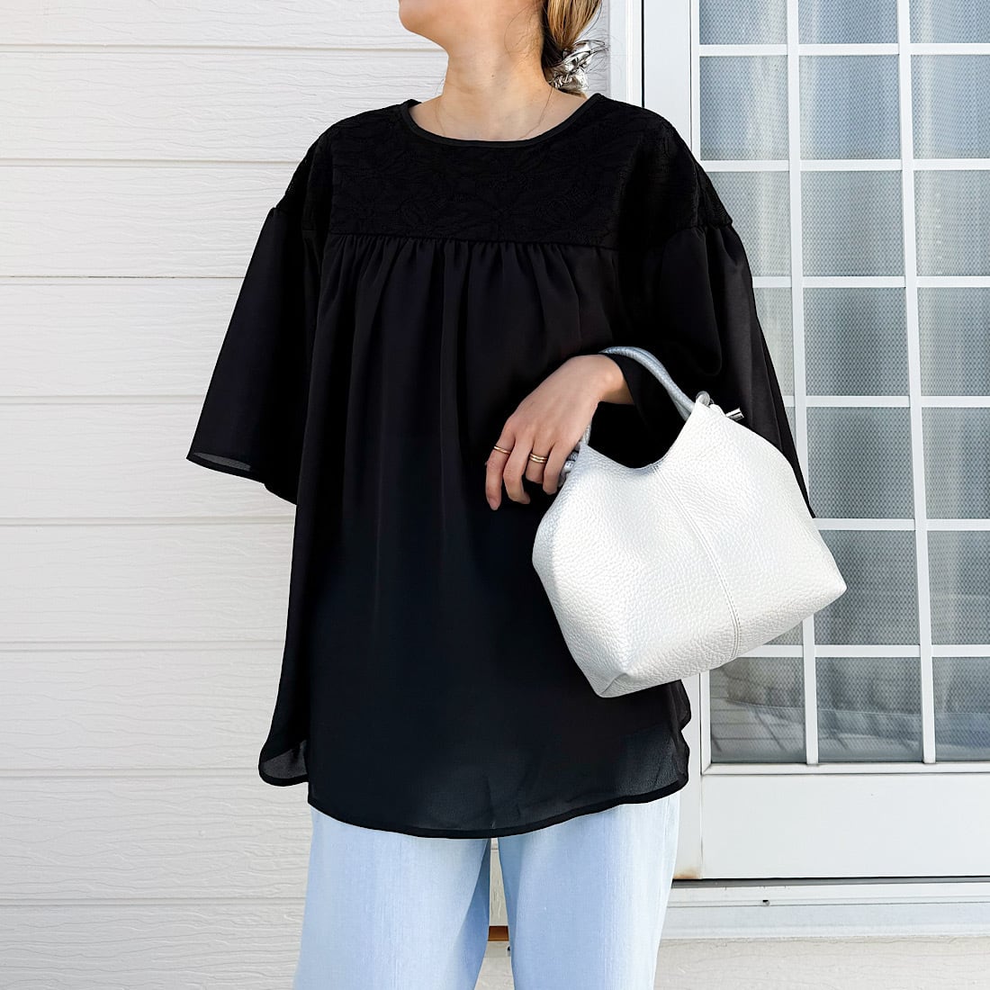 一見シンプルに見えてデコルテラインに施された繊細な花柄レースが、お顔周りをパッと明るく、華やかに彩ります。