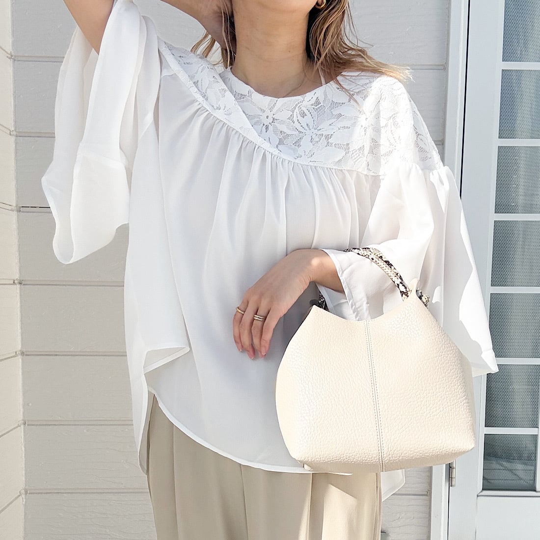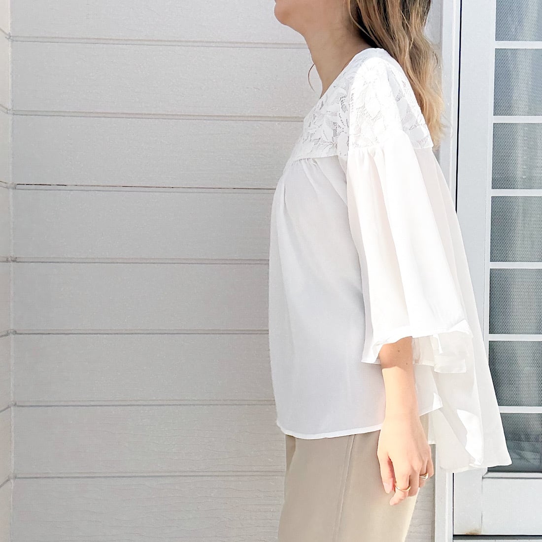 袖口にかけて広がるフレアースリーブは、手首も細く見せてくれるため、体型カバーも叶えつつ、華やかに見せたいという欲張りな願いをかなえてくれます。