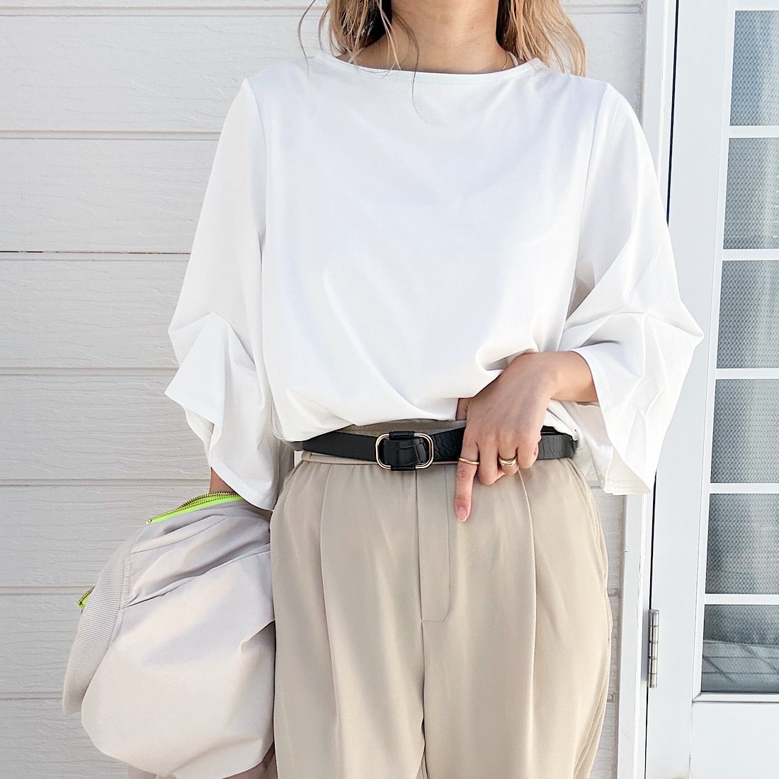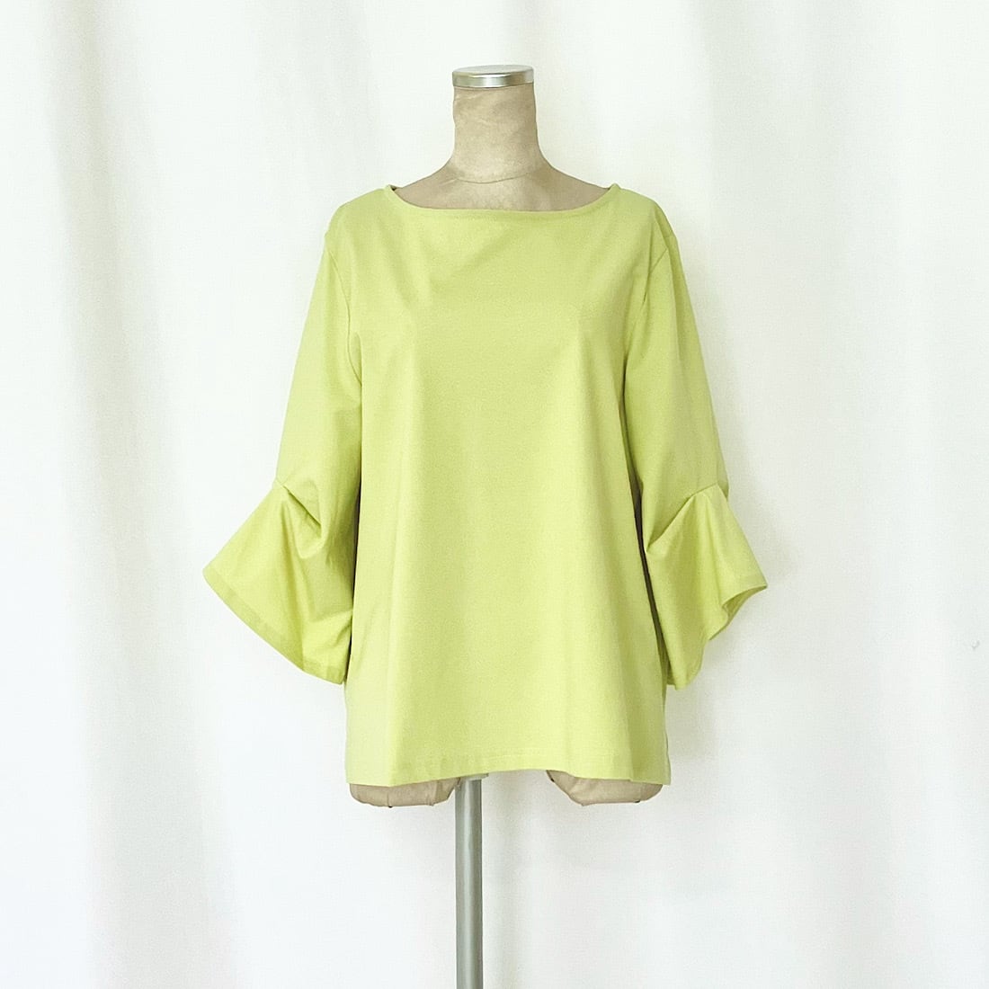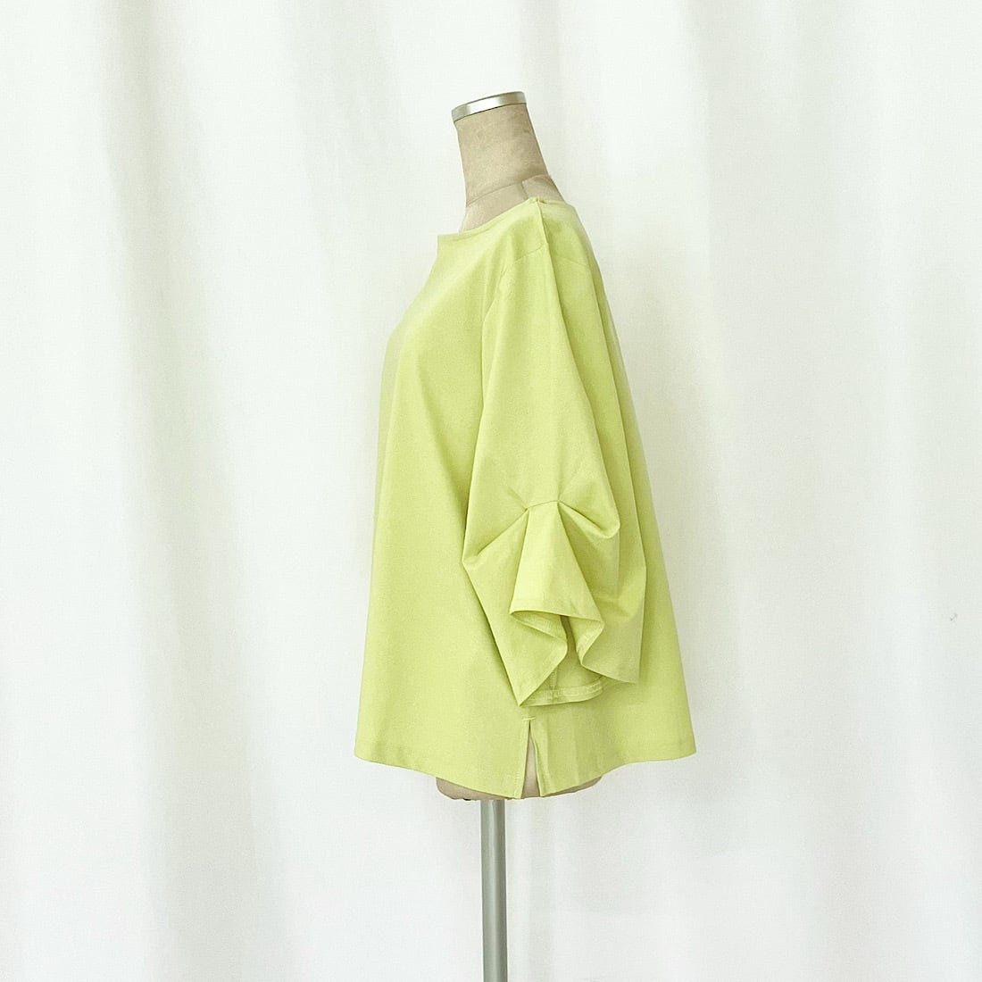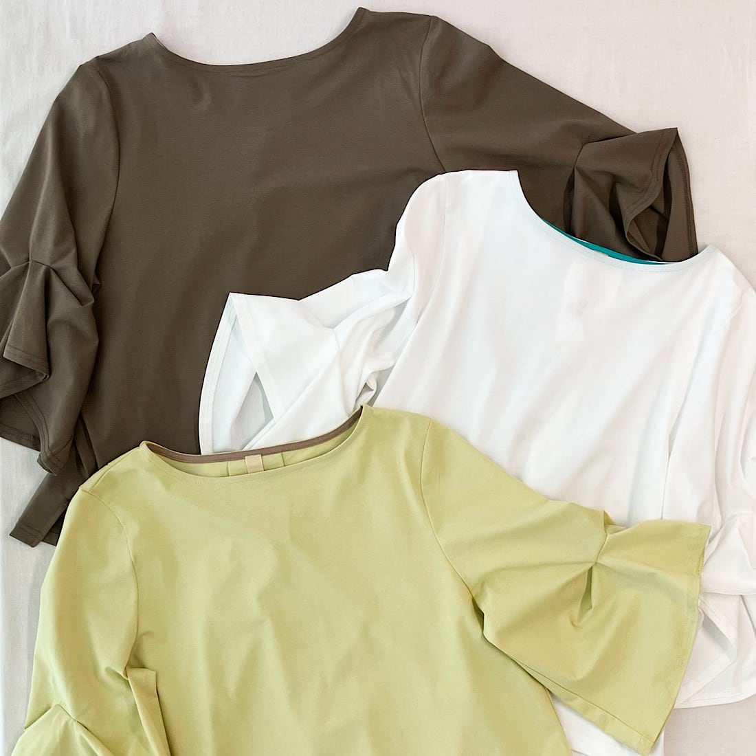 日差しが強くなってくる時期にこのトップスならお袖のボリュームデザインが風を通し、素材の冷感機能がお肌に心地よく馴染みます。