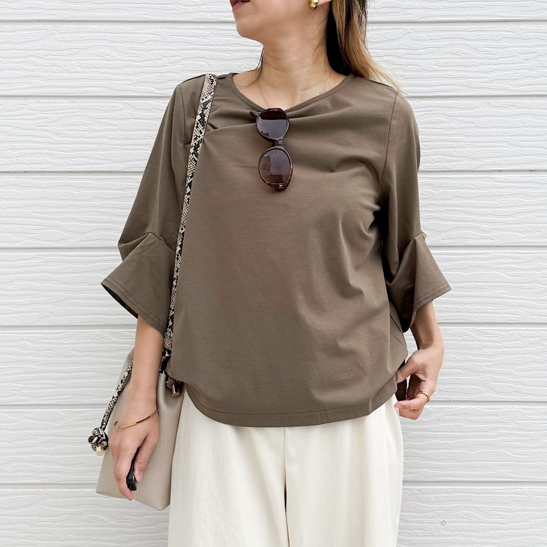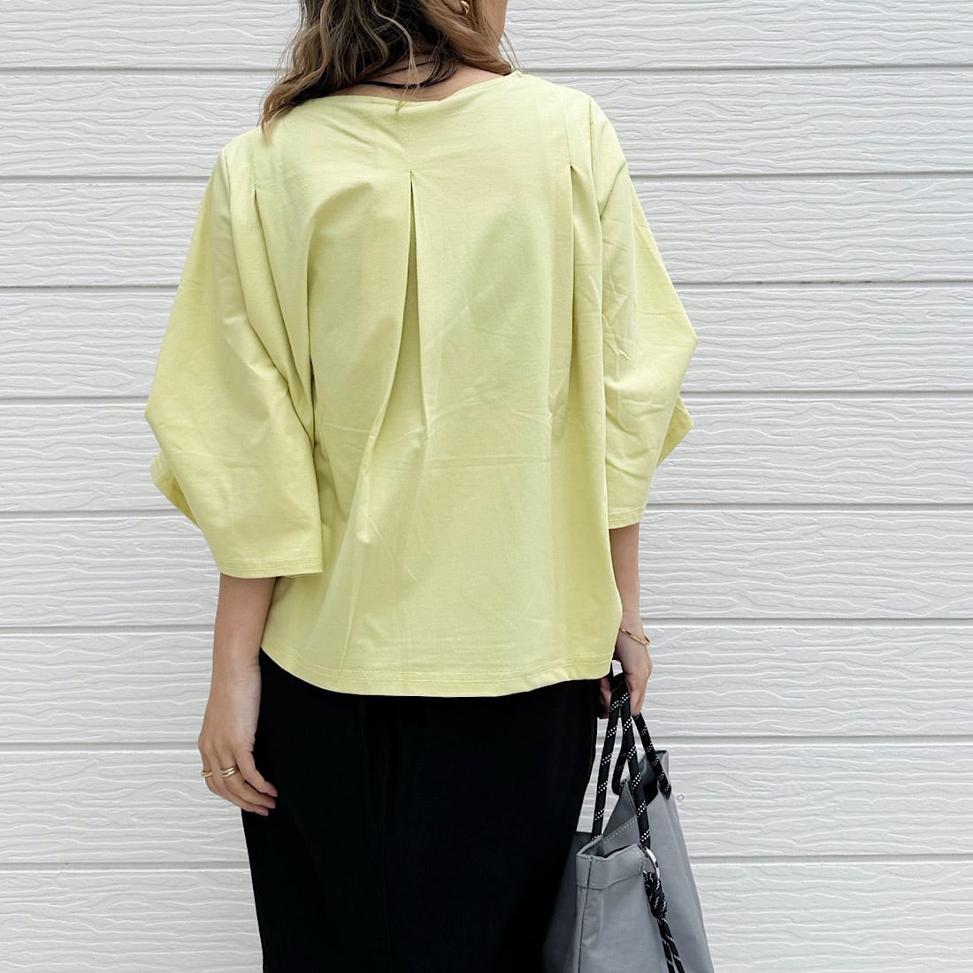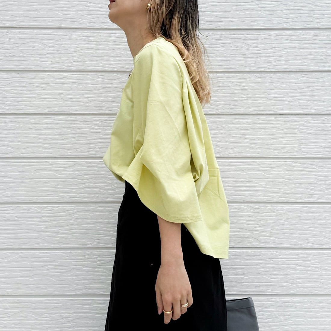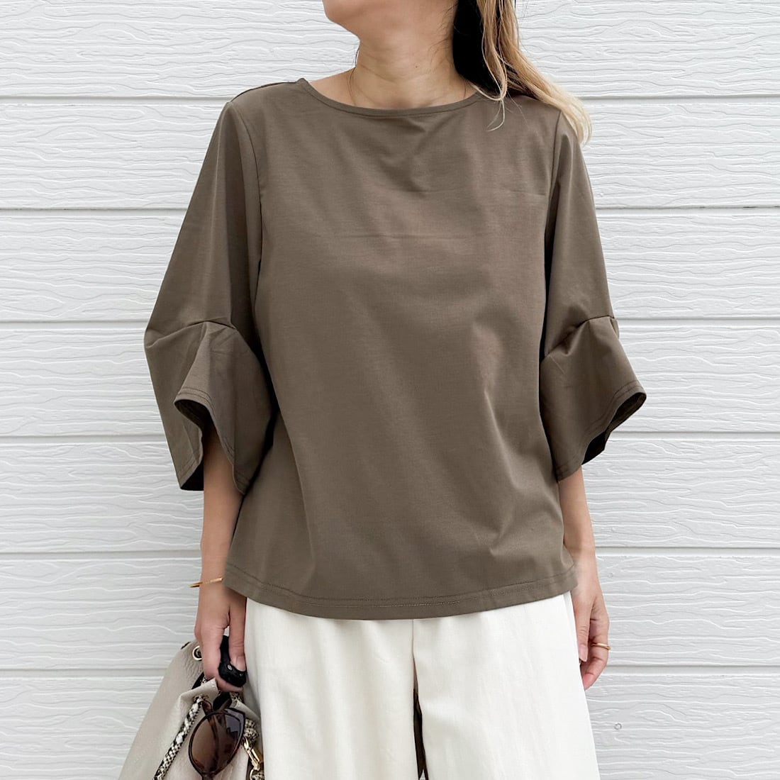 日差しが強くなってくる時期にこのトップスならお袖のボリュームデザインが風を通し、素材の冷感機能がお肌に心地よく馴染みます。