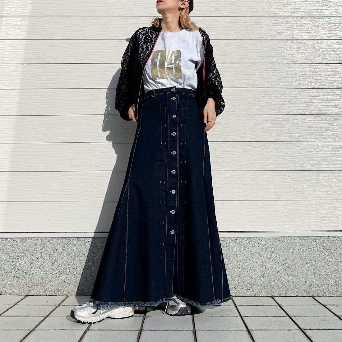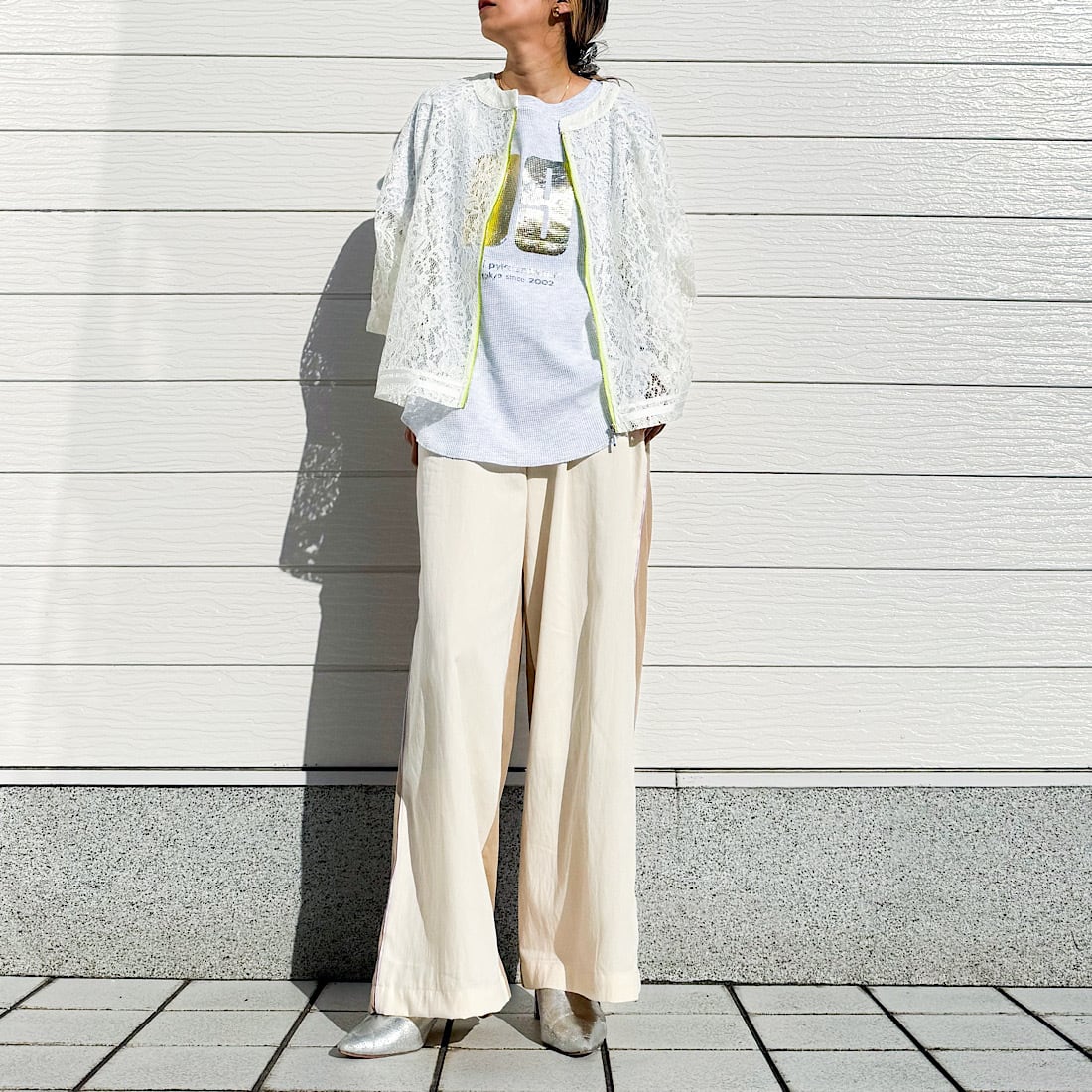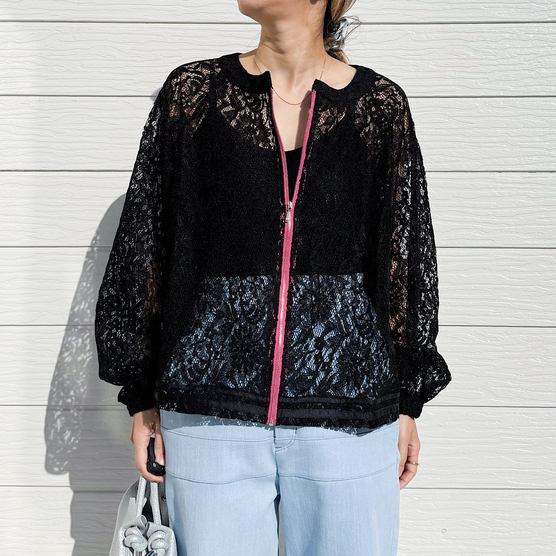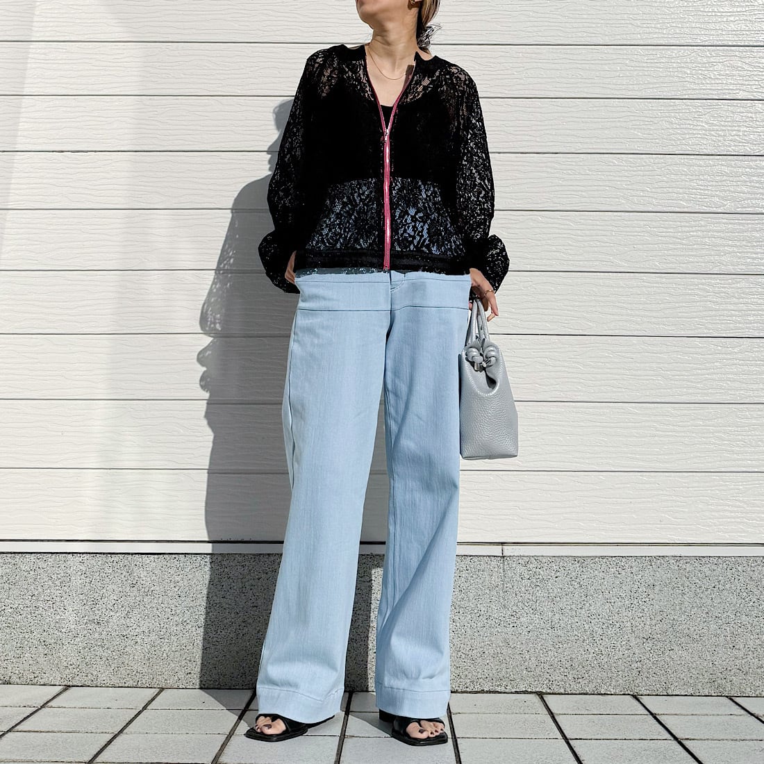 ジップアップのデザインが甘くなりすぎず甘辛ミックスな着こなしにぴったりと合い、キレイめなスカートと合わせてドレッシーに、デニムやワイドパンツと