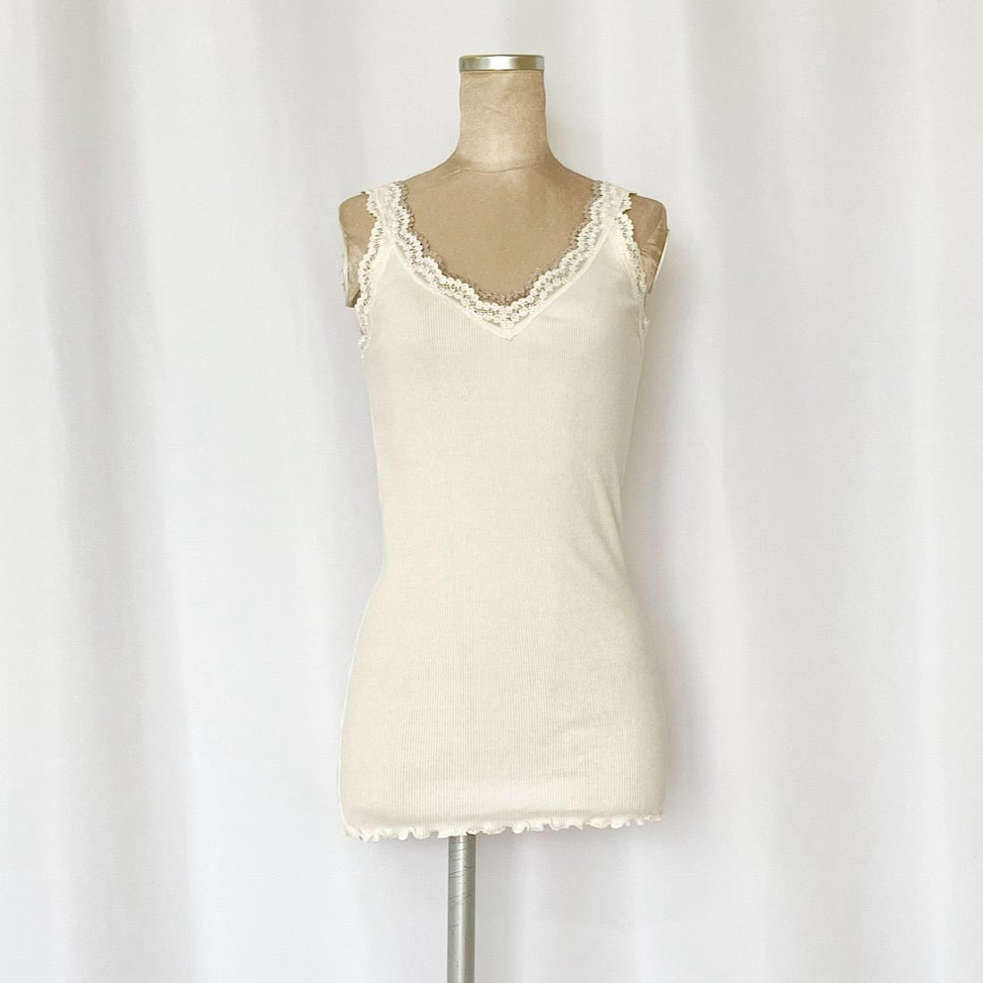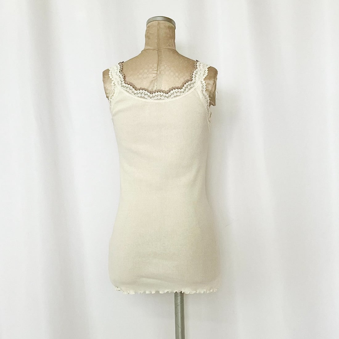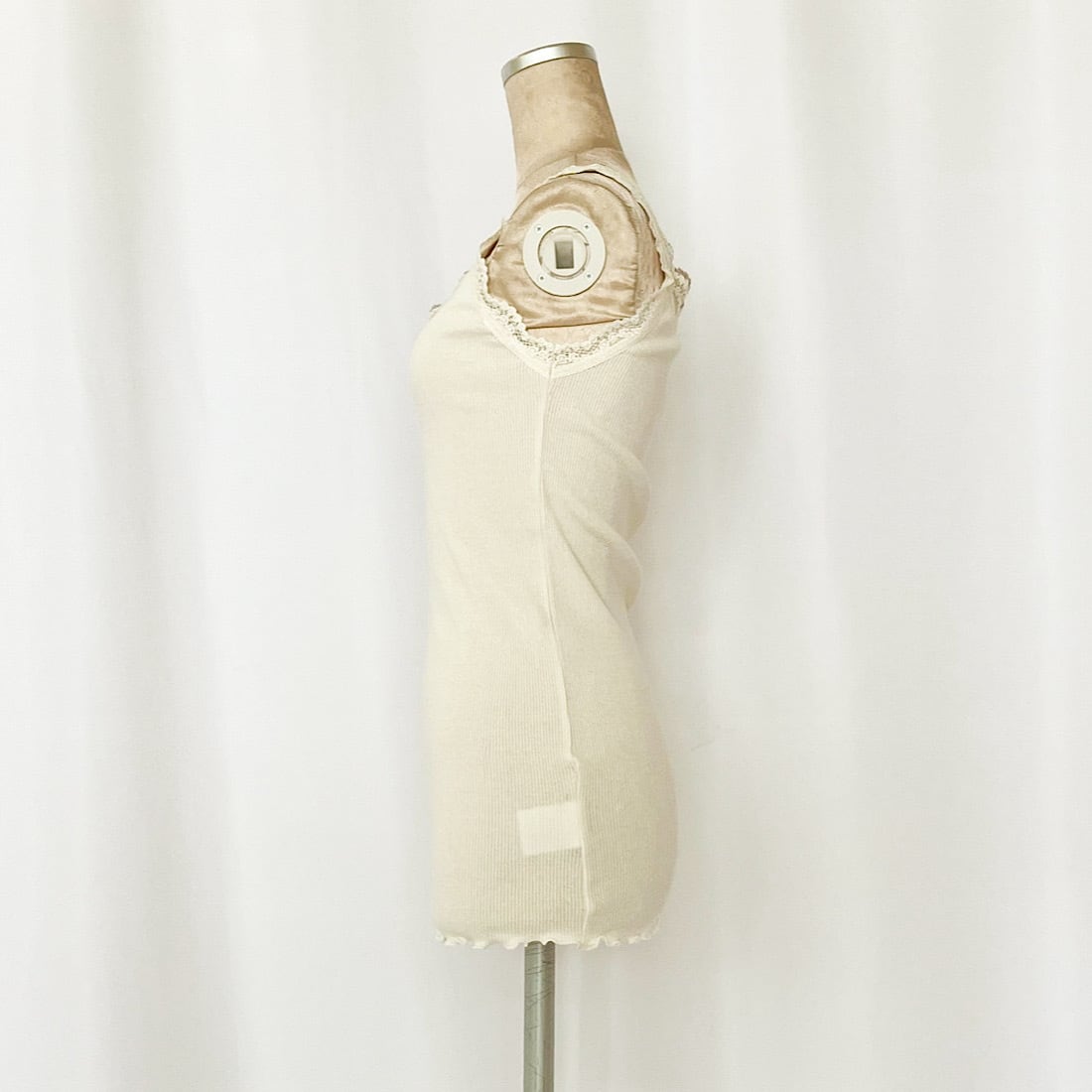 前後でV開き、U開きと違う形になっているので合わせるトップスに合わせてお好きな形で着用ください。