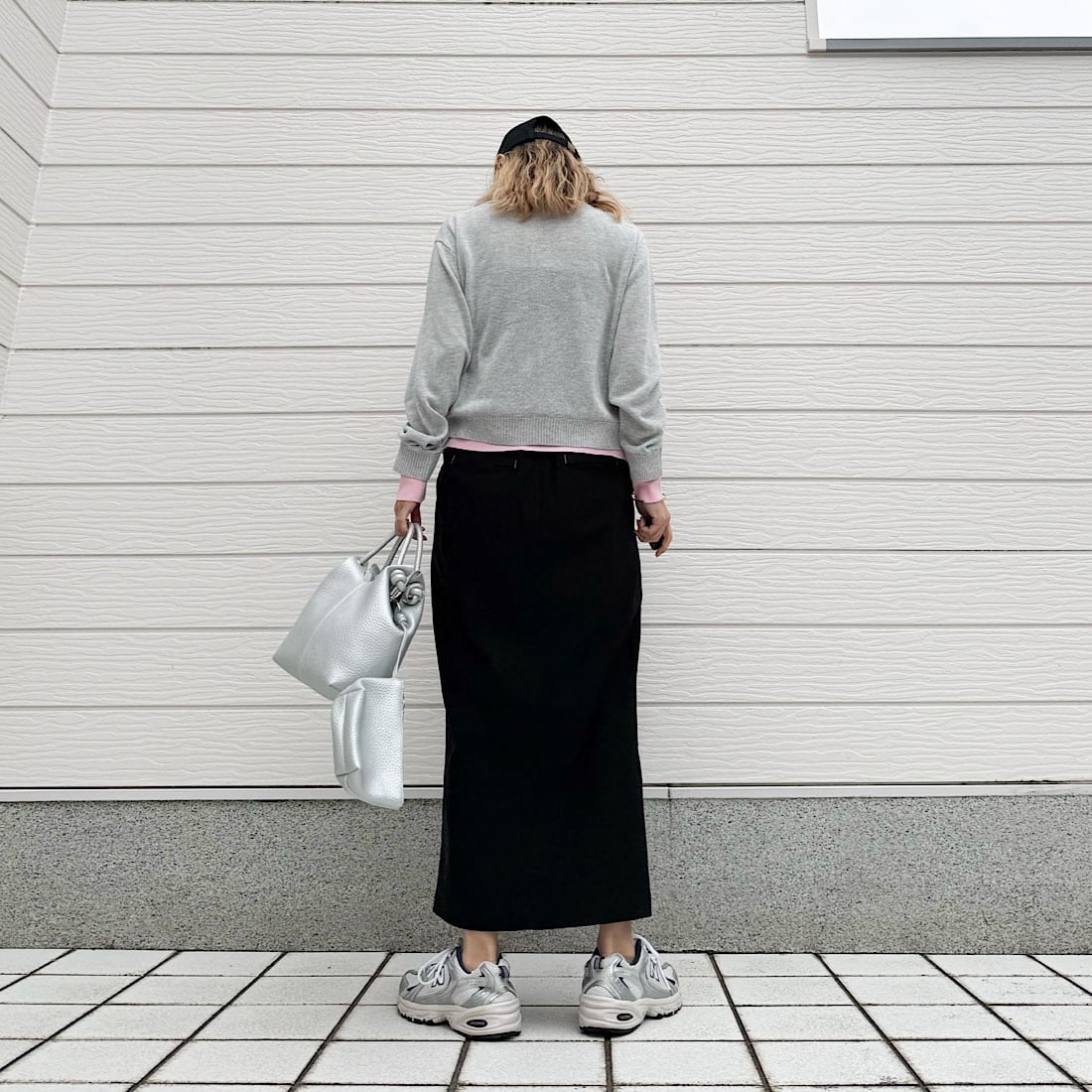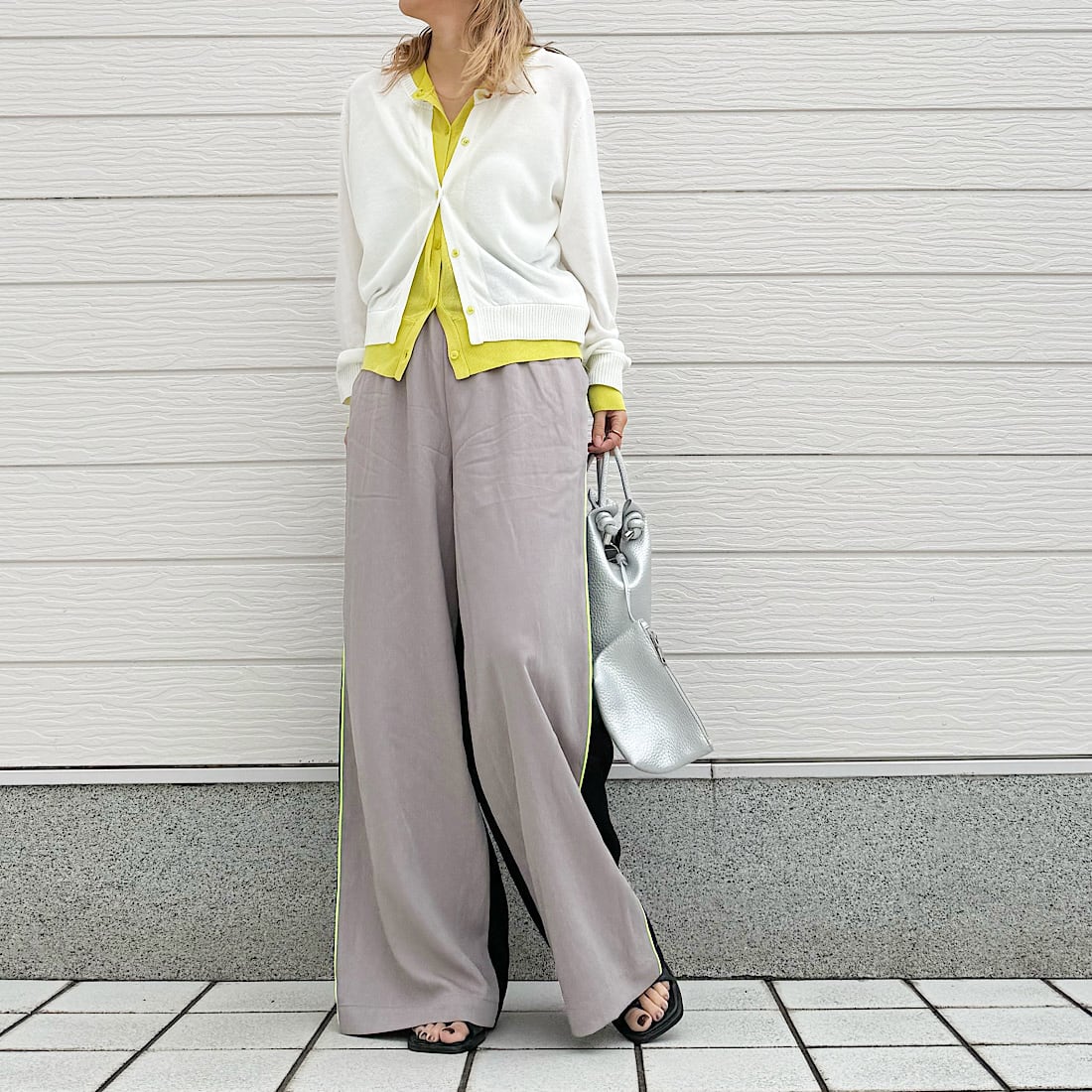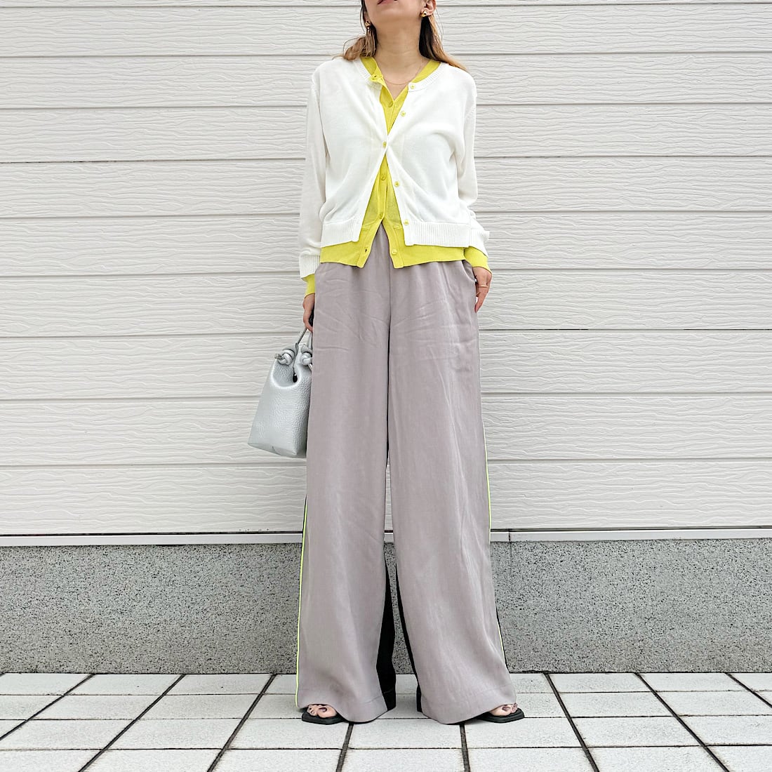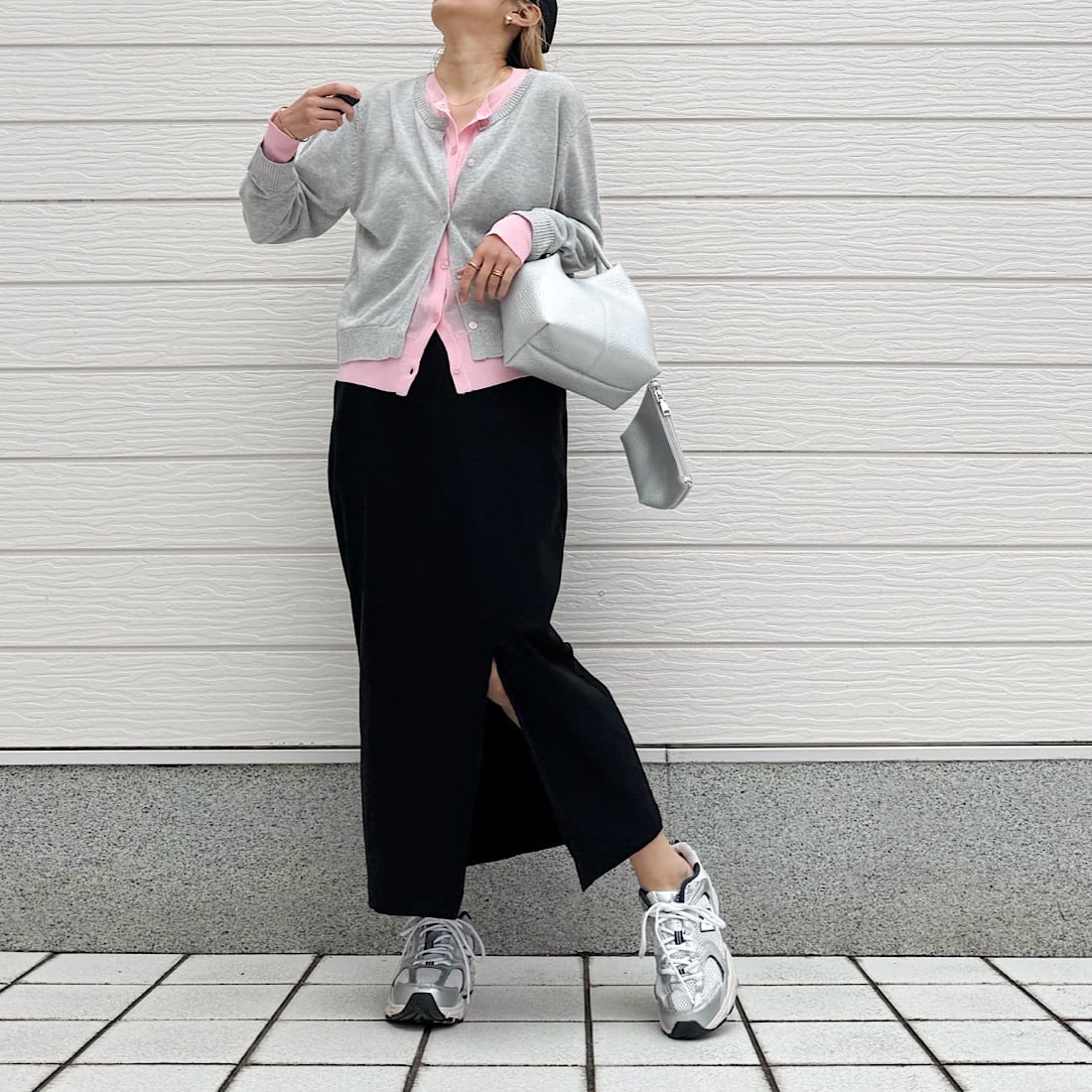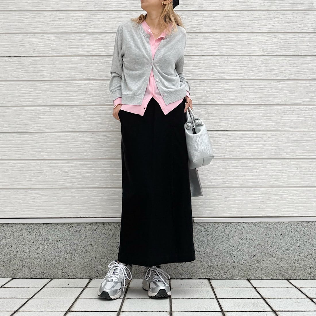 柔らかい素材感と適度なゆとりもあり、自然に体型もカバーしつつ、スッキリとした印象に。