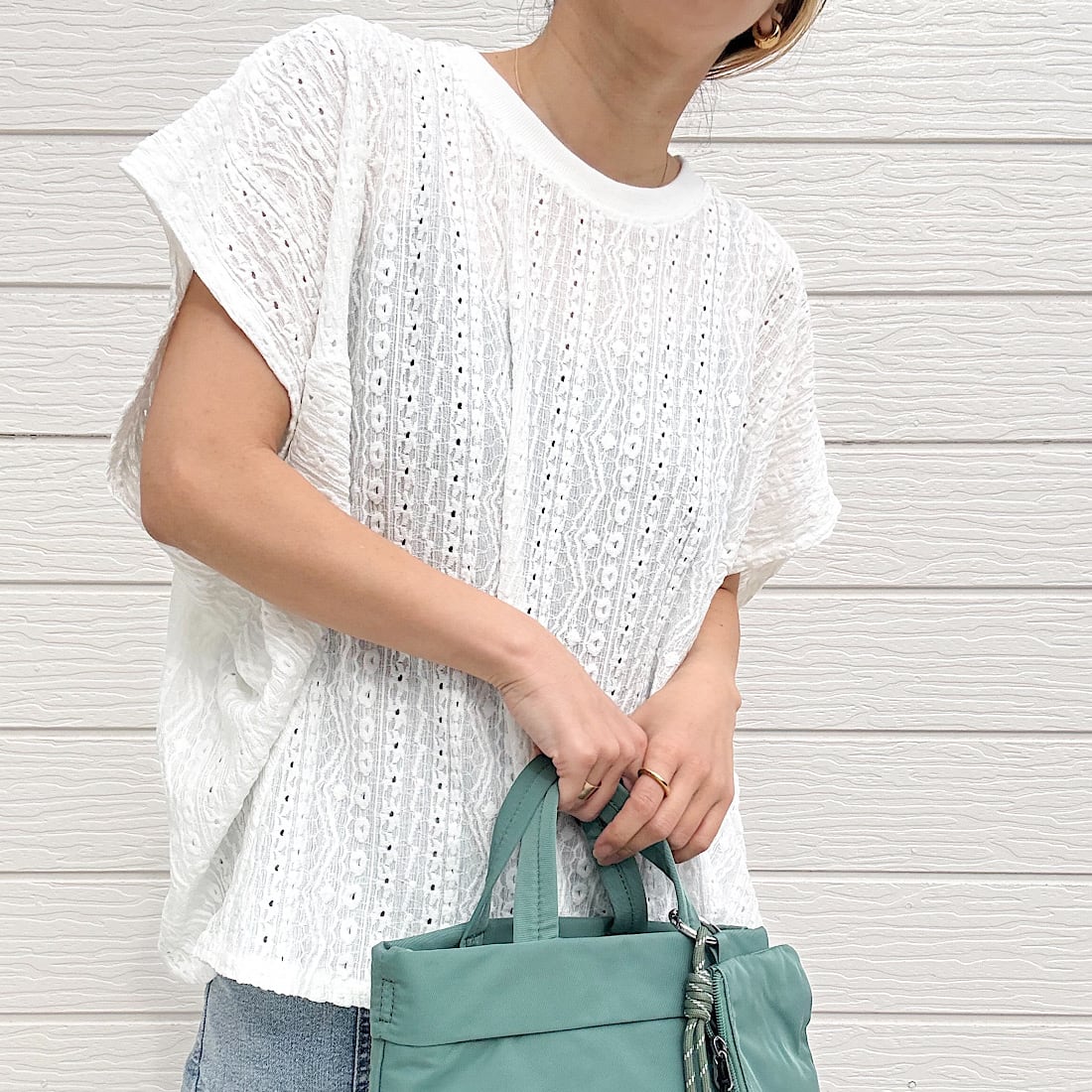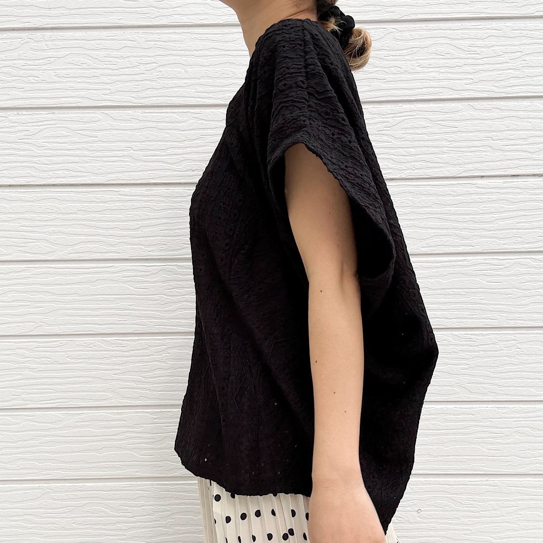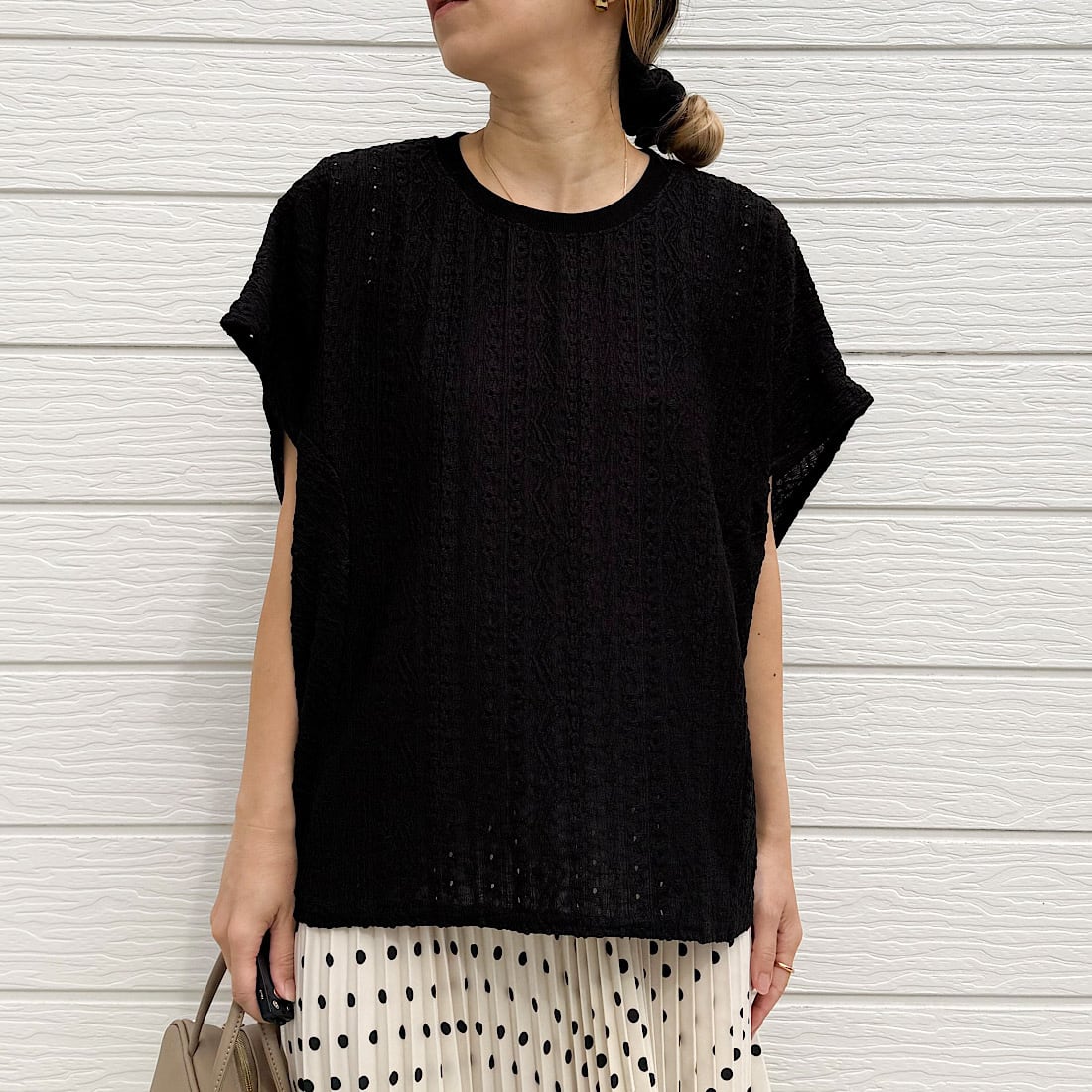 ジャガード地が目を惹き表面感のあるブラウス見えTシャツ。